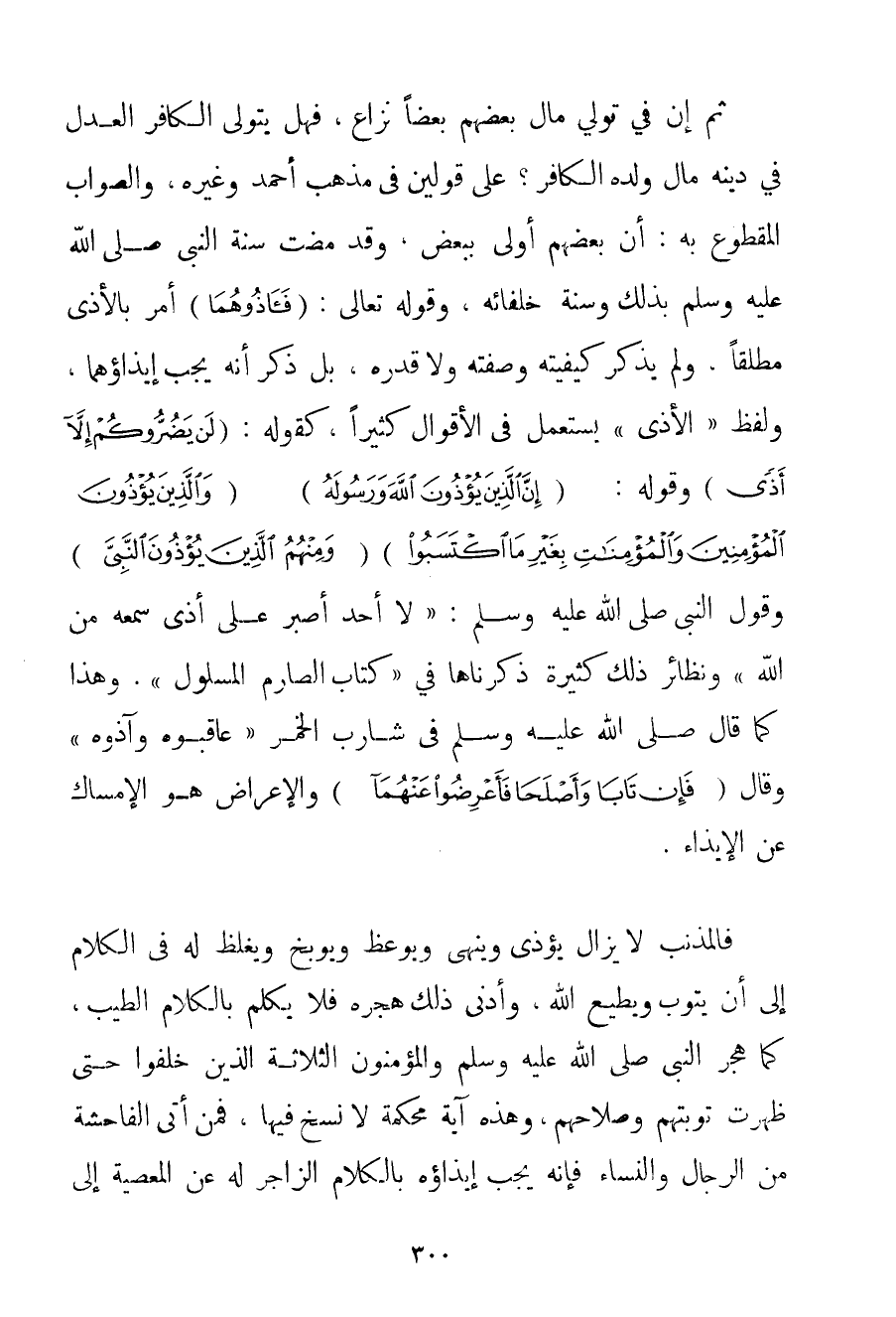 ثُمَّ إنَّ فِي تَوَلِّي مَالِ بَعْضِهِمْ بَعْضًا نِزَاعٌ فَهَلْ يَتَوَلَّى الْكَافِرُ الْعَدْلُ فِي دِينِهِ مَالَ وَلَدِهِ الْكَافِرِ؟ عَلَى قَوْلَيْنِ فِي مَذْهَبِ أَحْمَدَ وَغَيْرِهِ وَالصَّوَابُ الْمَقْطُوعُ بِهِ: أَنَّ بَعْضَهُمْ أَوْلَى بِبَعْضِ وَقَدْ مَضَتْ سُنَّةُ النَّبِيِّ صَلَّى اللَّهُ عَلَيْهِ وَسَلَّمَ بِذَلِكَ وَسُنَّةُ خُلَفَائِهِ وقَوْله تَعَالَى {فَآذُوهُمَا} أَمْرٌ بِالْأَذَى مُطْلَقًا وَلَمْ يَذْكُرْ كَيْفِيَّتَهُ وَصِفَتَهُ وَلَا قَدْرَهُ بَلْ ذَكَرَ أَنَّهُ يَجِبُ إيذَاؤُهُمَا وَلَفْظُ " الْأَذَى " يُسْتَعْمَلُ فِي الْأَقْوَالِ كَثِيرًا كَقَوْلِهِ: {لَنْ يَضُرُّوكُمْ إلَّا أَذًى} وَقَوْلِهِ: {إنَّ الَّذِينَ يُؤْذُونَ اللَّهَ وَرَسُولَهُ} {وَالَّذِينَ يُؤْذُونَ الْمُؤْمِنِينَ وَالْمُؤْمِنَاتِ بِغَيْرِ مَا اكْتَسَبُوا} {وَمِنْهُمُ الَّذِينَ يُؤْذُونَ النَّبِيَّ} وَقَوْلِ النَّبِيِّ صَلَّى اللَّهُ عَلَيْهِ وَسَلَّمَ {لَا أَحَدَ أَصْبِرُ عَلَى أَذَى سَمْعِهِ مِنْ اللَّهِ} وَنَظَائِرُ ذَلِكَ كَثِيرَةٌ ذَكَرْنَاهَا فِي " كِتَابِ الصَّارِمِ الْمَسْلُولِ ". وَهَذَا كَمَا قَالَ صَلَّى اللَّهُ عَلَيْهِ وَسَلَّمَ فِي شَارِبِ الْخَمْرِ {عَاقِبُوهُ وَآذُوهُ} وَقَالَ {فَإِنْ تَابَا وَأَصْلَحَا فَأَعْرِضُوا عَنْهُمَا} وَالْإِعْرَاضُ هُوَ الْإِمْسَاكُ عَنْ الْإِيذَاءِ. فَالْمُذْنِبُ لَا يَزَالُ يُؤْذَى وَيُنْهَى وَيُوعَظُ وَيُوَبَّخُ وَيُغَلَّظُ لَهُ فِي الْكَلَامِ إلَى أَنْ يَتُوبَ وَيُطِيعَ اللَّهَ وَأَدْنَى ذَلِكَ هَجْرُهُ فَلَا يُكَلَّمَ بِالْكَلَامِ الطَّيِّبِ كَمَا هَجَرَ النَّبِيُّ صَلَّى اللَّهُ عَلَيْهِ وَسَلَّمَ وَالْمُؤْمِنُونَ الثَّلَاثَةَ الَّذِينَ خُلِّفُوا حَتَّى ظَهَرَتْ تَوْبَتُهُمْ وَصَلَاحُهُمْ وَهَذِهِ آيَةٌ مُحْكَمَةٌ لَا نَسْخَ فِيهَا فَمَنْ أَتَى الْفَاحِشَةَ مِنْ الرِّجَالِ وَالنِّسَاءِ فَإِنَّهُ يَجِبُ إيذَاؤُهُ بِالْكَلَامِ الزَّاجِرِ لَهُ عَنْ الْمَعْصِيَةِ إلَى