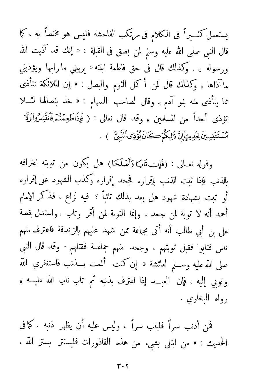 يُسْتَعْمَلُ كَثِيرًا فِي الْكَلَامِ فِي مُرْتَكِبِ الْفَاحِشَةِ فَلَيْسَ هُوَ مُخْتَصًّا بِهِ كَمَا قَالَ النَّبِيُّ صَلَّى اللَّهُ عَلَيْهِ وَسَلَّمَ لِمَنْ بَصَقَ فِي الْقِبْلَةِ: {إنَّك قَدْ آذَيْت اللَّهَ وَرَسُولَهُ} . وَكَذَلِكَ قَالَ فِي حَقِّ فَاطِمَةَ ابْنَتِهِ {يُرِيبُنِي مَا رَابَهَا وَيُؤْذِينِي مَا آذَاهَا} وَكَذَلِكَ قَالَ لِمَنْ أَكَلَ الثُّومَ وَالْبَصَلَ: {إنَّ الْمَلَائِكَةَ تَتَأَذَّى مِمَّا يَتَأَذَّى مِنْهُ بَنُو آدَمَ} وَقَالَ لِصَاحِبِ السِّهَامِ: {خُذْ بِنِصَالِهَا لِئَلَّا تُؤْذِيَ أَحَدًا مِنْ الْمُسْلِمِينَ} وَقَدْ قَالَ تَعَالَى: {فَإِذَا طَعِمْتُمْ فَانْتَشِرُوا وَلَا مُسْتَأْنِسِينَ لِحَدِيثٍ إنَّ ذَلِكُمْ كَانَ يُؤْذِي النَّبِيَّ} . وقَوْله تَعَالَى {فَإِنْ تَابَا وَأَصْلَحَا} هَلْ يَكُونُ مِنْ تَوْبَتِهِ اعْتِرَافُهُ بِالذَّنْبِ فَإِذَا ثَبَتَ الذَّنْبُ بِإِقْرَارِهِ فَجَحَدَ إقْرَارَهُ وَكَذَّبَ الشُّهُودُ عَلَى إقْرَارِهِ أَوْ ثَبَتَ بِشَهَادَةِ شُهُودٍ هَلْ يُعَدُّ بِذَلِكَ تَائِبًا؟ فِيهِ نِزَاعٌ فَذَكَرَ الْإِمَامُ أَحْمَدُ أَنَّهُ لَا تَوْبَةَ لِمَنْ جَحَدَ وَإِنَّمَا التَّوْبَةُ لِمَنْ أَقَرَّ وَتَابَ وَاسْتَدَلَّ بِقِصَّةِ عَلِيِّ بْنِ أَبِي طَالِبٍ أَنَّهُ أُتِيَ بِجَمَاعَةِ مِمَّنْ شَهِدَ عَلَيْهِمْ بِالزَّنْدَقَةِ فَاعْتَرَفَ مِنْهُمْ نَاسٌ فَتَابُوا فَقَبِلَ تَوْبَتَهُمْ وَجَحَدَ مِنْهُمْ جَمَاعَةٌ فَقَتَلَهُمْ وَقَدْ {قَالَ النَّبِيُّ صَلَّى اللَّهُ عَلَيْهِ وَسَلَّمَ لِعَائِشَةَ إنْ كُنْت أَلْمَمْت بِذَنْبِ فَاسْتَغْفِرِي اللَّهَ وَتُوبِي إلَيْهِ فَإِنَّ الْعَبْدَ إذَا اعْتَرَفَ بِذَنْبِهِ ثُمَّ تَابَ تَابَ اللَّهُ عَلَيْهِ} رَوَاهُ الْبُخَارِيُّ. فَمَنْ أَذْنَبَ سِرًّا فَلْيَتُبْ سِرًّا وَلَيْسَ عَلَيْهِ أَنْ يُظْهِرَ ذَنْبَهُ كَمَا فِي الْحَدِيثِ: {مَنْ اُبْتُلِيَ بِشَيْءِ مِنْ هَذِهِ الْقَاذُورَاتِ فَلْيَسْتَتِرْ بِسِتْرِ اللَّهِ