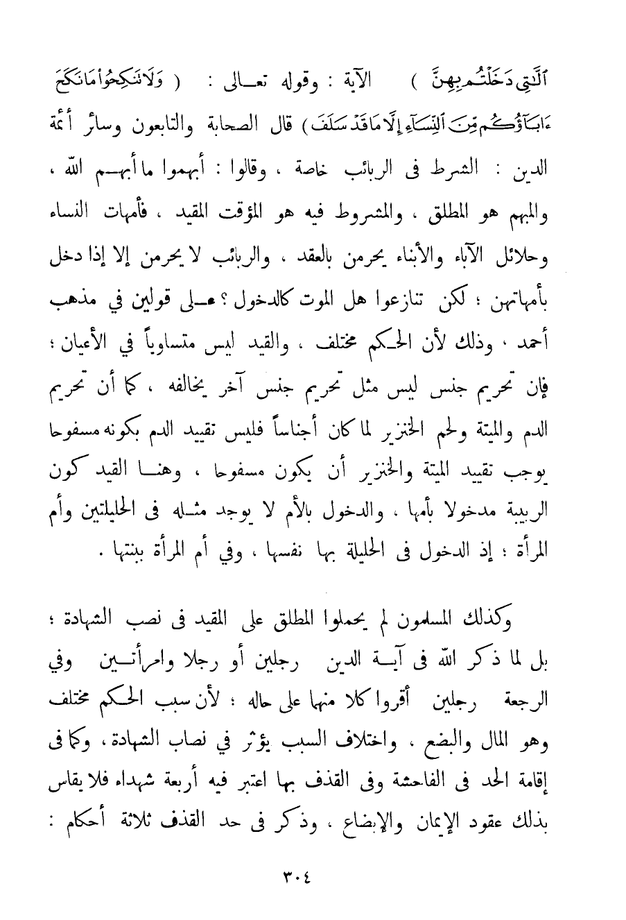 اللَّاتِي دَخَلْتُمْ بِهِنَّ} الْآيَةُ: وقَوْله تَعَالَى {وَلَا تَنْكِحُوا مَا نَكَحَ آبَاؤُكُمْ مِنَ النِّسَاءِ إلَّا مَا قَدْ سَلَفَ} قَالَ الصَّحَابَةُ وَالتَّابِعُونَ وَسَائِرُ أَئِمَّةِ الدِّينِ: الشَّرْطُ فِي الرَّبَائِبِ خَاصَّةً وَقَالُوا: أَبْهَمُوا مَا أَبْهَمَ اللَّهُ وَالْمُبْهَمُ هُوَ الْمُطْلَقُ وَالْمَشْرُوطُ فِيهِ هُوَ الْمُؤَقَّتُ الْمُقَيَّدُ فَأُمَّهَاتُ النِّسَاءِ وَحَلَائِلُ الْآبَاءِ وَالْأَبْنَاءِ يَحْرُمْنَ بِالْعَقْدِ وَالرَّبَائِبُ لَا يَحْرُمْنَ إلَّا إذَا دُخِلَ بِأُمَّهَاتِهِنَّ؛ لَكِنْ تَنَازَعُوا هَلْ الْمَوْتُ كَالدُّخُولِ؟ عَلَى قَوْلَيْنِ فِي مَذْهَبِ أَحْمَدَ وَذَلِكَ لِأَنَّ الْحُكْمَ مُخْتَلِفٌ وَالْقَيْدُ لَيْسَ مُتَسَاوِيًا فِي الْأَعْيَانِ؛ فَإِنَّ تَحْرِيمَ جِنْسٍ لَيْسَ مِثْلَ تَحْرِيمِ جِنْسٍ آخَرَ يُخَالِفُهُ كَمَا أَنَّ تَحْرِيمَ الدَّمِ وَالْمِيتَةِ وَلَحْمِ الْخِنْزِيرِ لَمَّا كَانَ أَجْنَاسًا فَلَيْسَ تَقْيِيدُ الدَّمِ بِكَوْنِهِ مَسْفُوحًا يُوجِبُ تَقْيِيدَ الْمَيْتَةِ وَالْخِنْزِيرِ أَنْ يَكُونَ مَسْفُوحًا وَهُنَا الْقَيْدُ كَوْنُ الرَّبِيبَةِ مَدْخُولًا بِأُمِّهَا وَالدُّخُولُ بِالْأُمِّ لَا يُوجَدُ مِثْلُهُ فِي الْحَلِيلَتَيْنِ وَأُمِّ الْمَرْأَةِ؛ إذْ الدُّخُولُ فِي الْحَلِيلَةِ بِهَا نَفْسِهَا وَفِي أُمِّ الْمَرْأَةِ بِبِنْتِهَا. وَكَذَلِكَ الْمُسْلِمُونَ لَمْ يَحْمِلُوا الْمُطْلَقَ عَلَى الْمُقَيَّدِ فِي نَصْبِ الشَّهَادَةِ؛ بَلْ لَمَّا ذَكَرَ اللَّهُ فِي آيَةِ الدَّيْنِ رَجُلَيْنِ أَوْ رَجُلًا وامرأتين وَفِي الرَّجْعَةِ رَجُلَيْنِ أَقَرُّوا كُلًّا مِنْهُمَا عَلَى حَالِهِ؛ لِأَنَّ سَبَبَ الْحُكْمِ مُخْتَلِفٌ وَهُوَ الْمَالُ وَالْبُضْعُ وَاخْتِلَافُ السَّبَبِ يُؤَثِّرُ فِي نِصَابِ الشَّهَادَةِ وَكَمَا فِي إقَامَةِ الْحَدِّ فِي الْفَاحِشَةِ وَفِي الْقَذْفِ بِهَا اُعْتُبِرَ فِيهِ أَرْبَعَةُ شُهَدَاءَ فَلَا يُقَاسُ بِذَلِكَ عُقُودُ الْأَيْمَانِ وَالْأَبْضَاعِ وَذَكَرَ فِي حَدِّ الْقَذْفِ ثَلَاثَةَ أَحْكَامٍ: