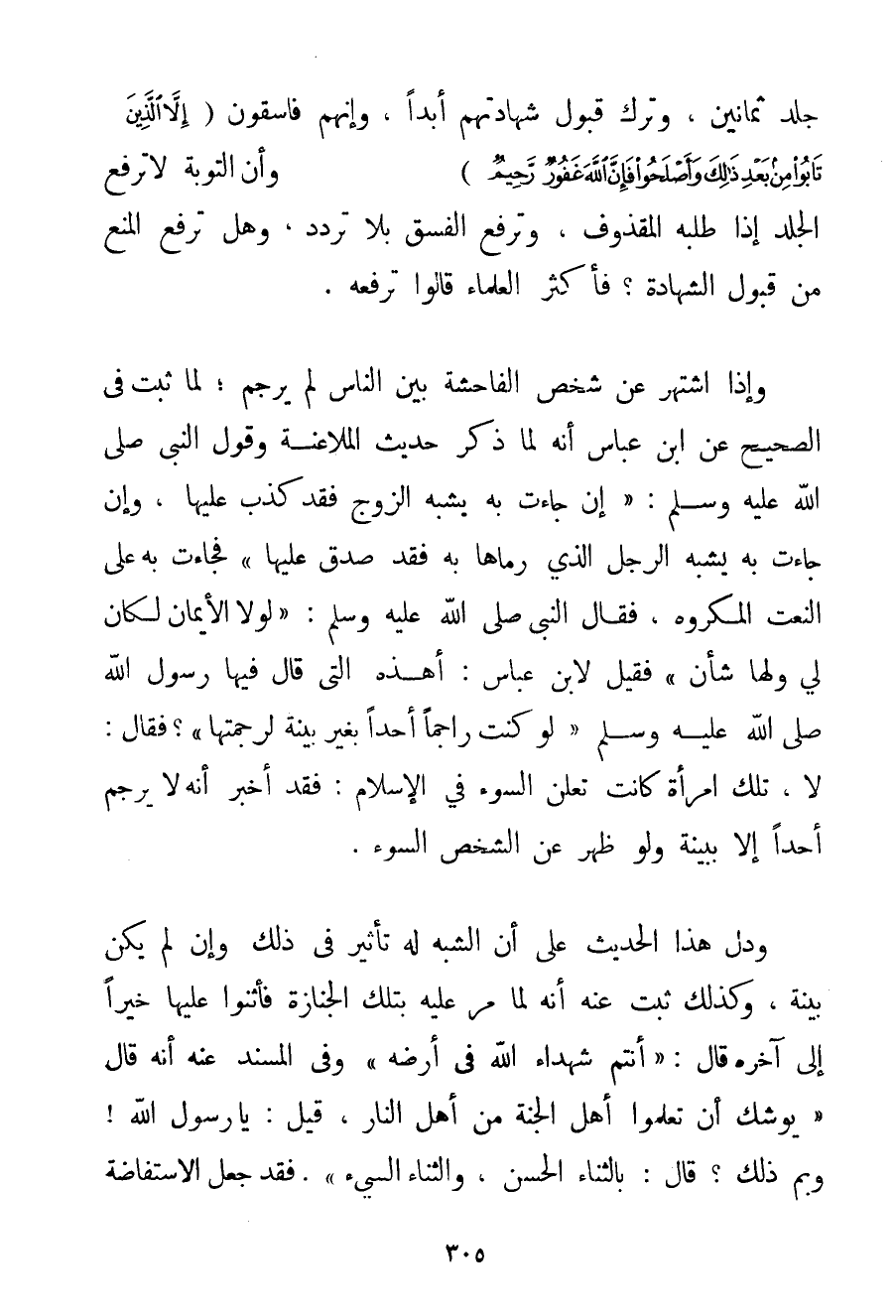 وَإِذَا اُشْتُهِرَ عَنْ شَخْصٍ الْفَاحِشَةُ بَيْنَ النَّاسِ لَمْ يُرْجَمْ؛ لِمَا ثَبَتَ فِي الصَّحِيحِ عَنْ ابْنِ عَبَّاسٍ أَنَّهُ لَمَّا ذَكَرَ حَدِيثَ الْمُلَاعَنَةِ وَقَوْلَ النَّبِيِّ صَلَّى اللَّهُ عَلَيْهِ وَسَلَّمَ {إنْ جَاءَتْ بِهِ يُشْبِهُ الزَّوْجَ فَقَدْ كَذَبَ عَلَيْهَا وَإِنْ جَاءَتْ بِهِ يُشْبِهُ الرَّجُلَ الَّذِي رَمَاهَا بِهِ فَقَدْ صَدَقَ عَلَيْهَا} فَجَاءَتْ بِهِ عَلَى النَّعْتِ الْمَكْرُوهِ فَقَالَ النَّبِيُّ صَلَّى اللَّهُ عَلَيْهِ وَسَلَّمَ {لَوْلَا الْأَيْمَانُ لَكَانَ لِي وَلَهَا شَأْنٌ} فَقِيلَ لِابْنِ عَبَّاسٍ: أَهَذِهِ الَّتِي قَالَ فِيهَا رَسُولُ اللَّهِ صَلَّى اللَّهُ عَلَيْهِ وَسَلَّمَ {لَوْ كُنْت رَاجِمًا أَحَدًا بِغَيْرِ بَيِّنَةٍ لَرَجَمْتهَا} ؟ فَقَالَ: لَا تِلْكَ امْرَأَةٌ كَانَتْ تُعْلِنُ السُّوءَ فِي الْإِسْلَامِ: فَقَدْ أَخْبَرَ أَنَّهُ لَا يَرْجُمُ أَحَدًا إلَّا بِبَيِّنَةٍ وَلَوْ ظَهَرَ عَنْ الشَّخْصِ السُّوءُ. وَدَلَّ هَذَا الْحَدِيثُ عَلَى أَنَّ الشَّبَهَ لَهُ تَأْثِيرٌ فِي ذَلِكَ وَإِنْ لَمْ يَكُنْ بَيِّنَةٌ وَكَذَلِكَ ثَبَتَ عَنْهُ أَنَّهُ لَمَّا مَرَّ عَلَيْهِ بِتِلْكَ الْجِنَازَةِ فَأَثْنَوْا عَلَيْهَا خَيْرًا إلَى آخِرِهِ قَالَ: {أَنْتُمْ شُهَدَاءُ اللَّهِ فِي أَرْضِهِ} وَفِي الْمُسْنَدِ عَنْهُ أَنَّهُ قَالَ {يُوشِكُ أَنْ تَعْلَمُوا أَهْلَ الْجَنَّةِ مِنْ أَهْلِ النَّارِ قِيلَ: يَا رَسُولَ اللَّهِ وَبِمَ ذَلِكَ؟ قَالَ: بِالثَّنَاءِ الْحَسَنِ وَالثَّنَاءِ السَّيِّئِ} . فَقَدْ جَعَلَ الِاسْتِفَاضَةَ