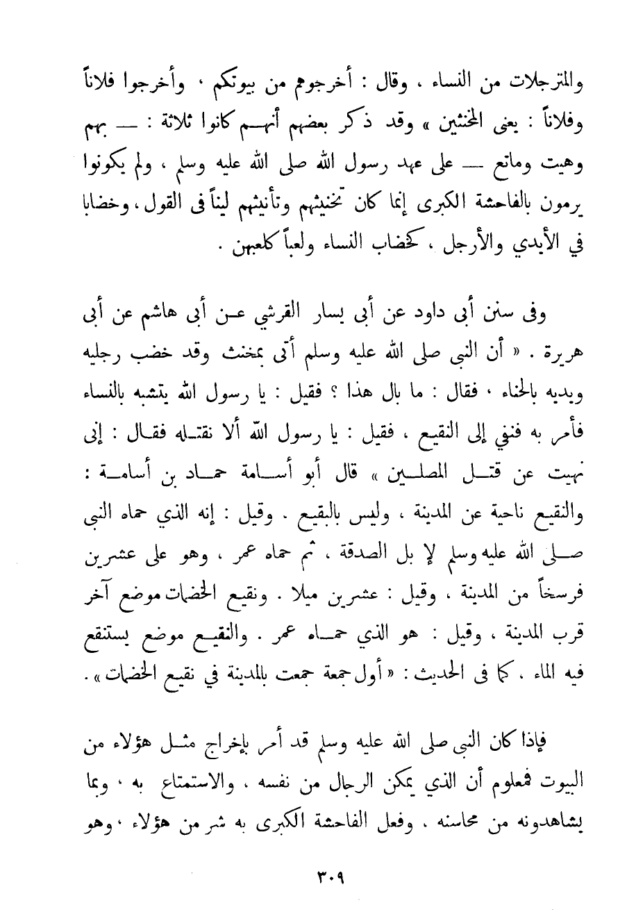 والمترجلات مِنْ النِّسَاءِ وَقَالَ: أَخْرِجُوهُمْ مِنْ بُيُوتِكُمْ وَأَخْرِجُوا فُلَانًا وَفُلَانًا: يَعْنِي الْمُخَنَّثِينَ} وَقَدْ ذَكَرَ بَعْضُهُمْ أَنَّهُمْ كَانُوا ثَلَاثَةً: - بَهْمٌ وَهيْتُ وَمَاتِعٌ - عَلَى عَهْدِ رَسُولِ اللَّهِ صَلَّى اللَّهُ عَلَيْهِ وَسَلَّمَ وَلَمْ يَكُونُوا يُرْمَوْنَ بِالْفَاحِشَةِ الْكُبْرَى إنَّمَا كَانَ تَخْنِيثُهُمْ وَتَأْنِيثُهُمْ لِينًا فِي الْقَوْلِ وَخِضَابًا فِي الْأَيْدِي وَالْأَرْجُلِ كَخِضَابِ النِّسَاءِ وَلَعِبًا كَلَعِبِهِنَّ. وَفِي سُنَنِ أَبِي دَاوُد عَنْ أَبِي يَسَارٍ الْقُرَشِيِّ عَنْ أَبِي هَاشِمٍ عَنْ أَبِي هُرَيْرَةَ. {أَنَّ النَّبِيَّ صَلَّى اللَّهُ عَلَيْهِ وَسَلَّمَ أُتِيَ بِمُخَنَّثِ وَقَدْ خَضَّبَ رِجْلَيْهِ وَيَدَيْهِ بِالْحِنَّاءِ فَقَالَ: مَا بَالُ هَذَا؟ فَقِيلَ: يَا رَسُولَ اللَّهِ يَتَشَبَّهُ بِالنِّسَاءِ فَأَمَرَ بِهِ فَنُفِيَ إلَى النَّقِيعِ فَقِيلَ: يَا رَسُولَ اللَّهِ أَلَا نَقْتُلُهُ فَقَالَ: إنِّي نُهِيت عَنْ قَتْلِ الْمُصَلِّينَ} قَالَ أَبُو أُسَامَةَ حَمَّادُ بْنُ أُسَامَةَ: وَالنَّقِيعُ نَاحِيَةٌ عَنْ الْمَدِينَةِ وَلَيْسَ بِالْبَقِيعِ وَقِيلَ: إنَّهُ الَّذِي حَمَاهُ النَّبِيُّ صَلَّى اللَّهُ عَلَيْهِ وَسَلَّمَ لِإِبِلِ الصَّدَقَةِ ثُمَّ حَمَاهُ عُمَرُ وَهُوَ عَلَى عِشْرِينَ فَرْسَخًا مِنْ الْمَدِينَةِ وَقِيلَ: عِشْرِينَ مِيلًا. وَنَقِيعُ الْخُضُمَّاتِ مَوْضِعٌ آخَرُ قُرْبَ الْمَدِينَةِ وَقِيلَ: هُوَ الَّذِي حَمَاهُ عُمَرُ. وَالنَّقِيعُ مَوْضِعٌ يَسْتَنْقِعُ فِيهِ الْمَاءُ كَمَا فِي الْحَدِيثِ: {أَوَّلُ جُمْعَةٍ جُمِعَتْ بِالْمَدِينَةِ فِي نَقِيعِ الْخُضُمَّاتِ} . فَإِذَا كَانَ النَّبِيُّ صَلَّى اللَّهُ عَلَيْهِ وَسَلَّمَ قَدْ أَمَرَ بِإِخْرَاجِ مِثْلِ هَؤُلَاءِ مِنْ الْبُيُوتِ فَمَعْلُومٌ أَنَّ الَّذِي يُمَكِّنُ الرِّجَالَ مِنْ نَفْسِهِ وَالِاسْتِمْتَاعِ بِهِ وَبِمَا يُشَاهِدُونَهُ مِنْ مَحَاسِنِهِ وَفِعْلِ الْفَاحِشَةِ الْكُبْرَى بِهِ شَرٌّ مِنْ هَؤُلَاءِ وَهُوَ