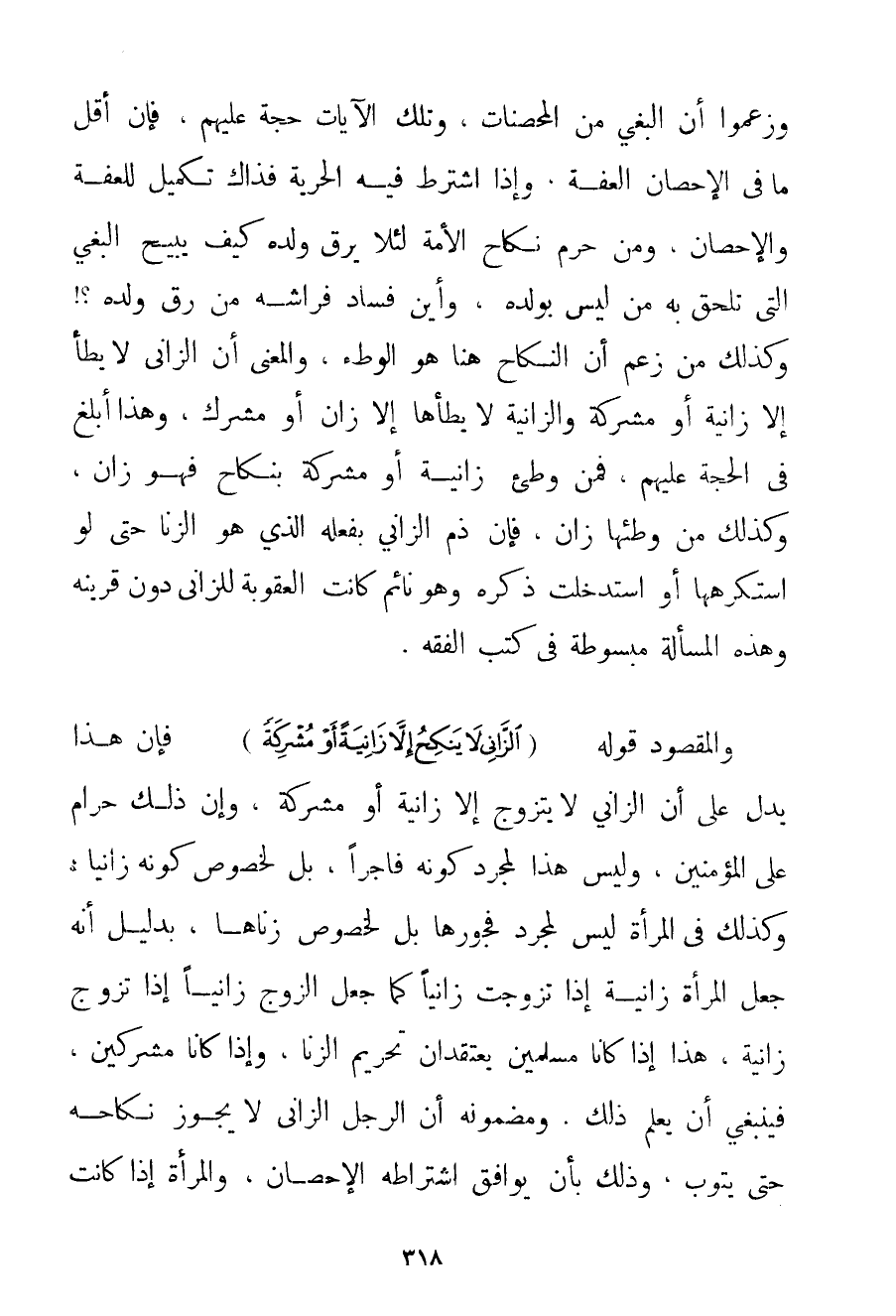وَزَعَمُوا أَنَّ الْبَغْيَ مِنْ الْمُحْصَنَاتِ وَتِلْكَ الْآيَاتُ حُجَّةٌ عَلَيْهِمْ فَإِنَّ أَقَلَّ مَا فِي الْإِحْصَانِ الْعِفَّةُ وَإِذَا اُشْتُرِطَ فِيهِ الْحُرِّيَّةُ فَذَاكَ تَكْمِيلٌ لِلْعِفَّةِ وَالْإِحْصَانِ وَمَنْ حَرَّمَ نِكَاحَ الْأَمَةِ لِئَلَّا يُرِقَّ وَلَدَهُ كَيْفَ يُبِيحُ الْبَغِيَّ الَّتِي تُلْحِقُ بِهِ مَنْ لَيْسَ بِوَلَدِهِ وَأَيْنَ فَسَادُ فِرَاشِهِ مِنْ رِقِّ وَلَدِهِ وَكَذَلِكَ مَنْ زَعَمَ أَنَّ النِّكَاحَ هُنَا هُوَ الْوَطْءُ وَالْمَعْنَى أَنَّ الزَّانِيَ لَا يَطَأُ إلَّا زَانِيَةً أَوْ مُشْرِكَةً وَالزَّانِيَةُ لَا يَطَؤُهَا إلَّا زَانٍ أَوْ مُشْرِكٌ وَهَذَا أَبْلَغُ فِي الْحُجَّةِ عَلَيْهِمْ فَمَنْ وَطِئَ زَانِيَةً أَوْ مُشْرِكَةً بِنِكَاحِ فَهُوَ زَانٍ وَكَذَلِكَ مَنْ وَطِئَهَا زَانٍ فَإِنَّ ذَمَّ الزَّانِي بِفِعْلِهِ الَّذِي هُوَ الزِّنَا حَتَّى لَوْ اسْتَكْرَهَهَا أَوْ استدخلت ذَكَرَهُ وَهُوَ نَائِمٌ كَانَتْ الْعُقُوبَةُ لِلزَّانِي دُونَ قَرِينِهِ وَهَذِهِ الْمَسْأَلَةُ مَبْسُوطَةٌ فِي كُتُبِ الْفِقْهِ. وَالْمَقْصُودُ قَوْلُهُ {الزَّانِي لَا يَنْكِحُ إلَّا زَانِيَةً أَوْ مُشْرِكَةً} فَإِنَّ هَذَا يَدُلُّ عَلَى أَنَّ الزَّانِيَ لَا يَتَزَوَّجُ إلَّا زَانِيَةً أَوْ مُشْرِكَةً وَإِنَّ ذَلِكَ حَرَامٌ عَلَى الْمُؤْمِنِينَ وَلَيْسَ هَذَا لِمُجَرَّدِ كَوْنِهِ فَاجِرًا بَلْ لِخُصُوصِ كَوْنِهِ زَانِيًا وَكَذَلِكَ فِي الْمَرْأَةِ لَيْسَ لِمُجَرَّدِ فُجُورِهَا بَلْ لِخُصُوصِ زِنَاهَا بِدَلِيلِ أَنَّهُ جَعَلَ الْمَرْأَةَ زَانِيَةً إذَا تَزَوَّجَتْ زَانِيًا كَمَا جَعَلَ الزَّوْجَ زَانِيًا إذَا تَزَوَّجَ زَانِيَةً هَذَا إذَا كَانَا مُسْلِمَيْنِ يَعْتَقِدَانِ تَحْرِيمَ الزِّنَا وَإِذَا كَانَا مُشْرِكَيْنِ فَيَنْبَغِي أَنْ يُعْلَمَ ذَلِكَ. وَمَضْمُونُهُ أَنَّ الرَّجُلَ الزَّانِيَ لَا يَجُوزُ نِكَاحُهُ حَتَّى يَتُوبَ وَذَلِكَ بِأَنْ يُوَافِقَ اشْتِرَاطَهُ الْإِحْصَانَ وَالْمَرْأَةُ إذَا كَانَتْ