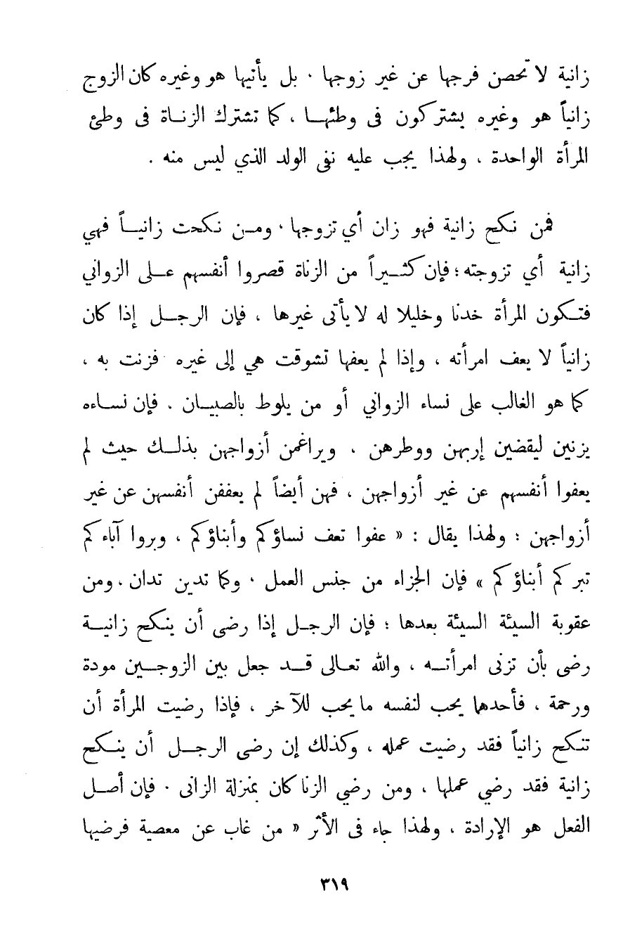 زَانِيَةً لَا تُحْصِنُ فَرْجَهَا عَنْ غَيْرِ زَوْجِهَا بَلْ يَأْتِيهَا هُوَ وَغَيْرُهُ كَانَ الزَّوْجُ زَانِيًا هُوَ وَغَيْرُهُ يَشْتَرِكُونَ فِي وَطْئِهَا كَمَا تَشْتَرِكُ الزُّنَاةُ فِي وَطْءِ الْمَرْأَةِ الْوَاحِدَةِ وَلِهَذَا يَجِبُ عَلَيْهِ نَفْيُ الْوَلَدِ الَّذِي لَيْسَ مِنْهُ. فَمَنْ نَكَحَ زَانِيَةً فَهُوَ زَانٍ أَيْ تَزَوَّجَهَا وَمَنْ نَكَحَتْ زَانِيًا فَهِيَ زَانِيَةٌ أَيْ تَزَوَّجَتْهُ؛ فَإِنَّ كَثِيرًا مِنْ الزُّنَاةِ قَصَرُوا أَنْفُسَهُمْ عَلَى الزَّوَانِي فَتَكُونُ الْمَرْأَةُ خِدْنًا وَخَلِيلًا لَهُ لَا يَأْتِي غَيْرَهَا فَإِنَّ الرَّجُلَ إذَا كَانَ زَانِيًا لَا يُعِفُّ امْرَأَتَهُ وَإِذَا لَمْ يُعِفَّهَا تَشَوَّقَتْ هِيَ إلَى غَيْرِهِ فَزَنَتْ بِهِ كَمَا هُوَ الْغَالِبُ عَلَى نِسَاءِ الزَّوَانِي أَوْ مَنْ يَلُوطُ بِالصِّبْيَانِ فَإِنَّ نِسَاءَهُ يَزْنِينَ لِيَقْضِينَ إرْبَهُنَّ وَوَطَرَهُنَّ ويراغمن أَزْوَاجَهُنَّ بِذَلِكَ حَيْثُ لَمْ يَعِفُّوا أَنْفُسَهُمْ عَنْ غَيْرِ أَزْوَاجِهِنَّ فَهُنَّ أَيْضًا لَمْ يَعْفِفْنَ أَنْفُسَهُنَّ عَنْ غَيْرِ أَزْوَاجِهِنَّ؛ وَلِهَذَا يُقَالُ: " عِفُّوا تَعِفُّ نِسَاؤُكُمْ وَأَبْنَاؤُكُمْ وَبَرُّوا آبَاءَكُمْ تَبَرُّكُمْ أَبْنَاؤُكُمْ " فَإِنَّ الْجَزَاءَ مِنْ جِنْسِ الْعَمَلِ وَكَمَا تَدِينُ تُدَانُ وَمِنْ عُقُوبَةِ السَّيِّئَةِ السَّيِّئَةُ بَعْدَهَا؛ فَإِنَّ الرَّجُلَ إذَا رَضِيَ أَنْ يَنْكِحَ زَانِيَةً رَضِيَ بِأَنْ تَزْنِيَ امْرَأَتُهُ وَاَللَّهُ تَعَالَى قَدْ جَعَلَ بَيْنَ الزَّوْجَيْنِ مَوَدَّةً وَرَحْمَةً فَأَحَدُهُمَا يُحِبُّ لِنَفْسِهِ مَا يُحِبُّ لِلْآخَرِ فَإِذَا رَضِيَتْ الْمَرْأَةُ أَنْ تَنْكِحَ زَانِيًا فَقَدْ رَضِيَتْ عَمَلَهُ وَكَذَلِكَ إنْ رَضِيَ الرَّجُلُ أَنْ يَنْكِحَ زَانِيَةً فَقَدْ رَضِيَ عَمَلَهَا وَمَنْ رَضِيَ الزِّنَا كَانَ بِمَنْزِلَةِ الزَّانِي. فَإِنَّ أَصْلَ الْفِعْلِ هُوَ الْإِرَادَةُ وَلِهَذَا جَاءَ فِي الْأَثَرِ " مَنْ غَابَ عَنْ مَعْصِيَةٍ فَرَضِيَهَا