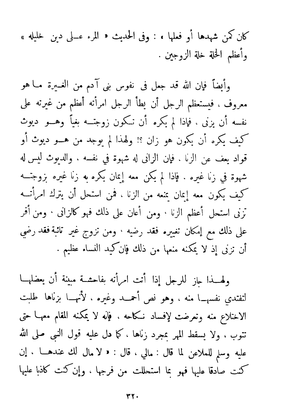 كَانَ كَمَنْ شَهِدَهَا أَوْ فَعَلَهَا ": وَفِي الْحَدِيثِ {الْمَرْءُ عَلَى دِينِ خَلِيلِهِ} وَأَعْظَمُ الْخِلَّةِ خِلَّةُ الزَّوْجَيْنِ. وَأَيْضًا فَإِنَّ اللَّهَ قَدْ جَعَلَ فِي نُفُوسِ بَنِي آدَمَ مِنْ الْغَيْرَةِ مَا هُوَ مَعْرُوفٌ فَيَسْتَعْظِمُ الرَّجُلُ أَنْ يَطَأَ الرَّجُلُ امْرَأَتَهُ أَعْظَمَ مِنْ غَيْرَتِهِ عَلَى نَفْسِهِ أَنْ يَزْنِيَ فَإِذَا لَمْ يَكْرَهْ أَنْ تَكُونَ زَوْجَتُهُ بَغِيًّا وَهُوَ دَيُّوثٌ كَيْفَ يَكْرَهُ أَنْ يَكُونَ هُوَ زَانٍ وَلِهَذَا لَمْ يُوجَدْ مَنْ هُوَ دَيُّوثٌ أَوْ قَوَّادٌ يَعِفُّ عَنْ الزِّنَا فَإِنَّ الزَّانِيَ لَهُ شَهْوَةٌ فِي نَفْسِهِ وَالدَّيُّوثُ لَيْسَ لَهُ شَهْوَةٌ فِي زِنَا غَيْرِهِ فَإِذَا لَمْ يَكُنْ مَعَهُ إيمَانٌ يَكْرَهُ بِهِ زِنَا غَيْرِهِ بِزَوْجَتِهِ كَيْفَ يَكُونُ مَعَهُ إيمَانٌ يَمْنَعُهُ مِنْ الزِّنَا فَمَنْ اسْتَحَلَّ أَنْ يَتْرُكَ امْرَأَتَهُ تَزْنِي اسْتَحَلَّ أَعْظَمَ الزِّنَا وَمَنْ أَعَانَ عَلَى ذَلِكَ فَهُوَ كَالزَّانِي وَمَنْ أَقَرَّ عَلَى ذَلِكَ مَعَ إمْكَانِ تَغْيِيرِهِ فَقَدْ رَضِيَهُ وَمَنْ تَزَوَّجَ غَيْرَ تَائِبَةٍ فَقَدْ رَضِيَ أَنْ تَزْنِيَ إذْ لَا يُمْكِنُهُ مَنْعُهَا مِنْ ذَلِكَ فَإِنَّ كَيْدَ النِّسَاءِ عَظِيمٌ.