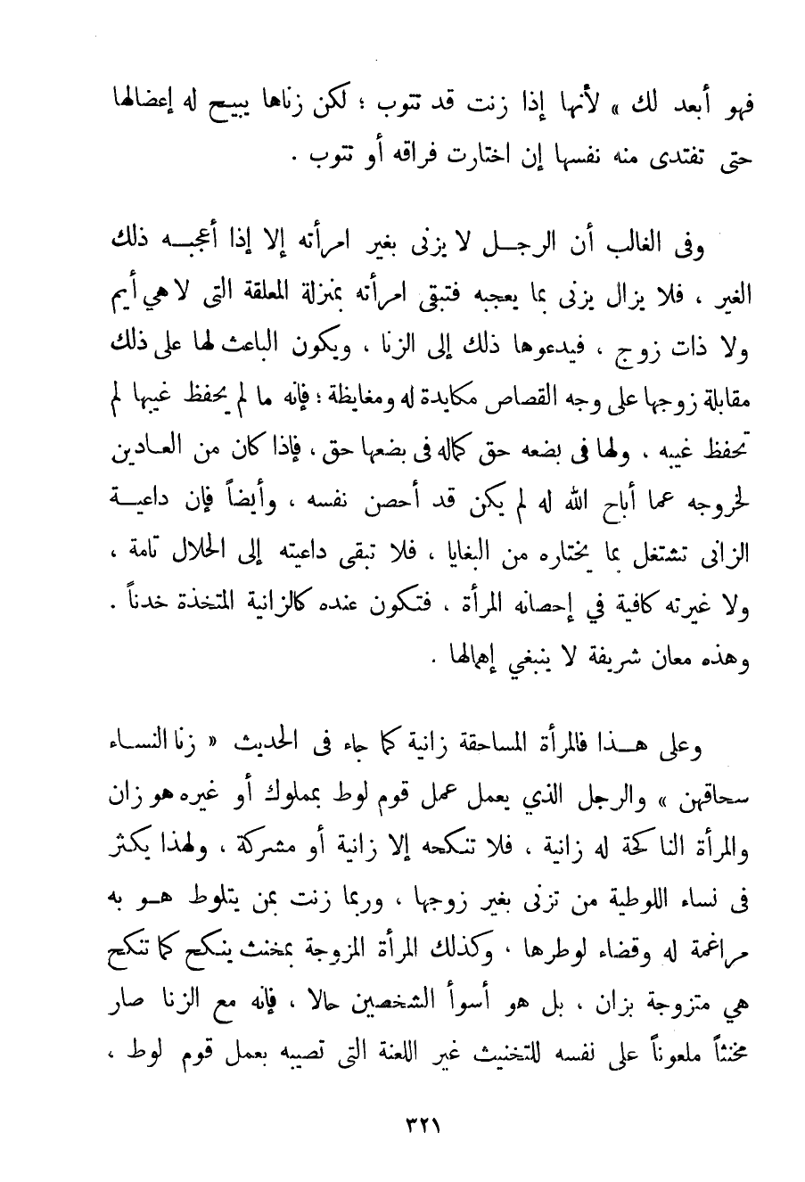فَهُوَ أَبْعَدُ لَك} لِأَنَّهَا إذَا زَنَتْ قَدْ تَتُوبُ؛ لَكِنَّ زِنَاهَا يُبِيحُ لَهُ إعْضَالَهَا حَتَّى تَفْتَدِيَ مِنْهُ نَفْسَهَا إنْ اخْتَارَتْ فِرَاقَهُ أَوْ تَتُوبُ. وَفِي الْغَالِبِ أَنَّ الرَّجُلَ لَا يَزْنِي بِغَيْرِ امْرَأَتِهِ إلَّا إذَا أَعْجَبَهُ ذَلِكَ الْغَيْرُ فَلَا يَزَالُ يَزْنِي بِمَا يُعْجِبُهُ فَتَبْقَى امْرَأَتُهُ بِمَنْزِلَةِ الْمُعَلَّقَةِ الَّتِي لَا هِيَ أَيِّمٌ وَلَا ذَاتُ زَوْجٍ فَيَدْعُوهَا ذَلِكَ إلَى الزِّنَا وَيَكُونُ الْبَاعِثُ لَهَا عَلَى ذَلِكَ مُقَابَلَةُ زَوْجِهَا عَلَى وَجْهِ الْقِصَاصِ مُكَايِدَةً لَهُ وَمُغَايَظَةً؛ فَإِنَّهُ مَا لَمْ يَحْفَظْ غَيْبَهَا لَمْ تَحْفَظْ غَيْبَهُ وَلَهَا فِي بُضْعِهِ حَقٌّ كَمَا لَهُ فِي بُضْعِهَا حَقٌّ فَإِذَا كَانَ مِنْ الْعَادِينَ لِخُرُوجِهِ عَمَّا أَبَاحَ اللَّهُ لَهُ لَمْ يَكُنْ قَدْ أَحْصَنَ نَفْسَهُ وَأَيْضًا فَإِنَّ دَاعِيَةَ الزَّانِي تَشْتَغِلُ بِمَا يَخْتَارُهُ مِنْ الْبَغَايَا فَلَا تَبْقَى دَاعِيَتُهُ إلَى الْحَلَالِ تَامَّةً وَلَا غَيْرَتُهُ كَافِيَةً فِي إحْصَانِهِ الْمَرْأَةَ فَتَكُونُ عِنْدَهُ كَالزَّانِيَةِ الْمُتَّخِذَةِ خِدْنًا. وَهَذِهِ مَعَانٍ شَرِيفَةٌ لَا يَنْبَغِي إهْمَالُهَا. وَعَلَى هَذَا فَالْمَرْأَةُ المساحقة زَانِيَةٌ كَمَا جَاءَ فِي الْحَدِيثِ {زِنَا النِّسَاءِ سِحَاقُهُنَّ} وَالرَّجُلُ الَّذِي يَعْمَلُ عَمَلَ قَوْمِ لُوطٍ بِمَمْلُوكِ أَوْ غَيْرِهِ هُوَ زَانٍ وَالْمَرْأَةُ النَّاكِحَةُ لَهُ زَانِيَةٌ فَلَا تَنْكِحُهُ إلَّا زَانِيَةٌ أَوْ مُشْرِكَةٌ وَلِهَذَا يَكْثُرُ فِي نِسَاءِ اللُّوطِيَّةِ مَنْ تَزْنِي بِغَيْرِ زَوْجِهَا وَرُبَّمَا زَنَتْ بِمَنْ يتلوط هُوَ بِهِ مُرَاغَمَةً لَهُ وَقَضَاءً لِوَطَرِهَا وَكَذَلِكَ الْمَرْأَةُ الْمُزَوَّجَةُ بِمُخَنَّثِ يُنْكَحُ كَمَا تُنْكَحُ هِيَ مُتَزَوِّجَةٌ بِزَانٍ بَلْ هُوَ أَسْوَأُ الشَّخْصَيْنِ حَالًا فَإِنَّهُ مَعَ الزِّنَا صَارَ مُخَنَّثًا مَلْعُونًا عَلَى نَفْسِهِ لِلتَّخْنِيثِ غَيْرُ اللَّعْنَةِ الَّتِي تُصِيبُهُ بِعَمَلِ قَوْمِ لُوطٍ