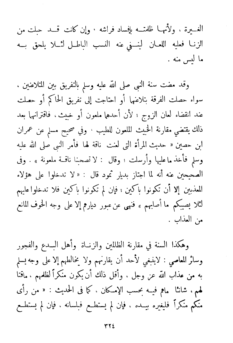 الْغَيْرَةِ وَلِأَنَّهَا ظَلَمَتْهُ بِإِفْسَادِ فِرَاشِهِ وَإِنْ كَانَتْ قَدْ حَبِلَتْ مِنْ الزِّنَا فَعَلَيْهِ اللِّعَانُ لِيَنْفِيَ عَنْهُ النَّسَبَ الْبَاطِلَ لِئَلَّا يَلْحَقَ بِهِ مَا لَيْسَ مِنْهُ. وَقَدْ مَضَتْ سُنَّةُ النَّبِيِّ صَلَّى اللَّهُ عَلَيْهِ وَسَلَّمَ بِالتَّفْرِيقِ بَيْنَ الْمُتَلَاعِنَيْنِ سَوَاءٌ حَصَلَتْ الْفُرْقَةُ بِتَلَاعُنِهِمَا أَوْ احْتَاجَتْ إلَى تَفْرِيقِ الْحَاكِمِ أَوْ حَصَلَتْ عِنْدَ انْقِضَاءِ لِعَانِ الزَّوْجِ؛ لِأَنَّ أَحَدَهُمَا مَلْعُونٌ أَوْ خَبِيثٌ فَاقْتِرَانُهُمَا بَعْدَ ذَلِكَ يَقْتَضِي مُقَارَنَةَ الْخَبِيثِ الْمَلْعُونِ لِلطَّيِّبِ وَفِي صَحِيحِ مُسْلِمٍ عَنْ عِمْرَانَ ابْنِ حُصَيْنٍ {حَدِيثُ الْمَرْأَةِ الَّتِي لَعَنَتْ نَاقَةً لَهَا فَأَمَرَ النَّبِيُّ صَلَّى اللَّهُ عَلَيْهِ وَسَلَّمَ فَأَخَذَ مَا عَلَيْهَا وَأُرْسِلَتْ؛ وَقَالَ: لَا تَصْحَبُنَا نَاقَةٌ مَلْعُونَةٌ} . وَفِي الصَّحِيحَيْنِ عَنْهُ أَنَّهُ لَمَّا اجْتَازَ بِدِيَارِ ثَمُودٍ قَالَ: {لَا تَدْخُلُوا عَلَى هَؤُلَاءِ الْمُعَذَّبِينَ إلَّا أَنْ تَكُونُوا بَاكِينَ؛ فَإِنْ لَمْ تَكُونُوا بَاكِينَ فَلَا تَدْخُلُوا عَلَيْهِمْ لِئَلَّا يُصِيبَكُمْ مَا أَصَابَهُمْ} فَنَهَى عَنْ عُبُورِ دِيَارِهِمْ إلَّا عَلَى وَجْهِ الْخَوْفِ الْمَانِعِ مِنْ الْعَذَابِ. وَهَكَذَا السُّنَّةُ فِي مُقَارِنَةِ الظَّالِمِينَ وَالزُّنَاةِ وَأَهْلِ الْبِدَعِ وَالْفُجُورِ وَسَائِرِ الْمَعَاصِي: لَا يَنْبَغِي لِأَحَدِ أَنْ يُقَارِنَهُمْ وَلَا يُخَالِطَهُمْ إلَّا عَلَى وَجْهٍ يَسْلَمُ بِهِ مِنْ عَذَابِ اللَّهِ عَزَّ وَجَلَّ وَأَقَلُّ ذَلِكَ أَنْ يَكُونَ مُنْكَرًا لِظُلْمِهِمْ مَاقِتًا لَهُمْ شَانِئًا مَا هُمْ فِيهِ بِحَسَبِ الْإِمْكَانِ كَمَا فِي الْحَدِيثِ: {مَنْ رَأَى مِنْكُمْ مُنْكَرًا فَلْيُغَيِّرْهُ بِيَدِهِ فَإِنْ لَمْ يَسْتَطِعْ فَبِلِسَانِهِ فَإِنْ لَمْ يَسْتَطِعْ