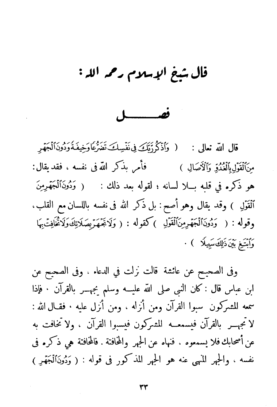 قَالَ اللَّهُ تَعَالَى: {وَاذْكُرْ رَبَّكَ فِي نَفْسِكَ تَضَرُّعًا وَخِيفَةً وَدُونَ الْجَهْرِ مِنَ الْقَوْلِ بِالْغُدُوِّ وَالْآصَالِ} فَأُمِرَ بِذِكْرِ اللَّهِ فِي نَفْسِهِ فَقَدْ يُقَالُ: هُوَ ذِكْرُهُ فِي قَلْبِهِ بِلَا لِسَانِهِ؛ لِقَوْلِهِ بَعْدَ ذَلِكَ: {وَدُونَ الْجَهْرِ مِنَ الْقَوْلِ} وَقَدْ يُقَالُ وَهُوَ أَصَحُّ: بَلْ ذِكْرُ اللَّهِ فِي نَفْسِهِ بِاللِّسَانِ مَعَ الْقَلْبِ وَقَوْلُهُ: {وَدُونَ الْجَهْرِ مِنَ الْقَوْلِ} كَقَوْلِهِ: {وَلَا تَجْهَرْ بِصَلَاتِكَ وَلَا تُخَافِتْ بِهَا وَابْتَغِ بَيْنَ ذَلِكَ سَبِيلًا} . وَفِي الصَّحِيحِ عَنْ عَائِشَةَ قَالَتْ نَزَلَتْ فِي الدُّعَاءِ. وَفِي الصَّحِيحِ عَنْ {ابْنِ عَبَّاسٍ قَالَ: كَانَ النَّبِيُّ صَلَّى اللَّهُ عَلَيْهِ وَسَلَّمَ يَجْهَرُ بِالْقُرْآنِ فَإِذَا سَمِعَهُ الْمُشْرِكُونَ سَبُّوا الْقُرْآنَ وَمَنْ أَنْزَلَهُ وَمَنْ أُنْزِلَ عَلَيْهِ فَقَالَ اللَّهُ: لَا تَجْهَرْ بِالْقُرْآنِ فَيَسْمَعَهُ الْمُشْرِكُونَ فَيَسُبُّوا الْقُرْآنَ وَلَا تُخَافِتْ بِهِ عَنْ أَصْحَابِك فَلَا يَسْمَعُوهُ} . فَنَهَاهُ عَنْ الْجَهْرِ وَالْمُخَافَتَةِ. فَالْمُخَافَتَةُ هِيَ ذِكْرُهُ فِي نَفْسِهِ وَالْجَهْرُ الْمَنْهِيُّ عَنْهُ هُوَ الْجَهْرُ الْمَذْكُورُ فِي قَوْلِهِ: {وَدُونَ الْجَهْرِ}