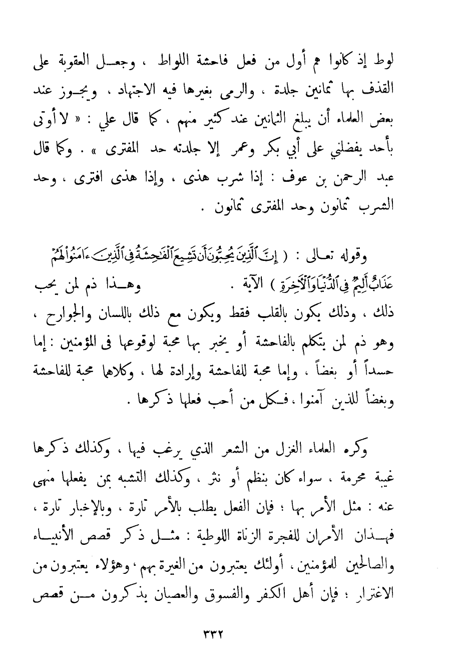 لُوطٍ إذْ كَانُوا هُمْ أَوَّلَ مَنْ فَعَلَ فَاحِشَةَ اللِّوَاطِ وَجَعَلَ الْعُقُوبَةَ عَلَى الْقَذْفِ بِهَا ثَمَانِينَ جَلْدَةً وَالرَّمْيَ بِغَيْرِهَا فِيهِ الِاجْتِهَادُ وَيَجُوزُ عِنْدَ بَعْضِ الْعُلَمَاءِ أَنْ يَبْلُغَ الثَّمَانِينَ عِنْدَ كَثِيرٍ مِنْهُمْ كَمَا قَالَ عَلِيٌّ: " لَا أُوتِيَ بِأَحَدِ يُفَضِّلُنِي عَلَى أَبِي بَكْرٍ وَعُمَرَ إلَّا جَلَدْته حَدَّ الْمُفْتَرِي ". وَكَمَا قَالَ عَبْدُ الرَّحْمَنِ بْنُ عَوْفٍ: إذَا شَرِبَ هَذَى وَإِذَا هَذَى افْتَرَى وَحَدُّ الشُّرْبِ ثَمَانُونَ وَحَدُّ الْمُفْتَرِي ثَمَانُونَ. وقَوْله تَعَالَى {إنَّ الَّذِينَ يُحِبُّونَ أَنْ تَشِيعَ الْفَاحِشَةُ فِي الَّذِينَ آمَنُوا لَهُمْ عَذَابٌ أَلِيمٌ فِي الدُّنْيَا وَالْآخِرَةِ} الْآيَةُ. وَهَذَا ذَمٌّ لِمَنْ يُحِبُّ ذَلِكَ وَذَلِكَ يَكُونُ بِالْقَلْبِ فَقَطْ وَيَكُونُ مَعَ ذَلِكَ بِاللِّسَانِ وَالْجَوَارِحِ وَهُوَ ذَمٌّ لِمَنْ يَتَكَلَّمُ بِالْفَاحِشَةِ أَوْ يُخْبِرُ بِهَا مَحَبَّةً لِوُقُوعِهَا فِي الْمُؤْمِنِينَ: إمَّا حَسَدًا أَوْ بُغْضًا وَإِمَّا مَحَبَّةً لِلْفَاحِشَةِ وَإِرَادَةً لَهَا وَكِلَاهُمَا مَحَبَّةٌ لِلْفَاحِشَةِ وَبُغْضًا لِلَّذِينَ آمَنُوا فَكُلُّ مَنْ أَحَبَّ فِعْلَهَا ذَكَرَهَا. وَكَرِهَ الْعُلَمَاءُ الْغَزَلَ مِنْ الشِّعْرِ الَّذِي يُرَغِّبُ فِيهَا وَكَذَلِكَ ذِكْرُهَا غِيبَةٌ مُحَرَّمَةٌ سَوَاءٌ كَانَ بِنَظْمِ أَوْ نَثْرٍ وَكَذَلِكَ التَّشَبُّهُ بِمَنْ يَفْعَلُهَا مَنْهِيٌّ عَنْهُ: مِثْلَ الْأَمْرِ بِهَا؛ فَإِنَّ الْفِعْلَ يُطْلَبُ بِالْأَمْرِ تَارَةً وَبِالْإِخْبَارِ تَارَةً فَهَذَانِ الْأَمْرَانِ لِلْفَجَرَةِ الزُّنَاةِ اللُّوطِيَّةِ: مِثْلَ ذِكْرِ قِصَصِ الْأَنْبِيَاءِ وَالصَّالِحِينَ لِلْمُؤْمِنِينَ أُولَئِكَ يَعْتَبِرُونَ مِنْ الْغَيْرَةِ بِهِمْ وَهَؤُلَاءِ يَعْتَبِرُونَ مِنْ الِاغْتِرَارِ؛ فَإِنَّ أَهْلَ الْكُفْرِ وَالْفُسُوقِ وَالْعِصْيَانِ يَذْكُرُونَ مِنْ قِصَصِ
