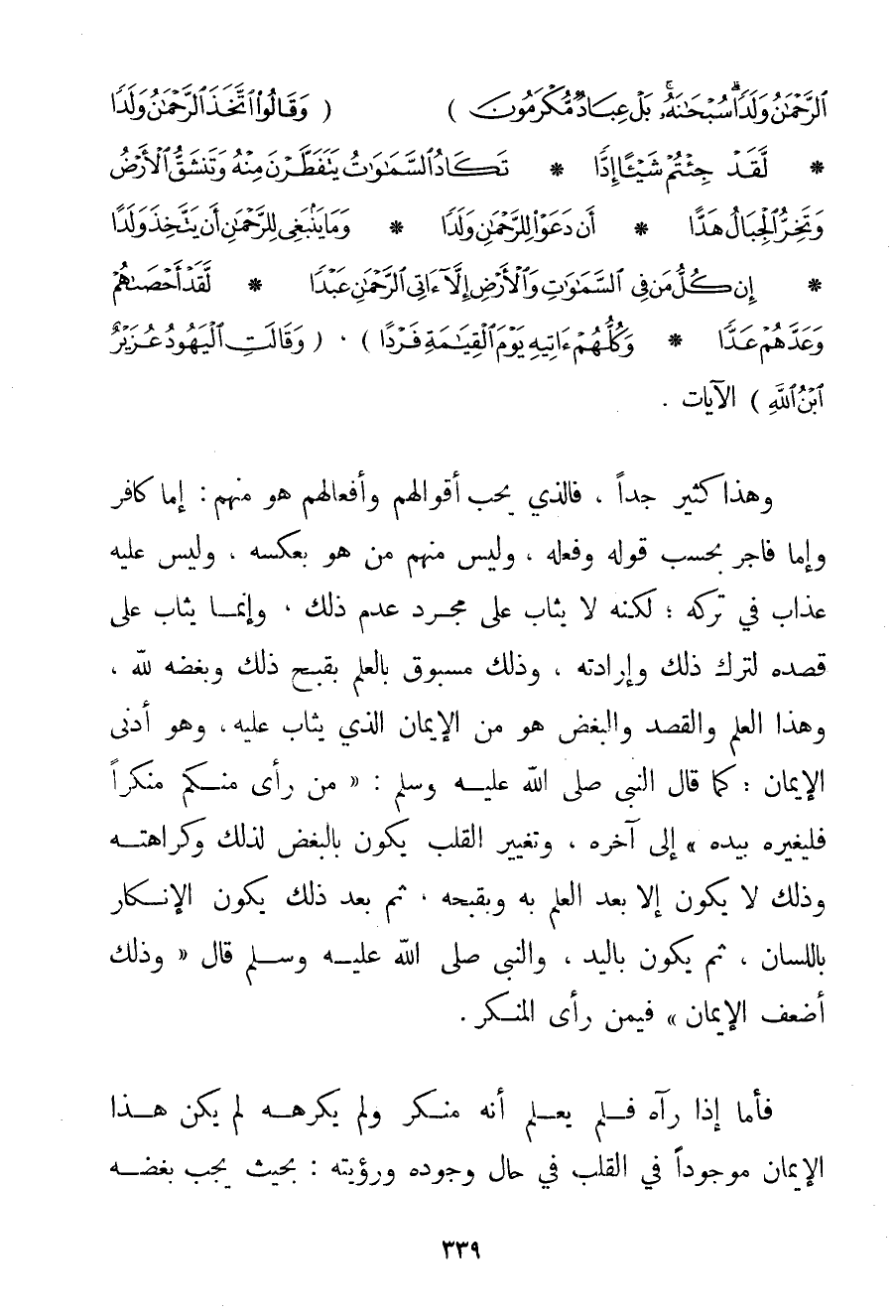 الرَّحْمَنُ وَلَدًا سُبْحَانَهُ بَلْ عِبَادٌ مُكْرَمُونَ} {وَقَالُوا اتَّخَذَ الرَّحْمَنُ وَلَدًا} {لَقَدْ جِئْتُمْ شَيْئًا إدًّا} {تَكَادُ السَّمَاوَاتُ يَتَفَطَّرْنَ مِنْهُ وَتَنْشَقُّ الْأَرْضُ وَتَخِرُّ الْجِبَالُ هَدًّا} {أَنْ دَعَوْا لِلرَّحْمَنِ وَلَدًا} {وَمَا يَنْبَغِي لِلرَّحْمَنِ أَنْ يَتَّخِذَ وَلَدًا} {إنْ كُلُّ مَنْ فِي السَّمَاوَاتِ وَالْأَرْضِ إلَّا آتِي الرَّحْمَنِ عَبْدًا} {لَقَدْ أَحْصَاهُمْ وَعَدَّهُمْ عَدًّا} {وَكُلُّهُمْ آتِيهِ يَوْمَ الْقِيَامَةِ فَرْدًا} {وَقَالَتِ الْيَهُودُ عُزَيْرٌ ابْنُ اللَّهِ} الْآيَاتُ. وَهَذَا كَثِيرٌ جِدًّا فَاَلَّذِي يُحِبُّ أَقْوَالَهُمْ وَأَفْعَالَهُمْ هُوَ مِنْهُمْ: إمَّا كَافِرٌ وَإِمَّا فَاجِرٌ بِحَسَبِ قَوْلِهِ وَفِعْلِهِ وَلَيْسَ مِنْهُمْ مَنْ هُوَ بِعَكْسِهِ وَلَيْسَ عَلَيْهِ عَذَابٌ فِي تَرْكِهِ؛ لَكِنَّهُ لَا يُثَابُ عَلَى مُجَرَّدِ عَدَمِ ذَلِكَ وَإِنَّمَا يُثَابُ عَلَى قَصْدِهِ لِتَرْكِ ذَلِكَ وَإِرَادَتِهِ وَذَلِكَ مَسْبُوقٌ بِالْعِلْمِ بِقُبْحِ ذَلِكَ وَبُغْضِهِ لِلَّهِ وَهَذَا الْعِلْمُ وَالْقَصْدُ وَالْبُغْضُ هُوَ مِنْ الْإِيمَانِ الَّذِي يُثَابُ عَلَيْهِ وَهُوَ أَدْنَى الْإِيمَانِ؛ كَمَا قَالَ النَّبِيُّ صَلَّى اللَّهُ عَلَيْهِ وَسَلَّمَ {مَنْ رَأَى مِنْكُمْ مُنْكَرًا فَلْيُغَيِّرْهُ بِيَدِهِ} إلَى آخِرِهِ وَتَغْيِيرُ الْقَلْبِ يَكُونُ بِالْبُغْضِ لِذَلِكَ وَكَرَاهَتِهِ وَذَلِكَ لَا يَكُونُ إلَّا بَعْدَ الْعِلْمِ بِهِ وَبِقُبْحِهِ ثُمَّ بَعْدَ ذَلِكَ يَكُونُ الْإِنْكَارُ بِاللِّسَانِ ثُمَّ يَكُونُ بِالْيَدِ وَالنَّبِيُّ صَلَّى اللَّهُ عَلَيْهِ وَسَلَّمَ قَالَ {وَذَلِكَ أَضْعَفُ الْإِيمَانِ} فِيمَنْ رَأَى الْمُنْكَرَ. فَأَمَّا إذَا رَآهُ فَلَمْ يَعْلَمْ أَنَّهُ مُنْكَرٌ وَلَمْ يَكْرَهْهُ لَمْ يَكُنْ هَذَا الْإِيمَانُ مَوْجُودًا فِي الْقَلْبِ فِي حَالِ وُجُودِهِ وَرُؤْيَتِهِ: بِحَيْثُ يَجِبُ بُغْضُهُ