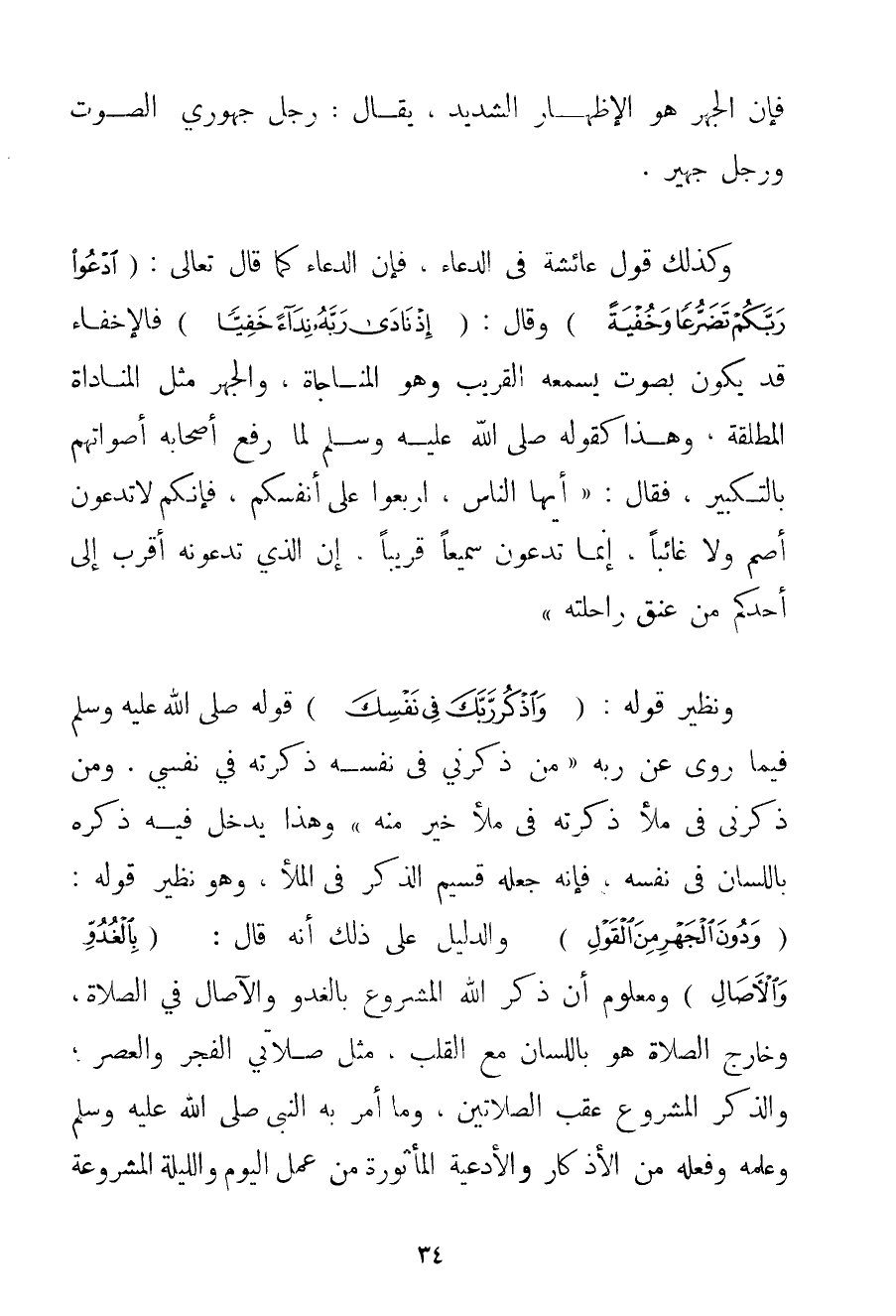 فَإِنَّ الْجَهْرَ هُوَ الْإِظْهَارُ الشَّدِيدُ يُقَالُ: رَجُلٌ جَهْوَرِيُّ الصَّوْتِ وَرَجُلٌ جَهِيرٌ. وَكَذَلِكَ قَوْلُ عَائِشَةَ فِي الدُّعَاءِ فَإِنَّ الدُّعَاءَ كَمَا قَالَ تَعَالَى: {ادْعُوا رَبَّكُمْ تَضَرُّعًا وَخُفْيَةً} وَقَالَ: {إذْ نَادَى رَبَّهُ نِدَاءً خَفِيًّا} فَالْإِخْفَاءُ قَدْ يَكُونُ بِصَوْتِ يَسْمَعُهُ الْقَرِيبُ وَهُوَ الْمُنَاجَاةُ وَالْجَهْرُ مِثْلُ الْمُنَادَاةِ الْمُطْلَقَةِ وَهَذَا كَقَوْلِهِ صَلَّى اللَّهُ عَلَيْهِ وَسَلَّمَ {لَمَّا رَفَعَ أَصْحَابُهُ أَصْوَاتَهُمْ بِالتَّكْبِيرِ فَقَالَ: أَيُّهَا النَّاسُ أَرْبِعُوا عَلَى أَنْفُسِكُمْ فَإِنَّكُمْ لَا تَدْعُونَ أَصَمَّ وَلَا غَائِبًا إنَّمَا تَدْعُونَ سَمِيعًا قَرِيبًا إنَّ الَّذِي تَدْعُونَهُ أَقْرَبُ إلَى أَحَدِكُمْ مِنْ عُنُقِ رَاحِلَتِهِ} " وَنَظِيرُ قَوْلِهِ: {وَاذْكُرْ رَبَّكَ فِي نَفْسِكَ} قَوْلُهُ صَلَّى اللَّهُ عَلَيْهِ وَسَلَّمَ فِيمَا رَوَى عَنْ رَبِّهِ " {مَنْ ذَكَرَنِي فِي نَفْسِهِ ذَكَرْته فِي نَفْسِي. وَمَنْ ذَكَرَنِي فِي مَلَأٍ ذَكَرْته فِي مَلَأٍ خَيْرٍ مِنْهُ} " وَهَذَا يَدْخُلُ فِيهِ ذِكْرُهُ بِاللِّسَانِ فِي نَفْسِهِ فَإِنَّهُ جَعَلَهُ قَسِيمَ الذِّكْرِ فِي الْمَلَأِ وَهُوَ نَظِيرُ قَوْلِهِ: {وَدُونَ الْجَهْرِ مِنَ الْقَوْلِ} وَالدَّلِيلُ عَلَى ذَلِكَ أَنَّهُ قَالَ: {بِالْغُدُوِّ وَالْآصَالِ} وَمَعْلُومٌ أَنَّ ذِكْرَ اللَّهِ الْمَشْرُوعَ بِالْغُدُوِّ وَالْآصَالِ فِي الصَّلَاةِ وَخَارِجَ الصَّلَاةِ هُوَ بِاللِّسَانِ مَعَ الْقَلْبِ مِثْلَ صَلَاتَيْ الْفَجْرِ وَالْعَصْرِ وَالذِّكْرِ الْمَشْرُوعِ عَقِبَ الصَّلَاتَيْنِ وَمَا أَمَرَ بِهِ النَّبِيُّ صَلَّى اللَّهُ عَلَيْهِ وَسَلَّمَ وَعَلَّمَهُ وَفَعَلَهُ مِنْ الْأَذْكَارِ وَالْأَدْعِيَةِ الْمَأْثُورَةِ مِنْ عَمَلِ الْيَوْمِ وَاللَّيْلَةِ الْمَشْرُوعَةِ