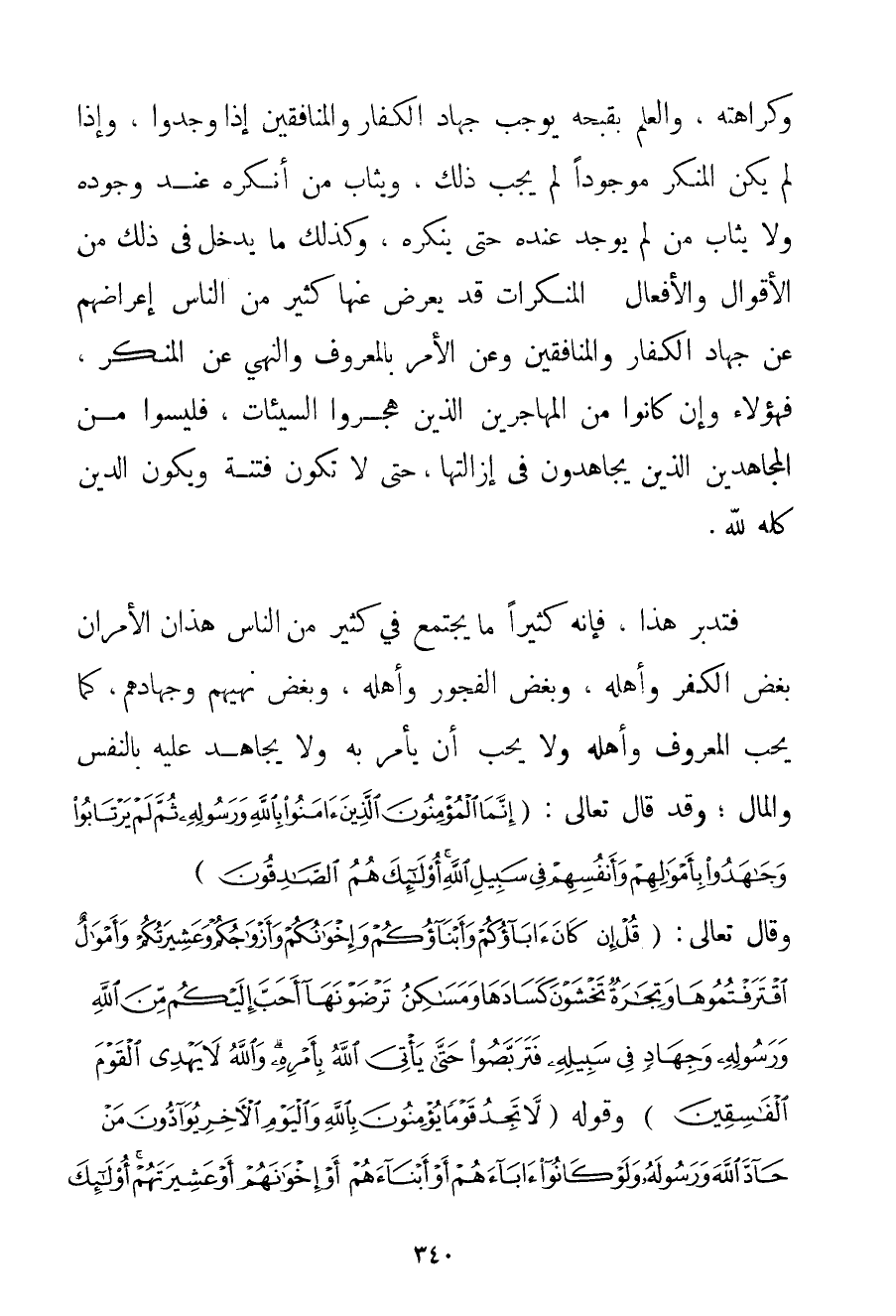 وَكَرَاهَتُهُ وَالْعِلْمُ بِقُبْحِهِ يُوجِبُ جِهَادَ الْكُفَّارِ وَالْمُنَافِقِينَ إذَا وُجِدُوا وَإِذَا لَمْ يَكُنْ الْمُنْكَرُ مَوْجُودًا لَمْ يَجِبْ ذَلِكَ وَيُثَابُ مَنْ أَنْكَرَهُ عِنْدَ وُجُودِهِ وَلَا يُثَابُ مَنْ لَمْ يُوجَدْ عِنْدَهُ حَتَّى يُنْكِرَهُ وَكَذَلِكَ مَا يَدْخُلُ فِي ذَلِكَ مِنْ الْأَقْوَالِ وَالْأَفْعَالِ الْمُنْكَرَاتِ قَدْ يَعْرِضُ عَنْهَا كَثِيرٌ مِنْ النَّاسِ إعْرَاضَهُمْ عَنْ جِهَادِ الْكُفَّارِ وَالْمُنَافِقِينَ وَعَنْ الْأَمْرِ بِالْمَعْرُوفِ وَالنَّهْيِ عَنْ الْمُنْكَرِ فَهَؤُلَاءِ وَإِنْ كَانُوا مِنْ الْمُهَاجِرِينَ الَّذِينَ هَجَرُوا السَّيِّئَاتِ فَلَيْسُوا مِنْ الْمُجَاهِدِينَ الَّذِينَ يُجَاهِدُونَ فِي إزَالَتِهَا حَتَّى لَا تَكُونَ فِتْنَةٌ وَيَكُونَ الدِّينُ كُلُّهُ لِلَّهِ. فَتَدَبَّرْ هَذَا فَإِنَّهُ كَثِيرًا مَا يَجْتَمِعُ فِي كَثِيرٍ مِنْ النَّاسِ هَذَانِ الْأَمْرَانِ بُغْضُ الْكُفْرِ وَأَهْلِهِ وَبُغْضُ الْفُجُورِ وَأَهْلِهِ وَبُغْضُ نَهْيِهِمْ وَجِهَادِهِمْ كَمَا يُحِبُّ الْمَعْرُوفَ وَأَهْلَهُ وَلَا يُحِبُّ أَنْ يَأْمُرَ بِهِ وَلَا يُجَاهِدَ عَلَيْهِ بِالنَّفْسِ وَالْمَالِ؛ وَقَدْ قَالَ تَعَالَى: {إنَّمَا الْمُؤْمِنُونَ الَّذِينَ آمَنُوا بِاللَّهِ وَرَسُولِهِ ثُمَّ لَمْ يَرْتَابُوا وَجَاهَدُوا بِأَمْوَالِهِمْ وَأَنْفُسِهِمْ فِي سَبِيلِ اللَّهِ أُولَئِكَ هُمُ الصَّادِقُونَ} وَقَالَ تَعَالَى: {قُلْ إنْ كَانَ آبَاؤُكُمْ وَأَبْنَاؤُكُمْ وَإِخْوَانُكُمْ وَأَزْوَاجُكُمْ وَعَشِيرَتُكُمْ وَأَمْوَالٌ اقْتَرَفْتُمُوهَا وَتِجَارَةٌ تَخْشَوْنَ كَسَادَهَا وَمَسَاكِنُ تَرْضَوْنَهَا أَحَبَّ إلَيْكُمْ مِنَ اللَّهِ وَرَسُولِهِ وَجِهَادٍ فِي سَبِيلِهِ فَتَرَبَّصُوا حَتَّى يَأْتِيَ اللَّهُ بِأَمْرِهِ وَاللَّهُ لَا يَهْدِي الْقَوْمَ الْفَاسِقِينَ} وَقَوْلُهُ {لَا تَجِدُ قَوْمًا يُؤْمِنُونَ بِاللَّهِ وَالْيَوْمِ الْآخِرِ يُوَادُّونَ مَنْ حَادَّ اللَّهَ وَرَسُولَهُ وَلَوْ كَانُوا آبَاءَهُمْ أَوْ أَبْنَاءَهُمْ