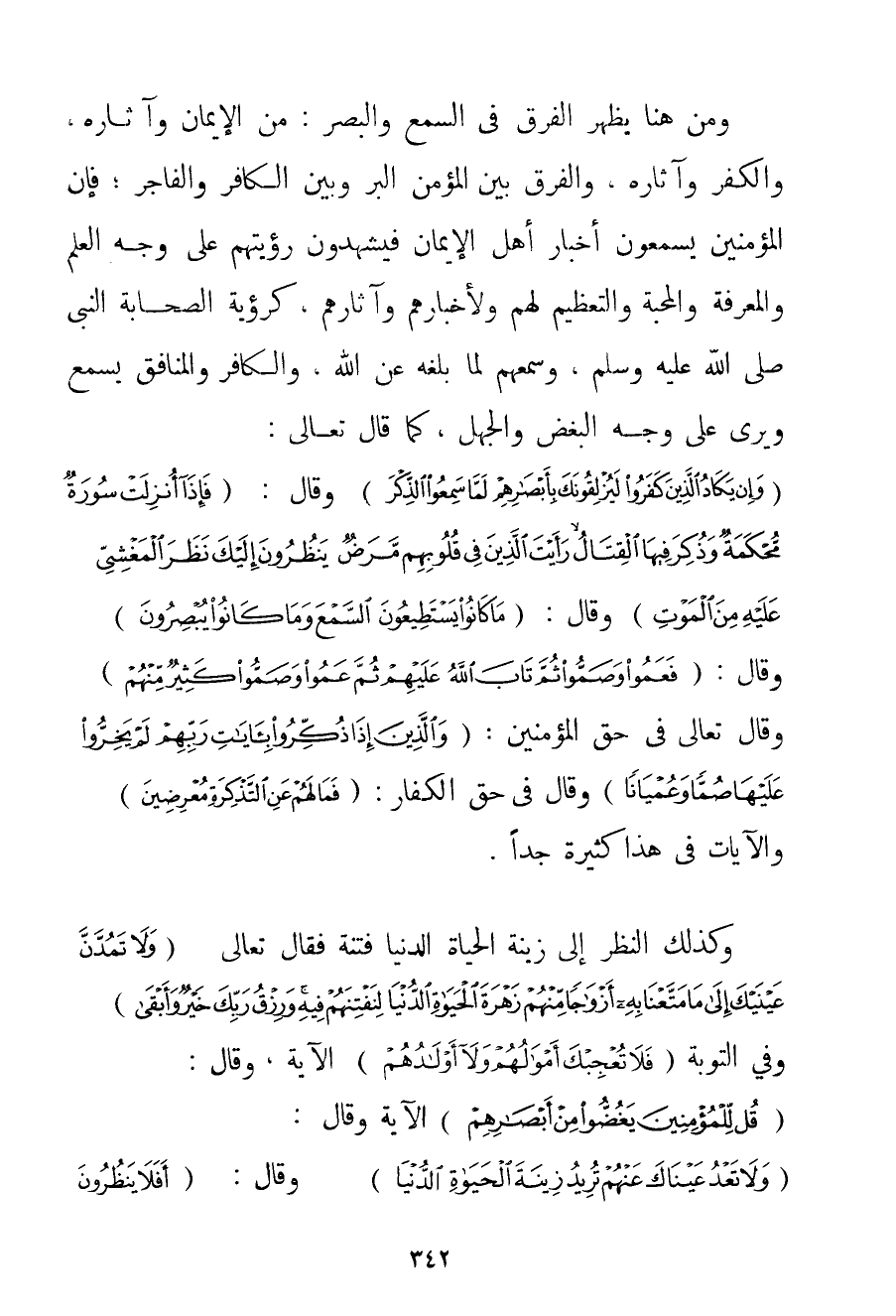 وَمِنْ هُنَا يَظْهَرُ الْفَرْقُ فِي السَّمْعِ وَالْبَصَرِ: مِنْ الْإِيمَانِ وَآثَارِهِ وَالْكُفْرِ وَآثَارِهِ وَالْفَرْقُ بَيْنَ الْمُؤْمِنِ الْبَرِّ وَبَيْنَ الْكَافِرِ وَالْفَاجِرِ؛ فَإِنَّ الْمُؤْمِنِينَ يَسْمَعُونَ أَخْبَارَ أَهْلِ الْإِيمَانِ فَيَشْهَدُونَ رُؤْيَتَهُمْ عَلَى وَجْهِ الْعِلْمِ وَالْمَعْرِفَةِ وَالْمَحَبَّةِ وَالتَّعْظِيمِ لَهُمْ وَلِأَخْبَارِهِمْ وَآثَارِهِمْ كَرُؤْيَةِ الصَّحَابَةِ النَّبِيَّ صَلَّى اللَّهُ عَلَيْهِ وَسَلَّمَ وَسَمْعِهِمْ لِمَا بَلَّغَهُ عَنْ اللَّهِ وَالْكَافِرُ وَالْمُنَافِقُ يَسْمَعُ وَيَرَى عَلَى وَجْهِ الْبُغْضِ وَالْجَهْلِ كَمَا قَالَ تَعَالَى: {وَإِنْ يَكَادُ الَّذِينَ كَفَرُوا لَيُزْلِقُونَكَ بِأَبْصَارِهِمْ لَمَّا سَمِعُوا الذِّكْرَ} وَقَالَ: {فَإِذَا أُنْزِلَتْ سُورَةٌ مُحْكَمَةٌ وَذُكِرَ فِيهَا الْقِتَالُ رَأَيْتَ الَّذِينَ فِي قُلُوبِهِمْ مَرَضٌ يَنْظُرُونَ إلَيْكَ نَظَرَ الْمَغْشِيِّ عَلَيْهِ مِنَ الْمَوْتِ} وَقَالَ: {مَا كَانُوا يَسْتَطِيعُونَ السَّمْعَ وَمَا كَانُوا يُبْصِرُونَ} وَقَالَ: {فَعَمُوا وَصَمُّوا ثُمَّ تَابَ اللَّهُ عَلَيْهِمْ ثُمَّ عَمُوا وَصَمُّوا كَثِيرٌ مِنْهُمْ} وَقَالَ تَعَالَى فِي حَقِّ الْمُؤْمِنِينَ: {وَالَّذِينَ إذَا ذُكِّرُوا بِآيَاتِ رَبِّهِمْ لَمْ يَخِرُّوا عَلَيْهَا صُمًّا وَعُمْيَانًا} وَقَالَ فِي حَقِّ الْكُفَّارِ: {فَمَا لَهُمْ عَنِ التَّذْكِرَةِ مُعْرِضِينَ} وَالْآيَاتُ فِي هَذَا كَثِيرَةٌ جِدًّا. وَكَذَلِكَ النَّظَرُ إلَى زِينَةِ الْحَيَاةِ الدُّنْيَا فِتْنَةٌ فَقَالَ تَعَالَى {وَلَا تَمُدَّنَّ عَيْنَيْكَ إلَى مَا مَتَّعْنَا بِهِ أَزْوَاجًا مِنْهُمْ زَهْرَةَ الْحَيَاةِ الدُّنْيَا لِنَفْتِنَهُمْ فِيهِ وَرِزْقُ رَبِّكَ خَيْرٌ وَأَبْقَى} وَفِي التَّوْبَةِ {فَلَا تُعْجِبْكَ أَمْوَالُهُمْ وَلَا أَوْلَادُهُمْ} الْآيَةُ وَقَالَ: {قُلْ لِلْمُؤْمِنِينَ يَغُضُّوا مِنْ أَبْصَارِهِمْ} الْآيَةُ وَقَالَ: {وَلَا تَعْدُ عَيْنَاكَ عَنْهُمْ تُرِيدُ زِينَةَ الْحَيَاةِ الدُّنْيَا} وَقَالَ: {أَفَلَا يَنْظُرُونَ