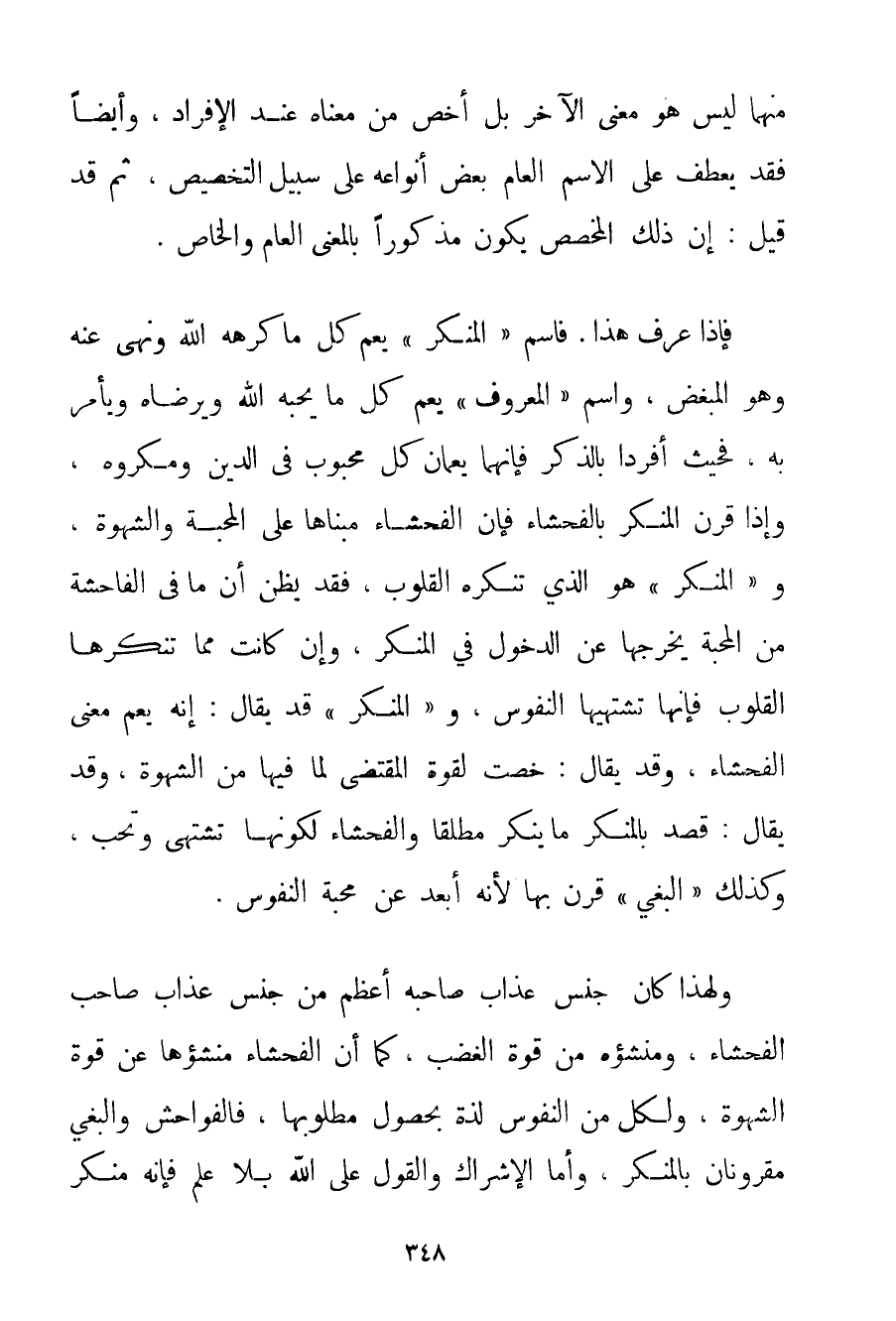 مِنْهُمَا لَيْسَ هُوَ مَعْنَى الْآخَرِ بَلْ أَخَصُّ مِنْ مَعْنَاهُ عِنْدَ الْإِفْرَادِ وَأَيْضًا فَقَدْ يُعْطَفُ عَلَى الِاسْمِ الْعَامِّ بَعْضُ أَنْوَاعِهِ عَلَى سَبِيلِ التَّخْصِيصِ ثُمَّ قَدْ قِيلَ: إنَّ ذَلِكَ الْمُخَصَّصَ يَكُونُ مَذْكُورًا بِالْمَعْنَى الْعَامِّ وَالْخَاصِّ. فَإِذَا عُرِفَ هَذَا. فَاسْمُ " الْمُنْكَرِ " يَعُمُّ كُلَّ مَا كَرِهَهُ اللَّهُ وَنَهَى عَنْهُ وَهُوَ الْمُبْغَضُ وَاسْمُ " الْمَعْرُوفِ " يَعُمُّ كُلَّ مَا يُحِبُّهُ اللَّهُ وَيَرْضَاهُ وَيَأْمُرُ بِهِ فَحَيْثُ أُفْرِدَا بِالذِّكْرِ فَإِنَّهُمَا يَعُمَّانِ كُلَّ مَحْبُوبٍ فِي الدِّينِ وَمَكْرُوهٍ وَإِذَا قُرِنَ الْمُنْكَرُ بِالْفَحْشَاءِ فَإِنَّ الْفَحْشَاءَ مَبْنَاهَا عَلَى الْمَحَبَّةِ وَالشَّهْوَةِ و " الْمُنْكَرُ " هُوَ الَّذِي تُنْكِرُهُ الْقُلُوبُ فَقَدْ يُظَنُّ أَنَّ مَا فِي الْفَاحِشَةِ مِنْ الْمَحَبَّةِ يُخْرِجُهَا عَنْ الدُّخُولِ فِي الْمُنْكَرِ وَإِنْ كَانَتْ مِمَّا تُنْكِرُهَا الْقُلُوبُ فَإِنَّهَا تَشْتَهِيهَا النُّفُوسُ و " الْمُنْكَرُ " قَدْ يُقَالُ: إنَّهُ يَعُمُّ مَعْنَى الْفَحْشَاءِ وَقَدْ يُقَالُ: خُصَّتْ لِقُوَّةِ الْمُقْتَضِي لِمَا فِيهَا مِنْ الشَّهْوَةِ وَقَدْ يُقَالُ: قَصَدَ بِالْمُنْكَرِ مَا يُنْكَرُ مُطْلَقًا وَالْفَحْشَاءُ لِكَوْنِهَا تُشْتَهَى وَتُحَبُّ وَكَذَلِكَ " الْبَغْيُ " قُرِنَ بِهَا لِأَنَّهُ أَبْعَدُ عَنْ مَحَبَّةِ النُّفُوسِ. وَلِهَذَا كَانَ جِنْسُ عَذَابِ صَاحِبِهِ أَعْظَمُ مِنْ جِنْسِ عَذَابِ صَاحِبِ الْفَحْشَاءِ وَمَنْشَؤُهُ مِنْ قُوَّةِ الْغَضَبِ كَمَا أَنَّ الْفَحْشَاءَ مَنْشَؤُهَا عَنْ قُوَّةِ الشَّهْوَةِ وَلِكُلِّ مِنْ النُّفُوسِ لَذَّةٌ بِحُصُولِ مَطْلُوبِهَا فَالْفَوَاحِشُ وَالْبَغْيُ مَقْرُونَانِ بِالْمُنْكَرِ وَأَمَّا الْإِشْرَاكُ وَالْقَوْلُ عَلَى اللَّهِ بِلَا عِلْمٍ فَإِنَّهُ مُنْكَرٌ