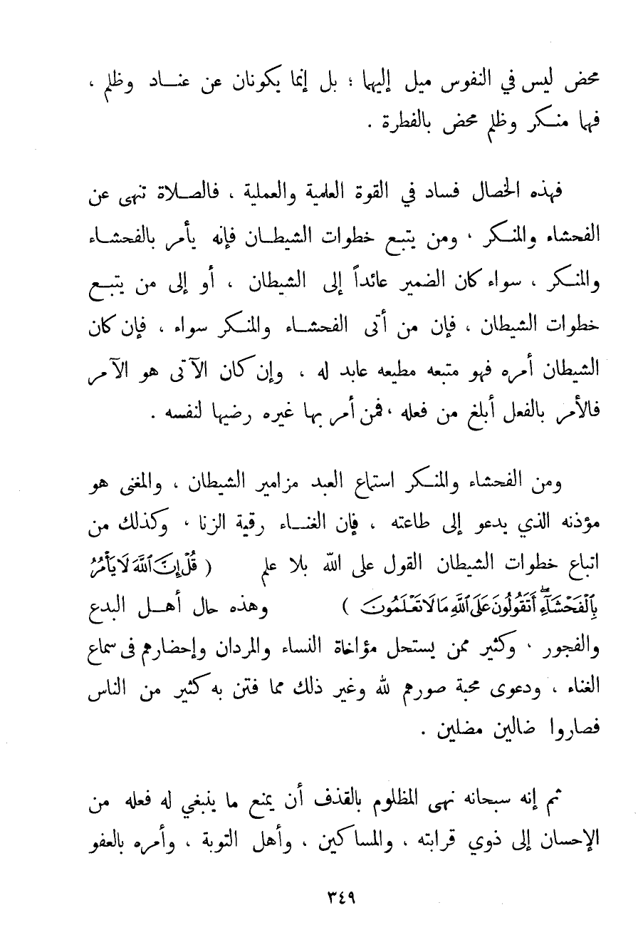 مَحْضٌ لَيْسَ فِي النُّفُوسِ مَيْلٌ إلَيْهِمَا؛ بَلْ إنَّمَا يَكُونَانِ عَنْ عِنَادٍ وَظُلْمٍ فَهُمَا مُنْكَرٌ وَظُلْمٌ مَحْضٌ بِالْفِطْرَةِ. فَهَذِهِ الْخِصَالُ فَسَادٌ فِي الْقُوَّةِ الْعِلْمِيَّةِ وَالْعَمَلِيَّةِ فَالصَّلَاةُ تَنْهَى عَنْ الْفَحْشَاءِ وَالْمُنْكَرِ وَمَنْ يَتَّبِعْ خُطُوَاتِ الشَّيْطَانِ فَإِنَّهُ يَأْمُرُ بِالْفَحْشَاءِ وَالْمُنْكَرِ سَوَاءٌ كَانَ الضَّمِيرُ عَائِدًا إلَى الشَّيْطَانِ أَوْ إلَى مَنْ يَتَّبِعُ خُطُوَاتِ الشَّيْطَانِ فَإِنَّ مَنْ أَتَى الْفَحْشَاءَ وَالْمُنْكَرَ سَوَاءٌ فَإِنْ كَانَ الشَّيْطَانُ أَمَرَهُ فَهُوَ مُتَّبِعُهُ مُطِيعُهُ عَابِدٌ لَهُ وَإِنْ كَانَ الْآتِي هُوَ الْآمِرُ فَالْأَمْرُ بِالْفِعْلِ أَبْلَغُ مِنْ فِعْلِهِ فَمَنْ أَمَرَ بِهَا غَيْرَهُ رَضِيَهَا لِنَفْسِهِ. وَمِنْ الْفَحْشَاءِ وَالْمُنْكَرِ اسْتِمَاعُ الْعَبْدِ مَزَامِيرَ الشَّيْطَانِ وَالْمُغَنِّي هُوَ مُؤَذِّنُهُ الَّذِي يَدْعُو إلَى طَاعَتِهِ فَإِنَّ الْغِنَاءَ رُقْيَةُ الزِّنَا وَكَذَلِكَ مِنْ اتِّبَاعِ خُطُوَاتِ الشَّيْطَانِ الْقَوْلُ عَلَى اللَّهِ بِلَا عِلْمٍ {قُلْ إنَّ اللَّهَ لَا يَأْمُرُ بِالْفَحْشَاءِ أَتَقُولُونَ عَلَى اللَّهِ مَا لَا تَعْلَمُونَ} وَهَذِهِ حَالُ أَهْلِ الْبِدَعِ وَالْفُجُورِ وَكَثِيرٌ مِمَّنْ يَسْتَحِلُّ مُؤَاخَاةَ النِّسَاءِ والمردان وَإِحْضَارَهُمْ فِي سَمَاعِ الْغِنَاءِ وَدَعْوَى مَحَبَّةِ صُوَرِهِمْ لِلَّهِ وَغَيْرِ ذَلِكَ مِمَّا فُتِنَ بِهِ كَثِيرٌ مِنْ النَّاسِ فَصَارُوا ضَالِّينَ مُضِلِّينَ. ثُمَّ إنَّهُ سُبْحَانَهُ نَهَى الْمَظْلُومَ بِالْقَذْفِ أَنْ يَمْنَعَ مَا يَنْبَغِي لَهُ فِعْلُهُ مِنْ الْإِحْسَانِ إلَى ذَوِي قَرَابَتِهِ وَالْمَسَاكِينِ وَأَهْلِ التَّوْبَةِ وَأَمَرَهُ بِالْعَفْوِ