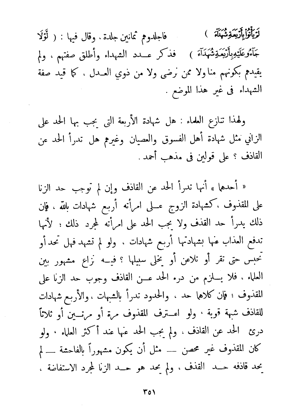 {ثُمَّ لَمْ يَأْتُوا بِأَرْبَعَةِ شُهَدَاءَ فَاجْلِدُوهُمْ ثَمَانِينَ جَلْدَةً} وَقَالَ فِيهَا: {لَوْلَا جَاءُوا عَلَيْهِ بِأَرْبَعَةِ شُهَدَاءَ} فَذَكَرَ عَدَدَ الشُّهَدَاءِ وَأَطْلَقَ صِفَتَهُمْ وَلَمْ يُقَيِّدْهُمْ بِكَوْنِهِمْ مِنَّا وَلَا مِمَّنْ نَرْضَى وَلَا مِنْ ذَوِي الْعَدْلِ كَمَا قَيَّدَ صِفَةَ الشُّهَدَاءِ فِي غَيْرِ هَذَا الْمَوْضِعِ.