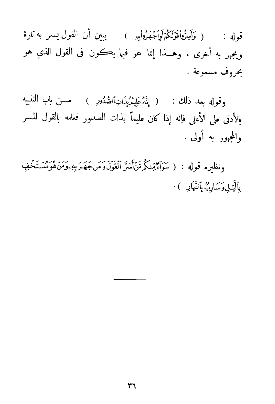 قَوْلَهُ: {وَأَسِرُّوا قَوْلَكُمْ أَوِ اجْهَرُوا بِهِ} يُبَيِّنُ أَنَّ الْقَوْلَ يُسَرُّ بِهِ تَارَةً وَيُجْهَرُ بِهِ أُخْرَى وَهَذَا إنَّمَا هُوَ فِيمَا يَكُونُ فِي الْقَوْلِ الَّذِي هُوَ بِحُرُوفِ مَسْمُوعَةٍ. وَقَوْلُهُ بَعْدَ ذَلِكَ: {إنَّهُ عَلِيمٌ بِذَاتِ الصُّدُورِ} مِنْ بَابِ التَّنْبِيهِ بِالْأَدْنَى عَلَى الْأَعْلَى فَإِنَّهُ إذَا كَانَ عَلِيمًا بِذَاتِ الصُّدُورِ فَعِلْمُهُ بِالْقَوْلِ الْمُسَرِّ وَالْمَجْهُورِ بِهِ أَوْلَى. وَنَظِيرُهُ قَوْلُهُ: {سَوَاءٌ مِنْكُمْ مَنْ أَسَرَّ الْقَوْلَ وَمَنْ جَهَرَ بِهِ وَمَنْ هُوَ مُسْتَخْفٍ بِاللَّيْلِ وَسَارِبٌ بِالنَّهَارِ} .