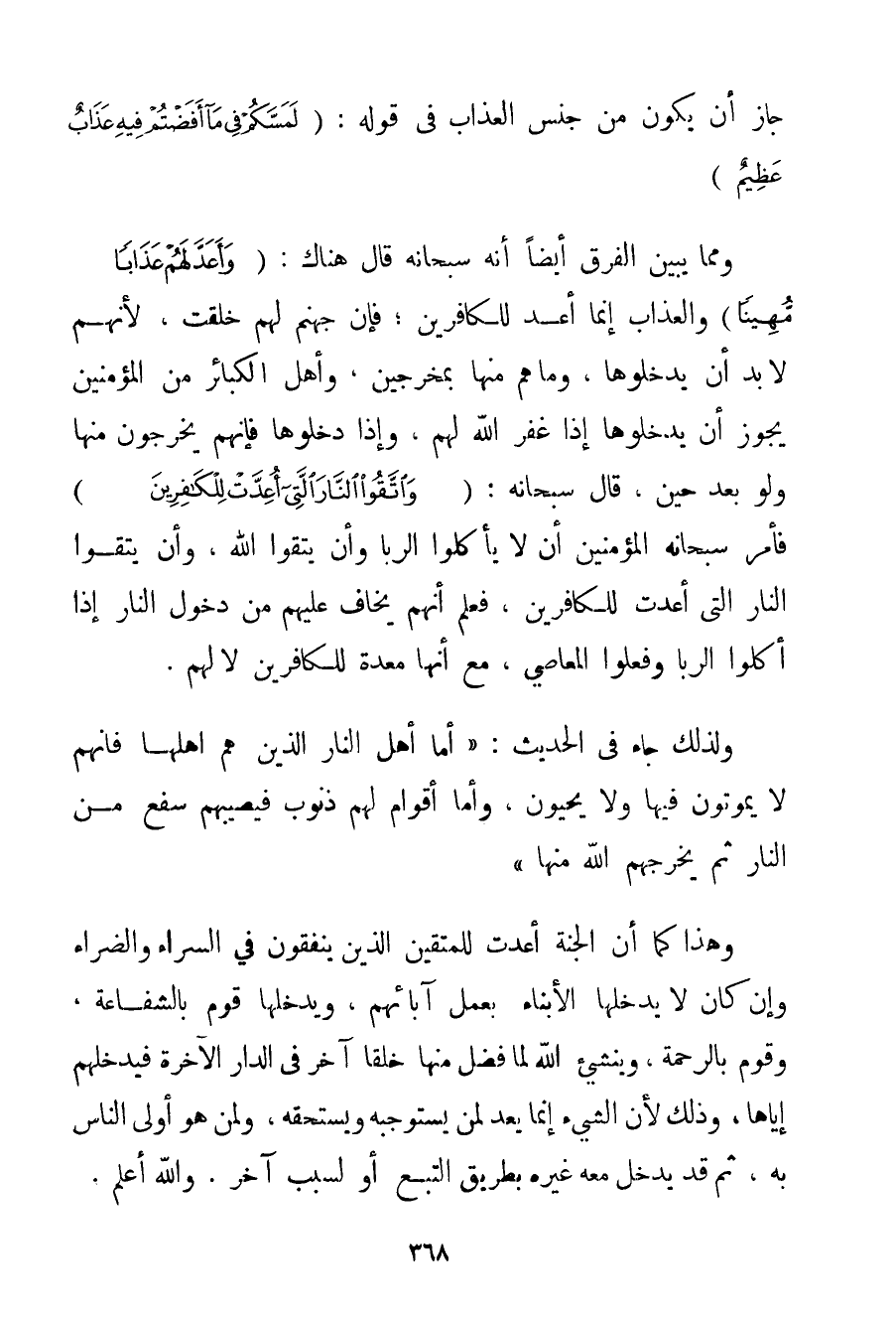 عَظِيمٌ} جَازَ أَنْ يَكُونَ مِنْ جِنْسِ الْعَذَابِ فِي قَوْلِهِ: {لَمَسَّكُمْ فِي مَا أَفَضْتُمْ فِيهِ عَذَابٌ عَظِيمٌ.} وَمِمَّا يُبَيِّنُ الْفَرْقَ أَيْضًا أَنَّهُ سُبْحَانَهُ قَالَ هُنَاكَ: {وَأَعَدَّ لَهُمْ عَذَابًا مُهِينًا} وَالْعَذَابُ إنَّمَا أُعِدَّ لِلْكَافِرِينَ؛ فَإِنَّ جَهَنَّمَ لَهُمْ خُلِقَتْ لِأَنَّهُمْ لَا بُدَّ أَنْ يَدْخُلُوهَا وَمَا هُمْ مِنْهَا بِمُخْرَجِينَ وَأَهْلُ الْكَبَائِرِ مِنْ الْمُؤْمِنِينَ يَجُوزُ أَنْ يَدْخُلُوهَا إذَا غَفَرَ اللَّهُ لَهُمْ وَإِذَا دَخَلُوهَا فَإِنَّهُمْ يُخْرَجُونَ مِنْهَا وَلَوْ بَعْدَ حِينٍ قَالَ سُبْحَانَهُ {وَاتَّقُوا النَّارَ الَّتِي أُعِدَّتْ لِلْكَافِرِينَ} فَأَمَرَ سُبْحَانَهُ الْمُؤْمِنِينَ أَنْ لَا يَأْكُلُوا الرِّبَا وَأَنْ يَتَّقُوا اللَّهَ وَأَنْ يَتَّقُوا النَّارَ الَّتِي أُعِدَّتْ لِلْكَافِرِينَ فَعُلِمَ أَنَّهُمْ يُخَافُ عَلَيْهِمْ مِنْ دُخُولِ النَّارِ إذَا أَكَلُوا الرِّبَا وَفَعَلُوا الْمَعَاصِيَ مَعَ أَنَّهَا مُعَدَّةٌ لِلْكَافِرِينَ لَا لَهُمْ. وَلِذَلِكَ جَاءَ فِي الْحَدِيثِ: {أَمَّا أَهْلُ النَّارِ الَّذِينَ هُمْ أَهْلُهَا فَإِنَّهُمْ لَا يَمُوتُونَ فِيهَا وَلَا يَحْيَوْنَ وَأَمَّا أَقْوَامٌ لَهُمْ ذُنُوبٌ فَيُصِيبُهُمْ سَفْعٌ مِنْ النَّارِ ثُمَّ يُخْرِجُهُمْ اللَّهُ مِنْهَا.} وَهَذَا كَمَا أَنَّ الْجَنَّةَ أُعِدَّتْ لِلْمُتَّقِينَ الَّذِينَ يُنْفِقُونَ فِي السَّرَّاءِ وَالضَّرَّاءِ وَإِنْ كَانَ لَا يَدْخُلُهَا الْأَبْنَاءُ بِعَمَلِ آبَائِهِمْ وَيَدْخُلُهَا قَوْمٌ بِالشَّفَاعَةِ وَقَوْمٌ بِالرَّحْمَةِ وَيُنْشِئُ اللَّهُ لِمَا فَضَلَ مِنْهَا خَلْقًا آخَرَ فِي الدَّارِ الْآخِرَةِ فَيُدْخِلُهُمْ إيَّاهَا وَذَلِكَ لِأَنَّ الشَّيْءَ إنَّمَا يُعَدُّ لِمَنْ يَسْتَوْجِبُهُ وَيَسْتَحِقُّهُ وَلِمَنْ هُوَ أَوْلَى النَّاسِ بِهِ ثُمَّ قَدْ يَدْخُلُ مَعَهُ غَيْرُهُ بِطَرِيقِ التَّبَعِ أَوْ لِسَبَبِ آخَرَ. وَاَللَّهُ أَعْلَمُ.