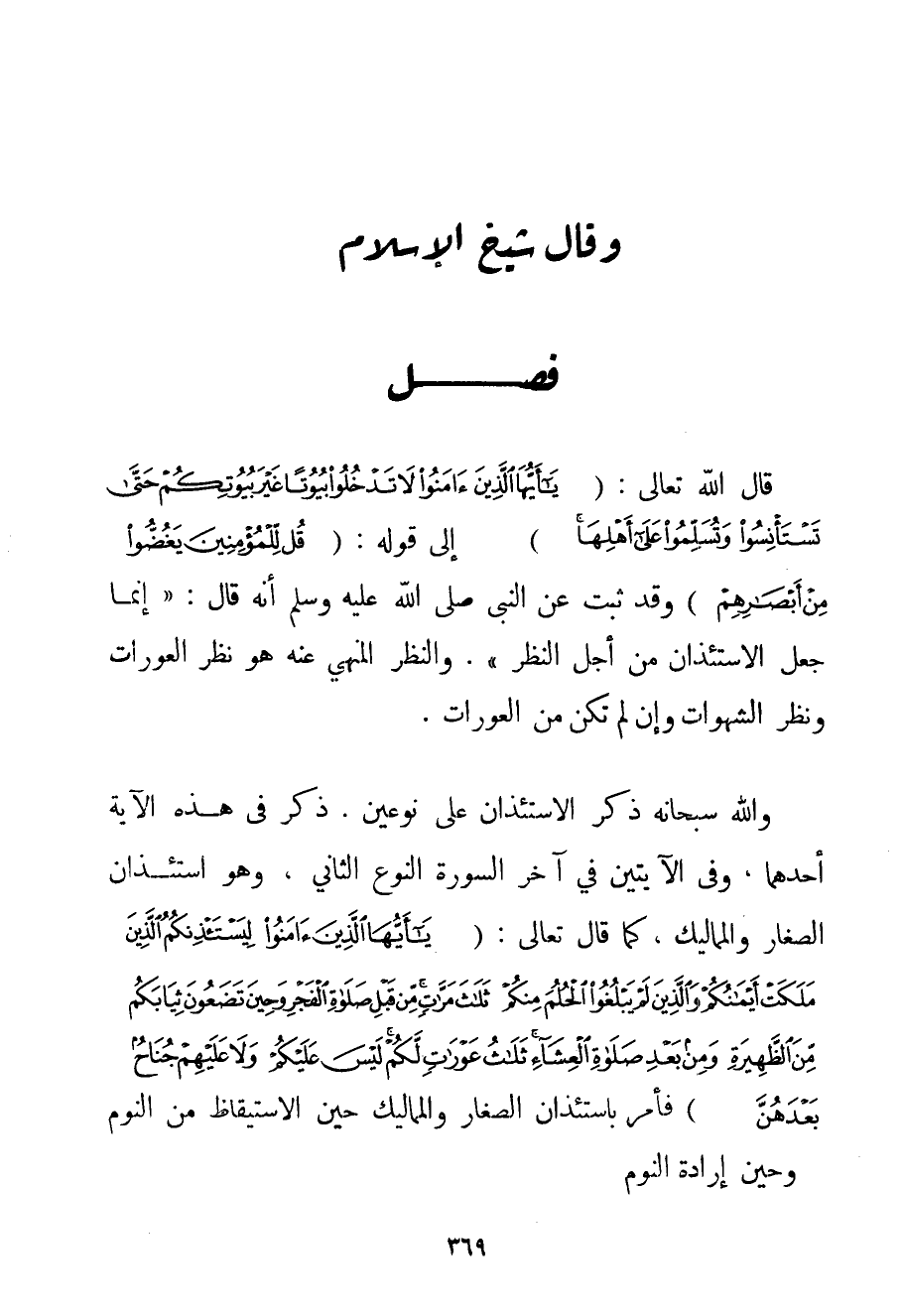 قَالَ اللَّهُ تَعَالَى: {يَا أَيُّهَا الَّذِينَ آمَنُوا لَا تَدْخُلُوا بُيُوتًا غَيْرَ بُيُوتِكُمْ حَتَّى تَسْتَأْنِسُوا وَتُسَلِّمُوا عَلَى أَهْلِهَا} إلَى قَوْلِهِ: {قُلْ لِلْمُؤْمِنِينَ يَغُضُّوا مِنْ أَبْصَارِهِمْ} وَقَدْ ثَبَتَ عَنْ النَّبِيِّ صَلَّى اللَّهُ عَلَيْهِ وَسَلَّمَ أَنَّهُ قَالَ: {إنَّمَا جُعِلَ الِاسْتِئْذَانُ مِنْ أَجْلِ النَّظَرِ} . وَالنَّظَرُ الْمَنْهِيُّ عَنْهُ هُوَ نَظَرُ الْعَوْرَاتِ وَنَظَرُ الشَّهَوَاتِ وَإِنْ لَمْ تَكُنْ مِنْ الْعَوْرَاتِ. وَاَللَّهُ سُبْحَانَهُ ذَكَرَ الِاسْتِئْذَانَ عَلَى نَوْعَيْنِ. ذَكَرَ فِي هَذِهِ الْآيَةِ أَحَدَهُمَا وَفِي الْآيَتَيْنِ فِي آخِرِ السُّورَةِ النَّوْعَ الثَّانِيَ وَهُوَ اسْتِئْذَانُ الصِّغَارِ وَالْمَمَالِيكِ كَمَا قَالَ تَعَالَى: {يَا أَيُّهَا الَّذِينَ آمَنُوا لِيَسْتَأْذِنْكُمُ الَّذِينَ مَلَكَتْ أَيْمَانُكُمْ وَالَّذِينَ لَمْ يَبْلُغُوا الْحُلُمَ مِنْكُمْ ثَلَاثَ مَرَّاتٍ مِنْ قَبْلِ صَلَاةِ الْفَجْرِ وَحِينَ تَضَعُونَ ثِيَابَكُمْ مِنَ الظَّهِيرَةِ وَمِنْ بَعْدِ صَلَاةِ الْعِشَاءِ ثَلَاثُ عَوْرَاتٍ لَكُمْ لَيْسَ عَلَيْكُمْ وَلَا عَلَيْهِمْ جُنَاحٌ بَعْدَهُنَّ} فَأَمَرَ بِاسْتِئْذَانِ الصِّغَارِ وَالْمَمَالِيكِ حِينَ الِاسْتِيقَاظِ مِنْ النَّوْمِ وَحِينَ إرَادَةِ النَّوْمِ،