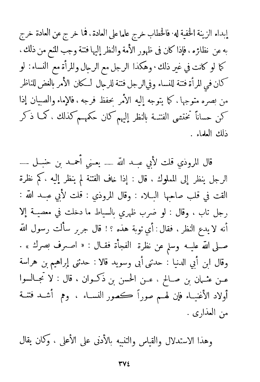 إبْدَاءُ الزِّينَةِ الْخَفِيَّةِ لَهُ فَالْخِطَابُ خَرَجَ عَامًّا عَلَى الْعَادَةِ فَمَا خَرَجَ عَنْ الْعَادَةِ خَرَجَ بِهِ عَنْ نَظَائِرِهِ فَإِذَا كَانَ فِي ظُهُورِ الْأَمَةِ وَالنَّظَرِ إلَيْهَا فِتْنَةٌ وَجَبَ الْمَنْعُ مِنْ ذَلِكَ كَمَا لَوْ كَانَتْ فِي غَيْرِ ذَلِكَ وَهَكَذَا الرَّجُلُ مَعَ الرِّجَالِ وَالْمَرْأَةُ مَعَ النِّسَاءِ: لَوْ كَانَ فِي الْمَرْأَةِ فِتْنَةٌ لِلنِّسَاءِ وَفِي الرَّجُلِ فِتْنَةٌ لِلرِّجَالِ لَكَانَ الْأَمْرُ بِالْغَضِّ لِلنَّاظِرِ مِنْ بَصَرِهِ مُتَوَجِّهًا كَمَا يَتَوَجَّهُ إلَيْهِ الْأَمْرُ بِحِفْظِ فَرْجِهِ فَالْإِمَاءُ وَالصِّبْيَانُ إذَا كُنَّ حِسَانًا تختشى الْفِتْنَةُ بِالنَّظَرِ إلَيْهِمْ كَانَ حُكْمُهُمْ كَذَلِكَ كَمَا ذَكَرَ ذَلِكَ الْعُلَمَاءُ