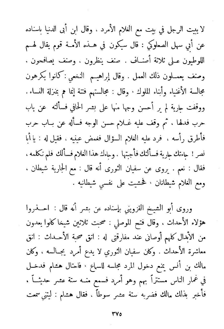 لَا يَبِيتُ الرَّجُلُ فِي بَيْتٍ مَعَ الْغُلَامِ الْأَمْرَدِ وَقَالَ ابْنُ أَبِي الدُّنْيَا بِإِسْنَادِهِ عَنْ أَبِي سَهْلٍ الصعلوكي: قَالَ سَيَكُونُ فِي هَذِهِ الْأُمَّةِ قَوْمٌ يُقَالُ لَهُمْ اللُّوطِيُّونَ عَلَى ثَلَاثَةِ أَصْنَافٍ. صِنْفٌ يَنْظُرُونَ وَصِنْفٌ يُصَافِحُونَ وَصِنْفٌ يَعْمَلُونَ ذَلِكَ الْعَمَلَ. وَقَالَ إبْرَاهِيمُ النَّخَعِي: كَانُوا يَكْرَهُونَ مُجَالَسَةَ الْأَغْنِيَاءِ وَأَبْنَاءِ الْمُلُوكِ وَقَالَ: مُجَالَسَتُهُمْ فِتْنَةٌ إنَّمَا هُمْ بِمَنْزِلَةِ النِّسَاءِ. وَوَقَفَتْ جَارِيَةٌ لَمْ يُرَ أَحْسَنُ وَجْهًا مِنْهَا عَلَى بِشْرٍ الْحَافِي فَسَأَلَتْهُ عَنْ بَابِ حَرْبٍ فَدَلَّهَا ثُمَّ وَقَفَ عَلَيْهِ غُلَامٌ حَسَنُ الْوَجْهِ فَسَأَلَهُ عَنْ بَابِ حَرْبٍ فَأَطْرَقَ رَأْسَهُ فَرَدَّ عَلَيْهِ الْغُلَامُ السُّؤَالَ فَغَمَّضَ عَيْنَيْهِ فَقِيلَ لَهُ: يَا أَبَا نَصْرٍ جَاءَتْك جَارِيَةٌ فَسَأَلَتْك فَأَجَبْتهَا وَجَاءَك هَذَا الْغُلَامُ فَسَأَلَك فَلَمْ تُكَلِّمْهُ فَقَالَ: نَعَمْ. يُرْوَى عَنْ سُفْيَانِ الثَّوْرِيِّ أَنَّهُ قَالَ: مَعَ الْجَارِيَةِ شَيْطَانٌ وَمَعَ الْغُلَامِ شَيْطَانَانِ فَخَشِيت عَلَى نَفْسِي شَيْطَانَيْهِ. وَرَوَى أَبُو الشَّيْخِ الْقَزْوِينِيُّ بِإِسْنَادِهِ عَنْ بِشْرٍ أَنَّهُ قَالَ: احْذَرُوا هَؤُلَاءِ الْأَحْدَاثَ وَقَالَ فَتْحٌ الْمُوصِلِيُّ: صَحِبْت ثَلَاثِينَ شَيْخًا كَانُوا يُعَدُّونَ مِنْ الْأَبْدَالِ كُلُّهُمْ أَوْصَانِي عِنْدَ مُفَارَقَتِي لَهُ: اتَّقِ صُحْبَةَ الْأَحْدَاثِ: اتَّقِ مُعَاشَرَةَ الْأَحْدَاثِ. وَكَانَ سُفْيَانُ الثَّوْرِيُّ لَا يَدَعُ أَمْرَدَ يُجَالِسُهُ وَكَانَ مَالِكُ بْنُ أَنَسٍ يَمْنَعُ دُخُولَ الْمُرْدِ مَجْلِسَهُ لِلسَّمَاعِ فَاحْتَالَ هِشَامٌ فَدَخَلَ فِي غِمَارِ النَّاسِ مُسْتَتِرًا بِهِمْ وَهُوَ أَمَرَدُ فَسَمِعَ مِنْهُ سِتَّةَ عَشَرَ حَدِيثًا فَأَخْبَرَ بِذَلِكَ مَالِكٌ فَضَرَبَهُ سِتَّةَ عَشَرً سَوْطًا فَقَالَ هِشَامٌ: لَيْتَنِي سَمِعْت