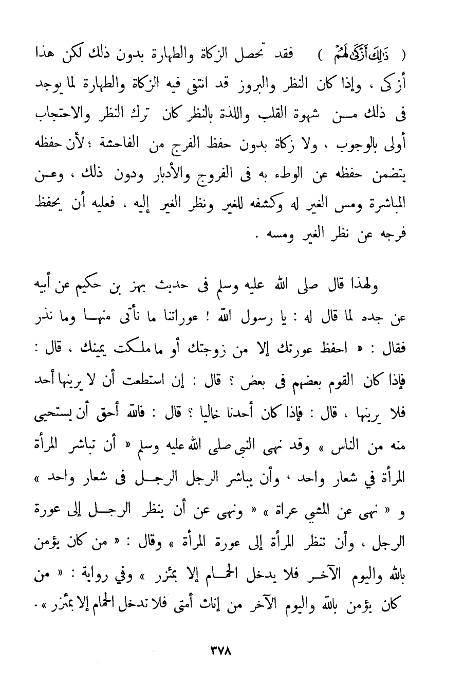 {ذَلِكَ أَزْكَى لَهُمْ} فَقَدْ تَحْصُلُ الزَّكَاةُ وَالطَّهَارَةُ بِدُونِ ذَلِكَ لَكِنَّ هَذَا أَزْكَى وَإِذَا كَانَ النَّظَرُ وَالْبُرُوزُ قَدْ انْتَفَى فِيهِ الزَّكَاةُ وَالطَّهَارَةُ لِمَا يُوجَدُ فِي ذَلِكَ مِنْ شَهْوَةِ الْقَلْبِ وَاللَّذَّةِ بِالنَّظَرِ كَانَ تَرْكُ النَّظَرِ وَالِاحْتِجَابُ أَوْلَى بِالْوُجُوبِ وَلَا زَكَاةَ بِدُونِ حِفْظِ الْفَرْجِ مِنْ الْفَاحِشَةِ؛ لِأَنَّ حِفْظَهُ يَتَضَمَّنُ حِفْظَهُ عَنْ الْوَطْءِ بِهِ فِي الْفُرُوجِ وَالْأَدْبَارِ وَدُونَ ذَلِكَ وَعَنْ الْمُبَاشَرَةِ وَمَسِّ الْغَيْرِ لَهُ وَكَشْفِهِ لِلْغَيْرِ وَنَظَرِ الْغَيْرِ إلَيْهِ فَعَلَيْهِ أَنْ يَحْفَظَ فَرْجَهُ عَنْ نَظَرِ الْغَيْرِ وَمَسِّهِ. وَلِهَذَا قَالَ صَلَّى اللَّهُ عَلَيْهِ وَسَلَّمَ فِي حَدِيثِ {بَهْزِ بْنِ حَكِيمٍ عَنْ أَبِيهِ عَنْ جَدِّهِ لَمَّا قَالَ لَهُ: يَا رَسُولَ اللَّهِ عَوْرَاتُنَا مَا نَأْتِي مِنْهَا وَمَا نَذَرُ فَقَالَ: احْفَظْ عَوْرَتَك إلَّا مِنْ زَوْجَتِك أَوْ مَا مَلَكَتْ يَمِينُك قَالَ: فَإِذَا كَانَ الْقَوْمُ بَعْضَهُمْ فِي بَعْضٍ؟ قَالَ: إنْ اسْتَطَعْت أَنْ لَا يَرَيَنَّهَا أَحَدٌ فَلَا يَرَيَنَّهَا قَالَ: فَإِذَا كَانَ أَحَدُنَا خَالِيًا؟ قَالَ: فَاَللَّهُ أَحَقُّ أَنْ يُسْتَحَيَا مِنْهُ مِنْ النَّاسِ} وَقَدْ {نَهَى النَّبِيُّ صَلَّى اللَّهُ عَلَيْهِ وَسَلَّمَ أَنْ تُبَاشِرَ الْمَرْأَةُ الْمَرْأَةَ فِي شِعَارٍ وَاحِدٍ وَأَنْ يُبَاشِرَ الرَّجُلُ الرَّجُلَ فِي شِعَارٍ وَاحِدٍ} و {نَهَى عَنْ الْمَشْيِ عُرَاةً} {وَنَهَى عَنْ أَنْ يَنْظُرَ الرَّجُلُ إلَى عَوْرَةِ الرَّجُلِ وَأَنْ تَنْظُرَ الْمَرْأَةُ إلَى عَوْرَةِ الْمَرْأَةِ} وَقَالَ: {مَنْ كَانَ يُؤْمِنُ بِاَللَّهِ وَالْيَوْمِ الْآخِرِ فَلَا يَدْخُلُ الْحَمَّامَ إلَّا بِمِئْزَرِ} وَفِي رِوَايَةٍ: {مَنْ كَانَ يُؤْمِنُ بِاَللَّهِ وَالْيَوْمِ الْآخِرِ مِنْ إنَاثِ أُمَّتِي فَلَا تَدْخُلُ الْحَمَّامَ إلَّا بِمِئْزَرِ} .