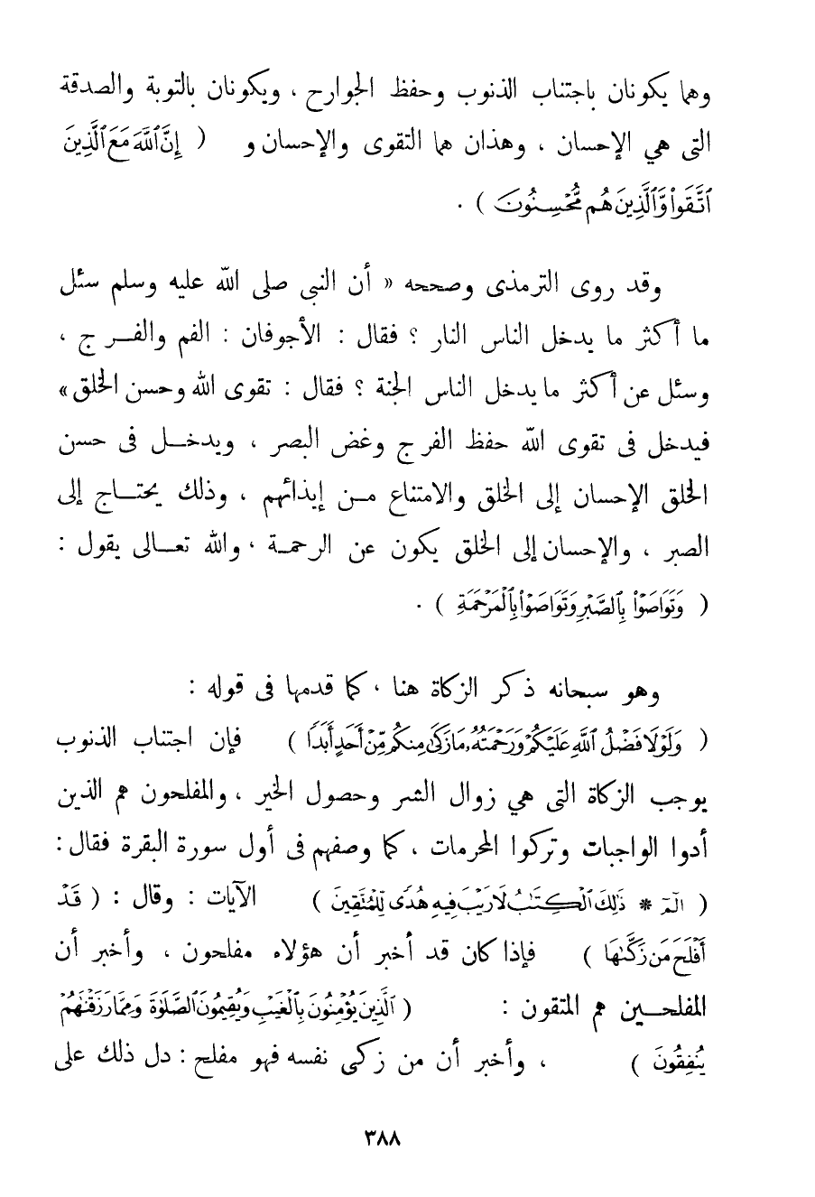 وَهُمَا يَكُونَانِ بِاجْتِنَابِ الذُّنُوبِ وَحِفْظِ الْجَوَارِحِ وَيَكُونَانِ بِالتَّوْبَةِ وَالصَّدَقَةِ الَّتِي هِيَ الْإِحْسَانُ وَهَذَانِ هُمَا التَّقْوَى وَالْإِحْسَانُ و {إنَّ اللَّهَ مَعَ الَّذِينَ اتَّقَوْا وَالَّذِينَ هُمْ مُحْسِنُونَ} . وَقَدْ رَوَى التِّرْمِذِيُّ وَصَحَّحَهُ {أَنَّ النَّبِيَّ صَلَّى اللَّهُ عَلَيْهِ وَسَلَّمَ سُئِلَ مَا أَكْثَرُ مَا يُدْخِلُ النَّاسَ النَّارَ؟ فَقَالَ: الْأَجْوَفَانِ: الْفَمُ وَالْفَرْجُ وَسُئِلَ عَنْ أَكْثَرِ مَا يُدْخِلُ النَّاسَ الْجَنَّةَ؟ فَقَالَ: تَقْوَى اللَّهِ وَحُسْنُ الْخُلُقِ} فَيَدْخُلُ فِي تَقْوَى اللَّهِ حِفْظُ الْفَرْجِ وَغَضُّ الْبَصَرِ وَيَدْخُلُ فِي حُسْنِ الْخُلُقِ الْإِحْسَانُ إلَى الْخَلْقِ وَالِامْتِنَاعُ مِنْ إيذَائِهِمْ وَذَلِكَ يَحْتَاجُ إلَى الصَّبْرِ وَالْإِحْسَانُ إلَى الْخَلْقِ يَكُونُ عَنْ الرَّحْمَةِ وَاَللَّهُ تَعَالَى يَقُولُ: {وَتَوَاصَوْا بِالصَّبْرِ وَتَوَاصَوْا بِالْمَرْحَمَةِ} . وَهُوَ سُبْحَانَهُ ذَكَرَ الزَّكَاةَ هُنَا كَمَا قَدَّمَهَا فِي قَوْلِهِ: {وَلَوْلَا فَضْلُ اللَّهِ عَلَيْكُمْ وَرَحْمَتُهُ مَا زَكَا مِنْكُمْ مِنْ أَحَدٍ أَبَدًا} فَإِنَّ اجْتِنَابَ الذُّنُوبِ يُوجِبُ الزَّكَاةَ الَّتِي هِيَ زَوَالُ الشَّرِّ وَحُصُولُ الْخَيْرِ وَالْمُفْلِحُونَ هُمْ الَّذِينَ أَدَّوْا الْوَاجِبَاتِ وَتَرَكُوا الْمُحَرَّمَاتِ كَمَا وَصَفَهُمْ فِي أَوَّلِ سُورَةِ الْبَقَرَةِ فَقَالَ: {الم} {ذَلِكَ الْكِتَابُ لَا رَيْبَ فِيهِ هُدًى لِلْمُتَّقِينَ} الْآيَاتُ: وَقَالَ: {قَدْ أَفْلَحَ مَنْ زَكَّاهَا} فَإِذَا كَانَ قَدْ أَخْبَرَ أَنَّ هَؤُلَاءِ مُفْلِحُونَ وَأَخْبَرَ أَنَّ الْمُفْلِحِينَ هُمْ الْمُتَّقُونَ: {الَّذِينَ يُؤْمِنُونَ بِالْغَيْبِ وَيُقِيمُونَ الصَّلَاةَ وَمِمَّا رَزَقْنَاهُمْ يُنْفِقُونَ} وَأَخْبَرَ أَنَّ مَنْ زَكَّى نَفْسَهُ فَهُوَ مُفْلِحٌ: دَلَّ ذَلِكَ عَلَى