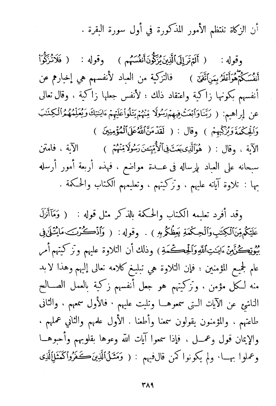 أَنَّ الزَّكَاةَ تَنْتَظِمُ الْأُمُورَ الْمَذْكُورَةَ فِي أَوَّلِ سُورَةِ الْبَقَرَةِ. وَقَوْلُهُ: {أَلَمْ تَرَ إلَى الَّذِينَ يُزَكُّونَ أَنْفُسَهُمْ} وَقَوْلُهُ: {فَلَا تُزَكُّوا أَنْفُسَكُمْ هُوَ أَعْلَمُ بِمَنِ اتَّقَى} فَالتَّزْكِيَةُ مِنْ الْعِبَادِ لِأَنْفُسِهِمْ هِيَ إخْبَارُهُمْ عَنْ أَنْفُسِهِمْ بِكَوْنِهَا زَاكِيَةً وَاعْتِقَادُ ذَلِكَ؛ لَا نَفْسُ جَعْلِهَا زَاكِيَةً وَقَالَ تَعَالَى عَنْ إبْرَاهِيمَ: {رَبَّنَا وَابْعَثْ فِيهِمْ رَسُولًا مِنْهُمْ يَتْلُو عَلَيْهِمْ آيَاتِكَ وَيُعَلِّمُهُمُ الْكِتَابَ وَالْحِكْمَةَ وَيُزَكِّيهِمْ} وَقَالَ: {لَقَدْ مَنَّ اللَّهُ عَلَى الْمُؤْمِنِينَ} الْآيَةُ وَقَالَ: {هُوَ الَّذِي بَعَثَ فِي الْأُمِّيِّينَ رَسُولًا مِنْهُمْ} الْآيَةُ فَامْتَنَّ سُبْحَانَهُ عَلَى الْعِبَادِ بِإِرْسَالِهِ فِي عِدَّةِ مَوَاضِعَ فَهَذِهِ أَرْبَعَةُ أُمُورٍ أَرْسَلَهُ بِهَا: تِلَاوَةُ آيَاتِهِ عَلَيْهِمْ وَتَزْكِيَتُهُمْ وَتَعْلِيمُهُمْ الْكِتَابَ وَالْحِكْمَةَ. وَقَدْ أَفْرَدَ تَعْلِيمَهُ الْكِتَابَ وَالْحِكْمَةَ بِالذِّكْرِ مِثْلَ قَوْلِهِ: {وَمَا أَنْزَلَ عَلَيْكُمْ مِنَ الْكِتَابِ وَالْحِكْمَةِ يَعِظُكُمْ بِهِ} . وَقَوْلِهِ: {وَاذْكُرْنَ مَا يُتْلَى فِي بُيُوتِكُنَّ مِنْ آيَاتِ اللَّهِ وَالْحِكْمَةِ} وَذَلِكَ أَنَّ التِّلَاوَةَ عَلَيْهِمْ وَتَزْكِيَتَهُمْ أَمْرٌ عَامٌّ لِجَمِيعِ الْمُؤْمِنِينَ؛ فَإِنَّ التِّلَاوَةَ هِيَ تَبْلِيغُ كَلَامِهِ تَعَالَى إلَيْهِمْ وَهَذَا لَا بُدَّ مِنْهُ لِكُلِّ مُؤْمِنٍ وَتَزْكِيَتُهُمْ هُوَ جَعْلُ أَنْفُسِهِمْ زَكِيَّةً بِالْعَمَلِ الصَّالِحِ النَّاشِئِ عَنْ الْآيَاتِ الَّتِي سَمِعُوهَا وَتُلِيَتْ عَلَيْهِمْ فَالْأَوَّلُ سَمْعُهُمْ وَالثَّانِي طَاعَتُهُمْ وَالْمُؤْمِنُونَ يَقُولُونَ سَمِعْنَا وَأَطَعْنَا. الْأَوَّلُ عِلْمُهُمْ وَالثَّانِي عَمَلُهُمْ وَالْإِيمَانُ قَوْلٌ وَعَمَلٌ فَإِذَا سَمِعُوا آيَاتِ اللَّهِ وَعَوْهَا بِقُلُوبِهِمْ وَأَحَبُّوهَا وَعَمِلُوا بِهَا وَلَمْ يَكُونُوا كَمَنْ قَالَ فِيهِمْ: {وَمَثَلُ الَّذِينَ كَفَرُوا كَمَثَلِ