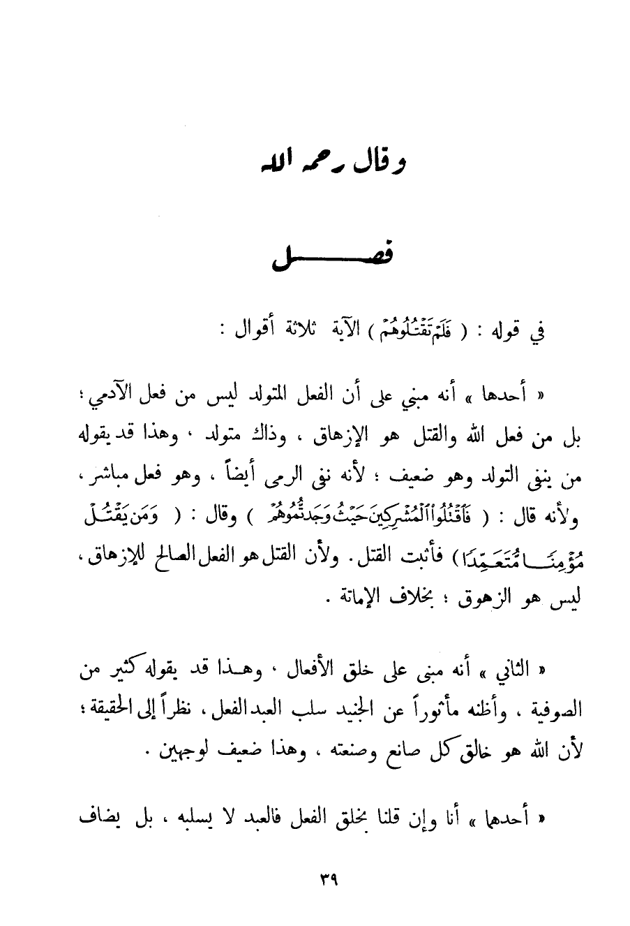 فِي قَوْلِهِ: {فَلَمْ تَقْتُلُوهُمْ} الْآيَةُ ثَلَاثَةُ أَقْوَالٍ: " أَحَدُهَا " أَنَّهُ مَبْنِيٌّ عَلَى أَنَّ الْفِعْلَ الْمُتَوَلِّدَ لَيْسَ مِنْ فِعْلِ الْآدَمِيِّ؛ بَلْ مِنْ فِعْلِ اللَّهِ وَالْقَتْلُ هُوَ الْإِزْهَاقُ وَذَاكَ مُتَوَلِّدٌ وَهَذَا قَدْ يَقُولُهُ مَنْ يَنْفِي التَّوَلُّدَ وَهُوَ ضَعِيفٌ؛ لِأَنَّهُ نَفَى الرَّمْيَ أَيْضًا وَهُوَ فِعْلٌ مُبَاشِرٌ وَلِأَنَّهُ قَالَ: {فَاقْتُلُوا الْمُشْرِكِينَ حَيْثُ وَجَدْتُمُوهُمْ} وَقَالَ: {وَمَنْ يَقْتُلْ مُؤْمِنًا مُتَعَمِّدًا} فَأَثْبَتَ الْقَتْلَ. وَلِأَنَّ الْقَتْلَ هُوَ الْفِعْلُ الصَّالِحُ لِلْإِزْهَاقِ لَيْسَ هُوَ الزُّهُوقُ؛ بِخِلَافِ الْإِمَاتَةِ. " الثَّانِي " أَنَّهُ مَبْنِيٌّ عَلَى خَلْقِ الْأَفْعَالِ وَهَذَا قَدْ يَقُولُهُ كَثِيرٌ مِنْ الصُّوفِيَّةِ وَأَظُنُّهُ مَأْثُورًا عَنْ الْجُنَيْد سَلَبَ الْعَبْدَ الْفِعْلَ نَظَرًا إلَى الْحَقِيقَةِ؛ لِأَنَّ اللَّهَ هُوَ خَالِقُ كُلِّ صَانِعٍ وَصَنْعَتِهِ وَهَذَا ضَعِيفٌ لِوَجْهَيْنِ. " أَحَدُهُمَا " أَنَّا وَإِنْ قُلْنَا بِخَلْقِ الْفِعْلِ فَالْعَبْدُ لَا يُسْلَبُهُ بَلْ يُضَافُ