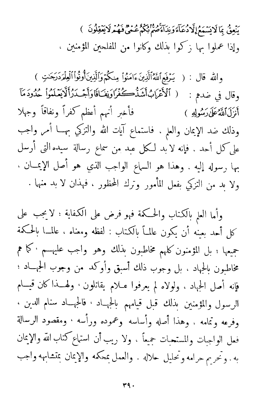 وَأَمَّا الْعِلْمُ بِالْكِتَابِ وَالْحِكْمَةِ فَهُوَ فَرْضٌ عَلَى الْكِفَايَةِ؛ لَا يَجِبُ عَلَى كُلِّ أَحَدٍ بِعَيْنِهِ أَنْ يَكُونَ عَالِمًا بِالْكِتَابِ: لَفْظُهُ وَمَعْنَاهُ عَالِمًا بِالْحِكْمَةِ جَمِيعِهَا؛ بَلْ الْمُؤْمِنُونَ كُلُّهُمْ مُخَاطَبُونَ بِذَلِكَ وَهُوَ وَاجِبٌ عَلَيْهِمْ كَمَا هُمْ مُخَاطَبُونَ بِالْجِهَادِ بَلْ وُجُوبُ ذَلِكَ أَسْبَقُ وَأَوْكَدُ مِنْ وُجُوبِ الْجِهَادِ؛ فَإِنَّهُ أَصْلُ الْجِهَادِ وَلَوْلَاهُ لَمْ يَعْرِفُوا عَلَامَ يُقَاتِلُونَ وَلِهَذَا كَانَ قِيَامُ الرَّسُولِ وَالْمُؤْمِنِينَ بِذَلِكَ قَبْلَ قِيَامِهِمْ بِالْجِهَادِ فَالْجِهَادُ سَنَامُ الدِّينِ وَفَرْعُهُ وَتَمَامُهُ وَهَذَا أَصْلُهُ وَأَسَاسُهُ وَعَمُودُهُ وَرَأْسُهُ وَمَقْصُودُ الرِّسَالَةِ فِعْلُ الْوَاجِبَاتِ والمستحبات جَمِيعًا وَلَا رَيْبَ أَنَّ اسْتِمَاعَ كِتَابِ اللَّهِ وَالْإِيمَانَ بِهِ وَتَحْرِيمَ حَرَامِهِ وَتَحْلِيلَ حَلَالِهِ. وَالْعَمَلَ بِمُحْكِمِهِ وَالْإِيمَانَ بِمُتَشَابِهِهِ وَاجِبٌ