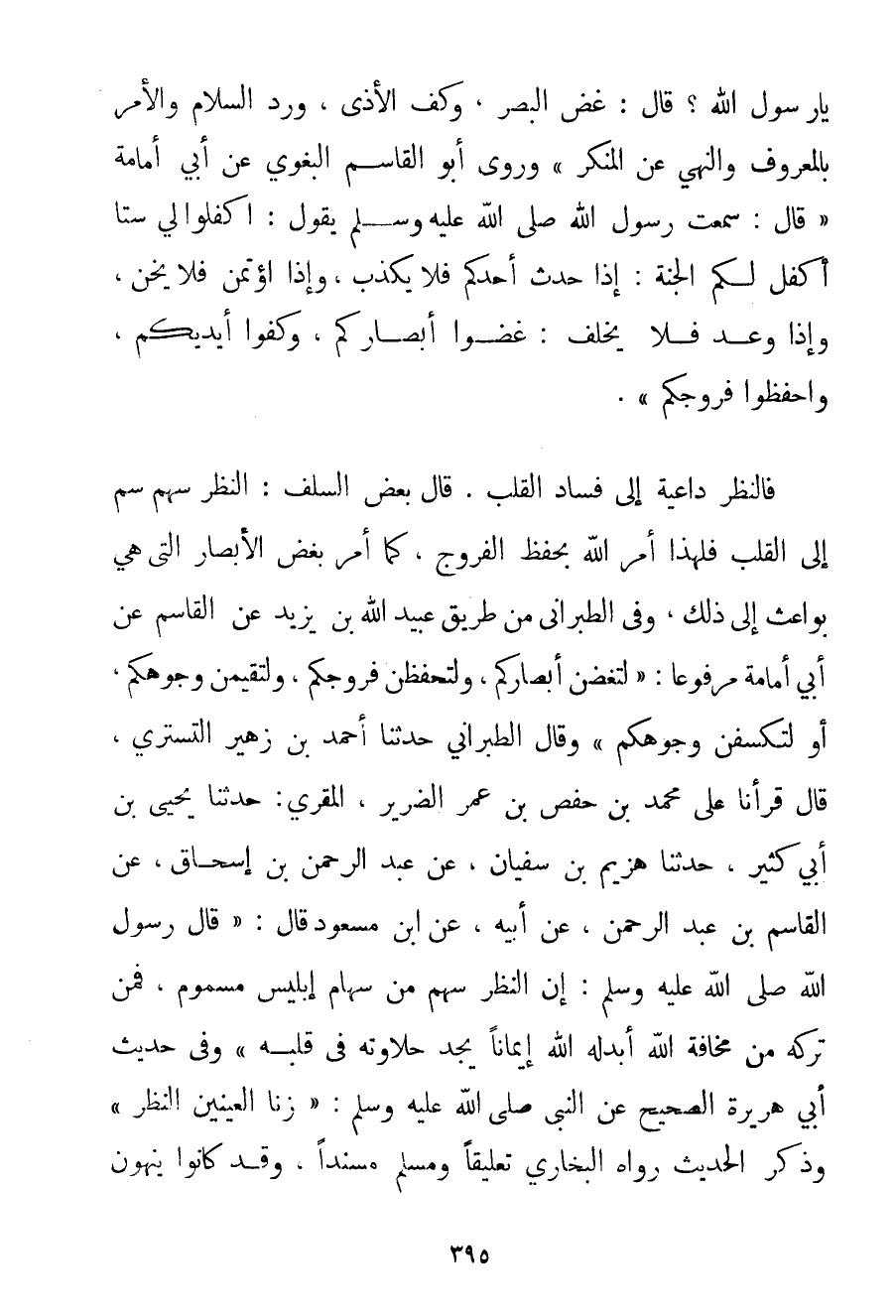 يَا رَسُولَ اللَّهِ؟ قَالَ: غَضُّ الْبَصَرِ وَكَفُّ الْأَذَى وَرَدُّ السَّلَامِ وَالْأَمْرُ بِالْمَعْرُوفِ وَالنَّهْيُ عَنْ الْمُنْكَرِ} وَرَوَى أَبُو الْقَاسِمِ البغوي عَنْ {أَبِي أمامة قَالَ: سَمِعْت رَسُولَ اللَّهِ صَلَّى اللَّهُ عَلَيْهِ وَسَلَّمَ يَقُولُ: اُكْفُلُوا لِي سِتًّا أَكْفُلْ لَكُمْ الْجَنَّةَ: إذَا حَدَّثَ أَحَدُكُمْ فَلَا يَكْذِبُ وَإِذَا اُؤْتُمِنَ فَلَا يَخُنْ وَإِذَا وَعَدَ فَلَا يُخْلِفُ: غُضُّوا أَبْصَارَكُمْ وَكُفُّوا أَيْدِيَكُمْ وَاحْفَظُوا فُرُوجَكُمْ} . فَالنَّظَرُ دَاعِيَةٌ إلَى فَسَادِ الْقَلْبِ. قَالَ بَعْضُ السَّلَفِ: النَّظَرُ سَهْمُ سُمٍّ إلَى الْقَلْبِ فَلِهَذَا أَمَرَ اللَّهُ بِحِفْظِ الْفُرُوجِ كَمَا أَمَرَ بِغَضِّ الْأَبْصَارِ الَّتِي هِيَ بَوَاعِثُ إلَى ذَلِكَ وَفِي الطَّبَرَانِي مِنْ طَرِيقِ عُبَيْدِ اللَّهِ بْنِ يَزِيدَ عَنْ الْقَاسِمِ عَنْ أَبِي أمامة مَرْفُوعًا: {لَتَغُضُّنَّ أَبْصَارَكُمْ وَلَتَحْفَظُنَّ فُرُوجَكُمْ وَلَتُقِيمُنَّ وُجُوهَكُمْ أَوْ لَتُكْسَفَنَّ وُجُوهُكُمْ} وَقَالَ الطَّبَرَانِي حَدَّثَنَا أَحْمَد بْنُ زُهَيْرٍ التستري قَالَ قَرَأْنَا عَلَى مُحَمَّدِ بْنِ حَفْصِ بْنِ عُمَرَ الضَّرِيرِ الْمُقْرِي: حَدَّثَنَا يَحْيَى بْنُ أَبِي كَثِيرٍ حَدَّثَنَا هَزِيمُ بْنُ سُفْيَانَ عَنْ عَبْدِ الرَّحْمَنِ بْنِ إسْحَاقَ عَنْ الْقَاسِمِ بْنِ عَبْدِ الرَّحْمَنِ عَنْ أَبِيهِ عَنْ ابْنِ مَسْعُودٍ قَالَ: {قَالَ رَسُولُ اللَّهِ صَلَّى اللَّهُ عَلَيْهِ وَسَلَّمَ إنَّ النَّظَرَ سَهْمٌ مِنْ سِهَامِ إبْلِيسَ مَسْمُومٌ فَمَنْ تَرَكَهُ مِنْ مَخَافَةِ اللَّهِ أَبْدَلَهُ اللَّهُ إيمَانًا يَجِدُ حَلَاوَتَهُ فِي قَلْبِهِ} وَفِي حَدِيثِ أَبِي هُرَيْرَةَ الصَّحِيحِ عَنْ النَّبِيِّ صَلَّى اللَّهُ عَلَيْهِ وَسَلَّمَ {زِنَا الْعَيْنَيْنِ النَّظَرُ} وَذَكَرَ الْحَدِيثَ رَوَاهُ الْبُخَارِيُّ تَعْلِيقًا وَمُسْلِمٌ مُسْنَدًا وَقَدْ كَانُوا يُنْهُونَ