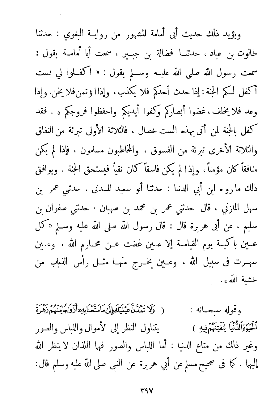 وَيُؤَيِّدُ ذَلِكَ حَدِيثُ أَبِي أمامة الْمَشْهُورُ مِنْ رِوَايَةِ البغوي: حَدَّثَنَا طَالُوتُ بْنُ عَبَّادٍ حَدَّثَنَا فَضَالَةُ بْنُ جُبَيْرٍ سَمِعْت أَبَا أمامة يَقُولُ: سَمِعْت رَسُولَ اللَّهِ صَلَّى اللَّهُ عَلَيْهِ وَسَلَّمَ يَقُولُ: {اُكْفُلُوا لِي بِسِتِّ أَكْفُلْ لَكُمْ الْجَنَّةَ: إذَا حَدَّثَ أَحَدُكُمْ فَلَا يَكْذِبْ وَإِذَا اُؤْتُمِنَ فَلَا يَخُنْ وَإِذَا وَعَدَ فَلَا يُخْلِفْ غُضُّوا أَبْصَارَكُمْ وَكُفُّوا أَيْدِيَكُمْ وَاحْفَظُوا فُرُوجَكُمْ} . فَقَدْ كَفَلَ بِالْجَنَّةِ لِمَنْ أَتَى بِهَذِهِ السِّتِّ خِصَالٍ فَالثَّلَاثَةُ الْأُولَى تَبْرِئَةٌ مِنْ النِّفَاقِ وَالثَّلَاثَةُ الْأُخْرَى تَبْرِئَةٌ مِنْ الْفُسُوقِ وَالْمُخَاطَبُونَ مُسْلِمُونَ فَإِذَا لَمْ يَكُنْ مُنَافِقًا كَانَ مُؤْمِنًا وَإِذَا لَمْ يَكُنْ فَاسِقًا كَانَ تَقِيًّا فَيَسْتَحِقُّ الْجَنَّةَ. وَيُوَافِقُ ذَلِكَ مَا رَوَاهُ ابْنُ أَبِي الدُّنْيَا: حَدَّثَنَا أَبُو سَعِيدٍ الْمَدَنِيُّ حَدَّثَنِي عُمَرُ بْنُ سَهْلٍ المازني قَالَ حَدَّثَنِي عُمَرُ بْنُ مُحَمَّدِ بْنِ صهبان حَدَّثَنِي صَفْوَانُ بْنُ سَلِيمٍ عَنْ أَبِي هُرَيْرَةَ قَالَ: قَالَ رَسُولُ اللَّهِ صَلَّى اللَّهُ عَلَيْهِ وَسَلَّمَ {كُلُّ عَيْنٍ بَاكِيَةٌ يَوْمَ الْقِيَامَةِ إلَّا عَيْنٌ غَضَّتْ عَنْ مَحَارِمِ اللَّهِ وَعَيْنٌ سَهِرَتْ فِي سَبِيلِ اللَّهِ وَعَيْنٌ يَخْرُجُ مِنْهَا مِثْلُ رَأْسِ الذُّبَابِ مِنْ خَشْيَةِ اللَّهِ} .