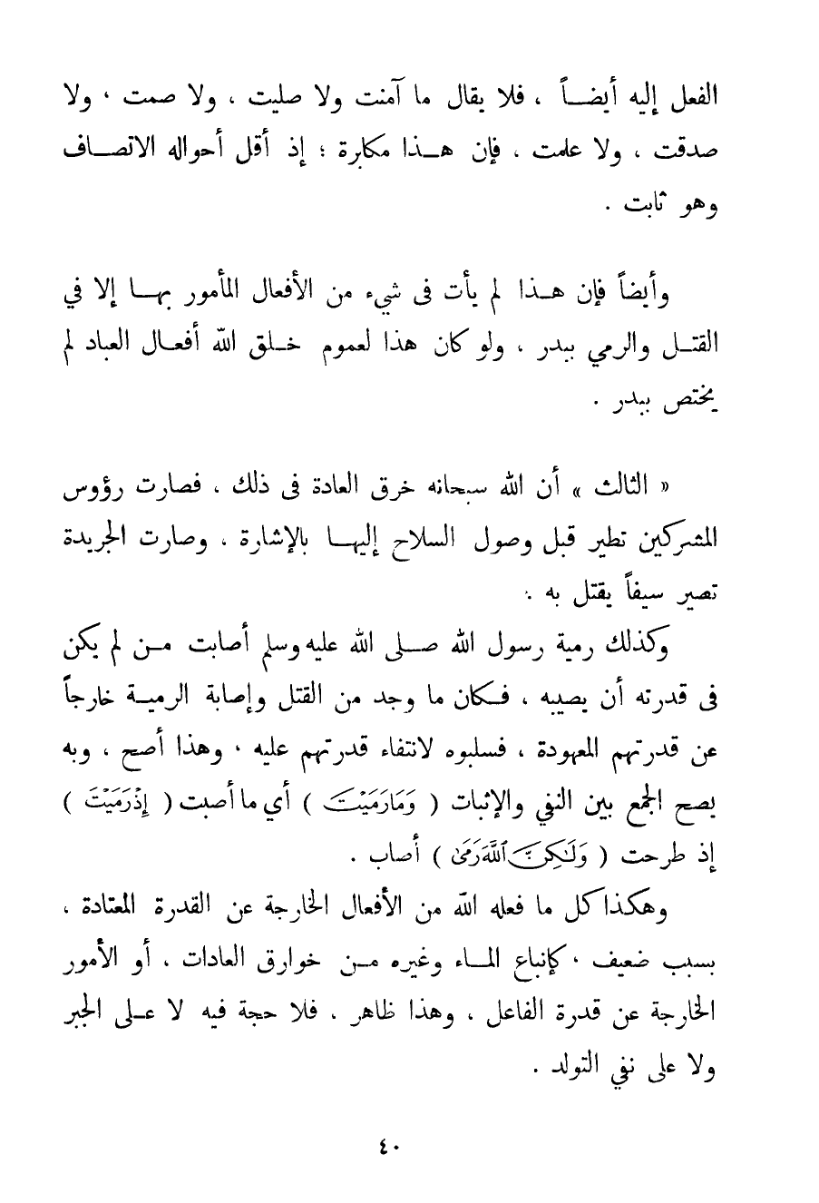 الْفِعْلُ إلَيْهِ أَيْضًا فَلَا يُقَالُ مَا آمَنْت وَلَا صَلَّيْت وَلَا صُمْت وَلَا صَدَّقْت وَلَا عَلِمْت فَإِنَّ هَذَا مُكَابَرَةٌ؛ إذْ أَقَلُّ أَحْوَالِهِ الِاتِّصَافُ وَهُوَ ثَابِتٌ. وَأَيْضًا فَإِنَّ هَذَا لَمْ يَأْتِ فِي شَيْءٍ مِنْ الْأَفْعَالِ الْمَأْمُورِ بِهَا إلَّا فِي الْقَتْلِ وَالرَّمْيِ بِبَدْرِ وَلَوْ كَانَ هَذَا لِعُمُومِ خَلْقِ اللَّهِ أَفْعَالَ الْعِبَادِ لَمْ يُخْتَصَّ بِبَدْرِ. " الثَّالِثُ " أَنَّ اللَّهَ سُبْحَانَهُ خَرَقَ الْعَادَةَ فِي ذَلِكَ فَصَارَتْ رُءُوسُ الْمُشْرِكِينَ تَطِيرُ قَبْلَ وُصُولِ السِّلَاحِ إلَيْهَا بِالْإِشَارَةِ وَصَارَتْ الْجَرِيدَةُ تَصِيرُ سَيْفًا يُقْتَلُ بِهِ. وَكَذَلِكَ رَمْيَةُ رَسُولِ اللَّهِ صَلَّى اللَّهُ عَلَيْهِ وَسَلَّمَ أَصَابَتْ مَنْ لَمْ يَكُنْ فِي قُدْرَتِهِ أَنْ يُصِيبَهُ فَكَانَ مَا وُجِدَ مِنْ الْقَتْلِ وَإِصَابَةِ الرَّمْيَةِ خَارِجًا عَنْ قُدْرَتِهِمْ الْمَعْهُودَةِ فَسُلِبُوهُ لِانْتِفَاءِ قُدْرَتِهِمْ عَلَيْهِ وَهَذَا أَصَحُّ وَبِهِ يَصِحُّ الْجَمْعُ بَيْنَ النَّفْيِ وَالْإِثْبَاتِ {وَمَا رَمَيْتَ} أَيْ مَا أَصَبْت {إذْ رَمَيْتَ} إذْ طَرَحْت {وَلَكِنَّ اللَّهَ رَمَى} أَصَابَ. وَهَكَذَا كُلُّ مَا فَعَلَهُ اللَّهُ مِنْ الْأَفْعَالِ الْخَارِجَةِ عَنْ الْقُدْرَةِ الْمُعْتَادَةِ بِسَبَبِ ضَعِيفٍ كَإِنْبَاعِ الْمَاءِ وَغَيْرِهِ مِنْ خَوَارِقِ الْعَادَاتِ أَوْ الْأُمُورِ الْخَارِجَةِ عَنْ قُدْرَةِ الْفَاعِلِ وَهَذَا ظَاهِرٌ فَلَا حُجَّةَ فِيهِ لَا عَلَى الْجَبْرِ وَلَا عَلَى نَفْيِ التَّوَلُّدِ.