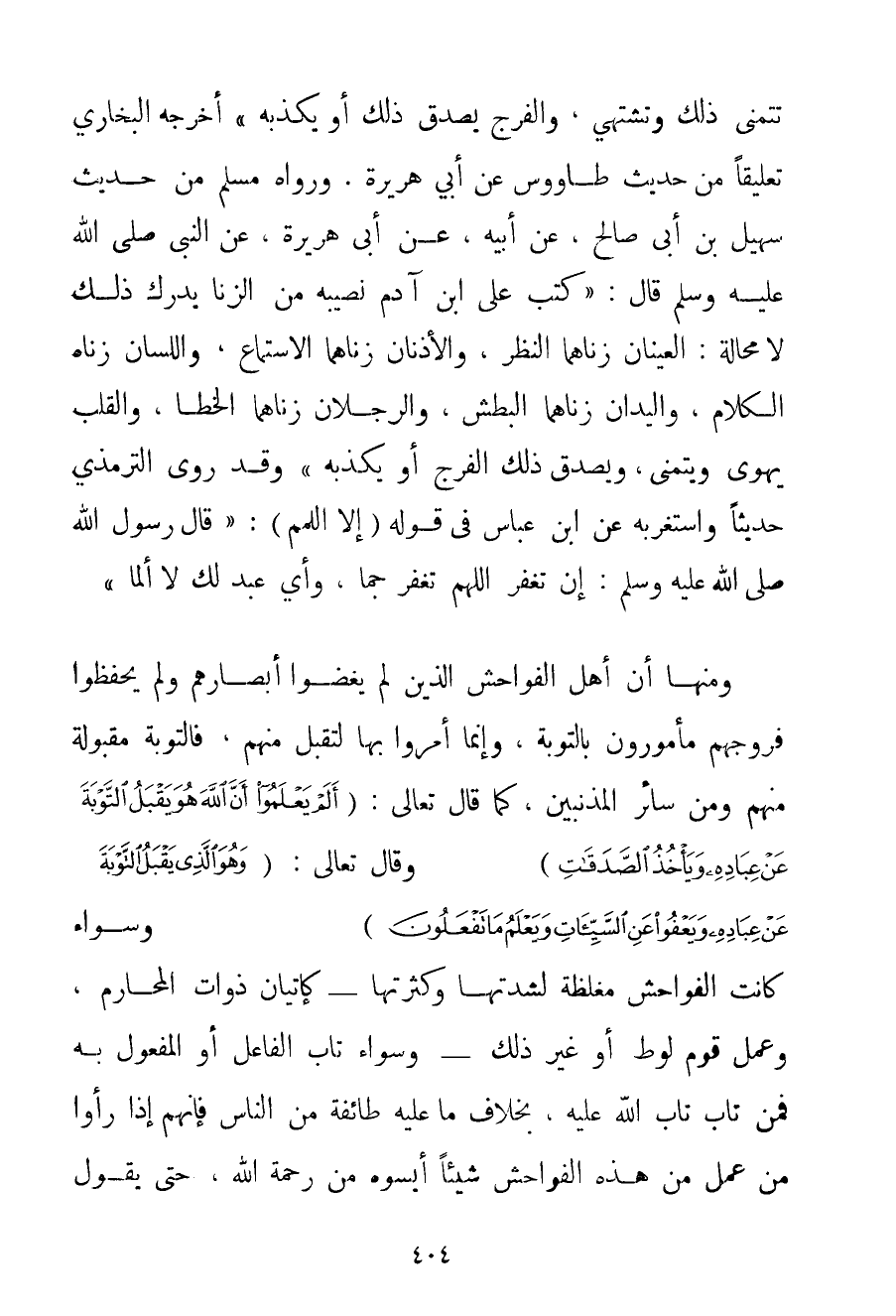 تَتَمَنَّى ذَلِكَ وَتَشْتَهِي وَالْفَرْجُ يُصَدِّقُ ذَلِكَ أَوْ يُكَذِّبُهُ} أَخْرَجَهُ الْبُخَارِيُّ تَعْلِيقًا مِنْ حَدِيثِ طَاوُوسٍ عَنْ أَبِي هُرَيْرَةَ. وَرَوَاهُ مُسْلِمٌ مِنْ حَدِيثِ سُهَيْلِ بْنِ أَبِي صَالِحٍ عَنْ أَبِيهِ عَنْ أَبِي هُرَيْرَةَ عَنْ النَّبِيِّ صَلَّى اللَّهُ عَلَيْهِ وَسَلَّمَ قَالَ: {كُتِبَ عَلَى ابْنِ آدَمَ نَصِيبُهُ مِنْ الزِّنَا يُدْرِكُ ذَلِكَ لَا مَحَالَةَ: الْعَيْنَانِ زِنَاهُمَا النَّظَرُ وَالْأُذُنَانِ زِنَاهُمَا الِاسْتِمَاعُ وَاللِّسَانُ زِنَاهُ الْكَلَامُ وَالْيَدَانِ زِنَاهُمَا الْبَطْشُ وَالرَّجُلَانِ زِنَاهُمَا الْخُطَى وَالْقَلْبُ يَهْوَى وَيَتَمَنَّى وَيُصَدِّقُ ذَلِكَ الْفَرْجُ أَوْ يُكَذِّبُهُ} وَقَدْ رَوَى التِّرْمِذِيُّ حَدِيثًا وَاسْتَغْرَبَهُ عَنْ ابْنِ عَبَّاسٍ فِي قَوْلِهِ {إلَّا اللَّمَمَ} {قَالَ رَسُولُ اللَّهِ صَلَّى اللَّهُ عَلَيْهِ وَسَلَّمَ إنْ تَغْفِرْ اللَّهُمَّ تَغْفِرْ جَمًّا وَأَيُّ عَبْدٍ لَك لَا أَلَمَّا.} وَمِنْهَا أَنَّ أَهْلَ الْفَوَاحِشِ الَّذِينَ لَمْ يَغُضُّوا أَبْصَارَهُمْ وَلَمْ يَحْفَظُوا فُرُوجَهُمْ مَأْمُورُونَ بِالتَّوْبَةِ وَإِنَّمَا أُمِرُوا بِهَا لِتُقْبَلَ مِنْهُمْ فَالتَّوْبَةُ مَقْبُولَةٌ مِنْهُمْ وَمِنْ سَائِرِ الْمُذْنِبِينَ كَمَا قَالَ تَعَالَى: {أَلَمْ يَعْلَمُوا أَنَّ اللَّهَ هُوَ يَقْبَلُ التَّوْبَةَ عَنْ عِبَادِهِ وَيَأْخُذُ الصَّدَقَاتِ} وَقَالَ تَعَالَى: {وَهُوَ الَّذِي يَقْبَلُ التَّوْبَةَ عَنْ عِبَادِهِ وَيَعْفُو عَنِ السَّيِّئَاتِ وَيَعْلَمُ مَا تَفْعَلُونَ} وَسَوَاءٌ كَانَتْ الْفَوَاحِشُ مُغَلَّظَةً لِشِدَّتِهَا وَكَثْرَتِهَا - كَإِتْيَانِ ذَوَاتِ الْمَحَارِمِ وَعَمَلِ قَوْمِ لُوطٍ أَوْ غَيْرِ ذَلِكَ - وَسَوَاءٌ تَابَ الْفَاعِلُ أَوْ الْمَفْعُولُ بِهِ فَمَنْ تَابَ تَابَ اللَّهُ عَلَيْهِ بِخِلَافِ مَا عَلَيْهِ طَائِفَةٌ مِنْ النَّاسِ فَإِنَّهُمْ إذَا رَأَوْا مَنْ عَمِلَ مِنْ هَذِهِ الْفَوَاحِشِ شَيْئًا أَيَّسُوهُ مِنْ رَحْمَةِ اللَّهِ