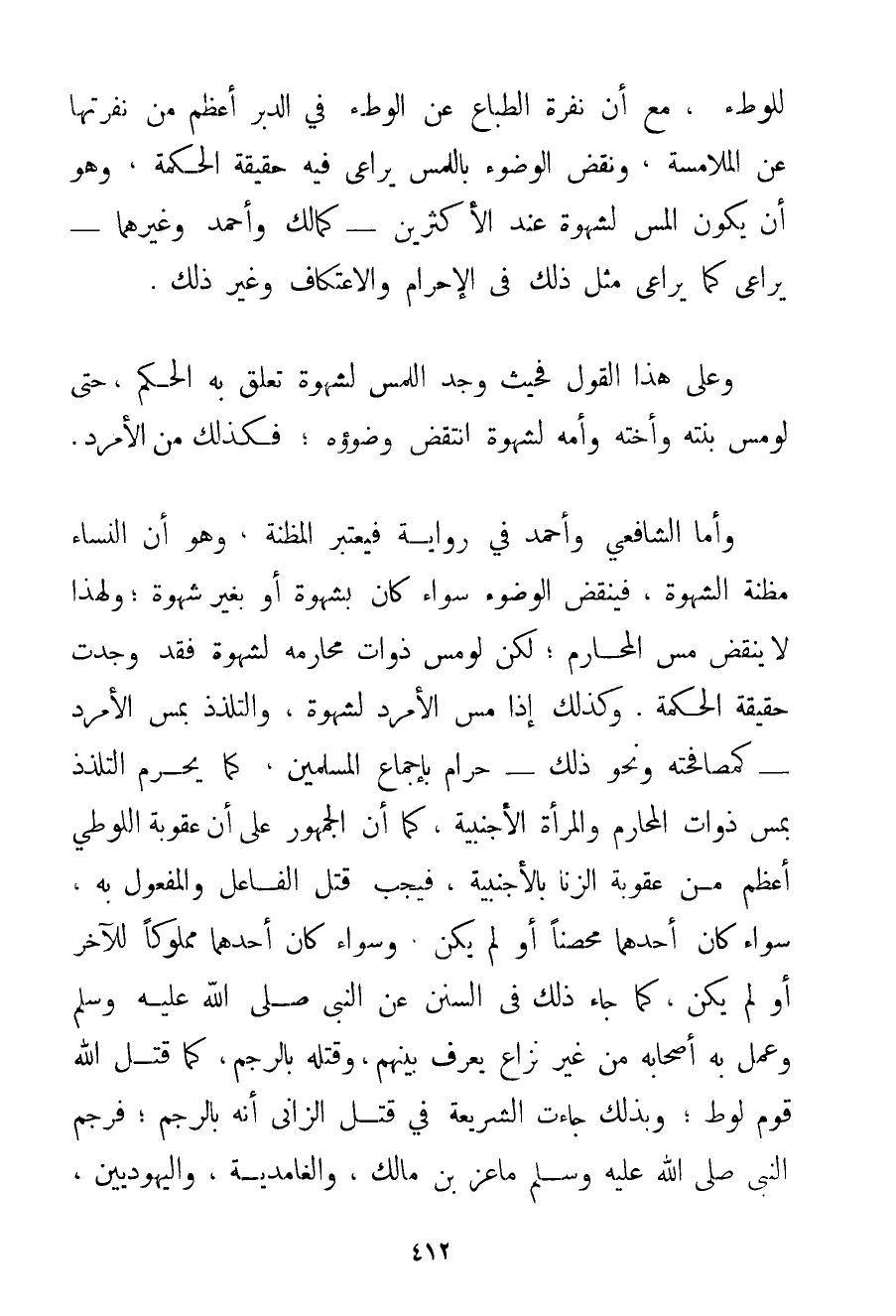 لِلْوَطْءِ مَعَ أَنَّ نُفْرَةَ الطِّبَاعِ عَنْ الْوَطْءِ فِي الدُّبُرِ أَعْظَمُ مِنْ نُفْرَتِهَا عَنْ الْمُلَامَسَةِ وَنَقْضُ الْوُضُوءِ بِاللَّمْسِ يُرَاعَى فِيهِ حَقِيقَةُ الْحِكْمَةِ وَهُوَ أَنْ يَكُونَ الْمَسُّ لِشَهْوَةِ عِنْدَ الْأَكْثَرِينَ - كَمَالِكِ وَأَحْمَد وَغَيْرِهِمَا - يُرَاعَى كَمَا يُرَاعَى مِثْلُ ذَلِكَ فِي الْإِحْرَامِ وَالِاعْتِكَافِ وَغَيْرِ ذَلِكَ. وَعَلَى هَذَا الْقَوْلِ فَحَيْثُ وُجِدَ اللَّمْسُ لِشَهْوَةِ تَعَلَّقَ بِهِ الْحُكْمُ حَتَّى لَوْ مَسَّ بِنْتِهِ وَأُخْتَه وَأُمَّهُ لِشَهْوَةِ انْتَقَضَ وَضَوْءُهُ؛ فَكَذَلِكَ مِنْ الْأَمْرَدِ. وَأَمَّا الشَّافِعِيُّ وَأَحْمَد فِي رِوَايَةٍ فَيُعْتَبَرُ الْمَظِنَّةُ وَهُوَ أَنَّ النِّسَاءَ مَظِنَّةُ الشَّهْوَةِ فَيَنْقُضُ الْوُضُوءَ سَوَاءٌ كَانَ بِشَهْوَةِ أَوْ بِغَيْرِ شَهْوَةٍ؛ وَلِهَذَا لَا يَنْقُضُ مَسُّ الْمَحَارِمِ؛ لَكِنَّ لَوْ مَسَّ ذَوَاتَ مَحَارِمِهِ لِشَهْوَةِ فَقَدْ وُجِدَتْ حَقِيقَةُ الْحِكْمَةِ. وَكَذَلِكَ إذَا مَسَّ الْأَمْرَدَ لِشَهْوَةِ وَالتَّلَذُّذُ بِمَسِّ الْأَمْرَدِ - كَمُصَافَحَتِهِ وَنَحْوِ ذَلِكَ - حَرَامٌ بِإِجْمَاعِ الْمُسْلِمِينَ - كَمَا يَحْرُمُ التَّلَذُّذُ بِمَسِّ ذَوَاتِ الْمَحَارِمِ وَالْمَرْأَةِ الْأَجْنَبِيَّةِ كَمَا أَنَّ الْجُمْهُورَ عَلَى أَنَّ عُقُوبَةَ اللُّوطِيِّ أَعْظَمُ مِنْ عُقُوبَةِ الزِّنَا بِالْأَجْنَبِيَّةِ فَيَجِبُ قَتْلُ الْفَاعِلِ وَالْمَفْعُولِ بِهِ سَوَاءٌ كَانَ أَحَدُهُمَا مُحْصَنًا أَوْ لَمْ يَكُنْ وَسَوَاءٌ كَانَ أَحَدُهُمَا مَمْلُوكًا لِلْآخَرِ أَوْ لَمْ يَكُنْ كَمَا جَاءَ ذَلِكَ فِي السُّنَنِ عَنْ النَّبِيِّ صَلَّى اللَّهُ عَلَيْهِ وَسَلَّمَ وَعَمِلَ بِهِ أَصْحَابُهُ مِنْ غَيْرِ نِزَاعٍ يُعْرَفُ بَيْنَهُمْ وَقَتْلُهُ بِالرَّجْمِ كَمَا قَتَلَ اللَّهُ قَوْمَ لُوطٍ؛ وَبِذَلِكَ جَاءَتْ الشَّرِيعَةُ فِي قَتْلِ الزَّانِي أَنَّهُ بِالرَّجْمِ؛ {فَرَجَمَ النَّبِيُّ صَلَّى اللَّهُ عَلَيْهِ وَسَلَّمَ مَاعِزَ بْنَ مَالِكٍ والغامدية وَالْيَهُودِيِّينَ