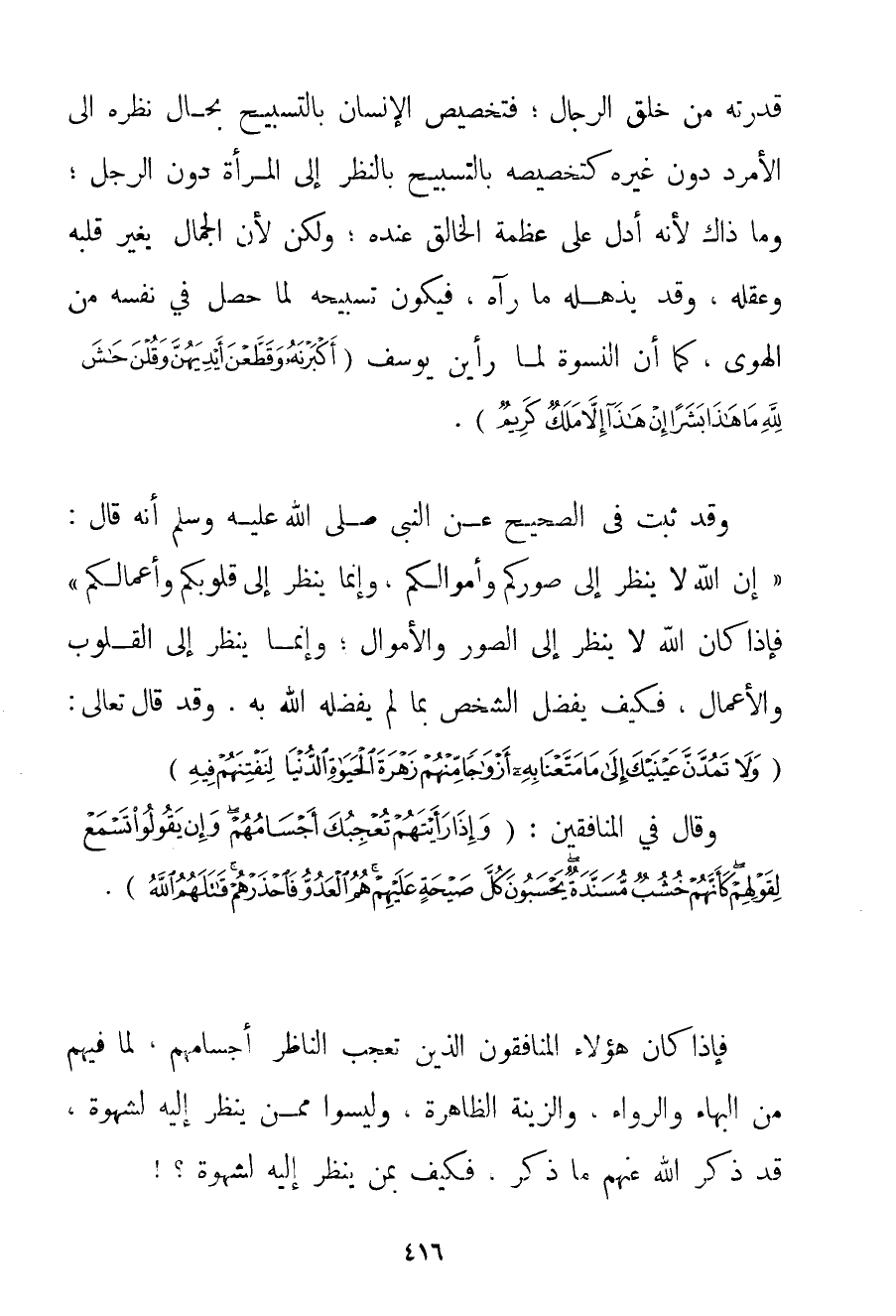 قُدْرَتِهِ مِنْ خَلْقِ الرِّجَالِ؛ فَتَخْصِيصُ الْإِنْسَانِ بِالتَّسْبِيحِ بِحَالِ نَظَرِهِ إلَى الْأَمْرَدِ دُونَ غَيْرِهِ كَتَخْصِيصِهِ بِالتَّسْبِيحِ بِالنَّظَرِ إلَى الْمَرْأَةِ دُونَ الرَّجُلِ؛ وَمَا ذَاكَ لِأَنَّهُ أَدَلُّ عَلَى عَظَمَةِ الْخَالِقِ عِنْدَهُ؛ وَلَكِنْ لِأَنَّ الْجَمَالَ يُغَيِّرُ قَلْبَهُ وَعَقْلَهُ وَقَدْ يُذْهِلُهُ مَا رَآهُ فَيَكُونُ تَسْبِيحُهُ لِمَا حَصَلَ فِي نَفْسِهِ مِنْ الْهَوَى كَمَا أَنَّ النِّسْوَةَ لَمَّا رَأَيْنَ يُوسُفَ {أَكْبَرْنَهُ وَقَطَّعْنَ أَيْدِيَهُنَّ وَقُلْنَ حَاشَ لِلَّهِ مَا هَذَا بَشَرًا إنْ هَذَا إلَّا مَلَكٌ كَرِيمٌ} . وَقَدْ ثَبَتَ فِي الصَّحِيحِ عَنْ النَّبِيِّ صَلَّى اللَّهُ عَلَيْهِ وَسَلَّمَ أَنَّهُ قَالَ: {إنَّ اللَّهَ لَا يَنْظُرُ إلَى صُوَرِكُمْ وَأَمْوَالِكُمْ وَإِنَّمَا يَنْظُرُ إلَى قُلُوبِكُمْ وَأَعْمَالِكُمْ} فَإِذَا كَانَ اللَّهُ لَا يَنْظُرُ إلَى الصُّوَرِ وَالْأَمْوَالِ؛ وَإِنَّمَا يَنْظُرُ إلَى الْقُلُوبِ وَالْأَعْمَالِ فَكَيْفَ يُفَضِّلُ الشَّخْصَ بِمَا لَمْ يُفَضِّلْهُ اللَّهُ بِهِ. وَقَدْ قَالَ تَعَالَى: {وَلَا تَمُدَّنَّ عَيْنَيْكَ إلَى مَا مَتَّعْنَا بِهِ أَزْوَاجًا مِنْهُمْ زَهْرَةَ الْحَيَاةِ الدُّنْيَا لِنَفْتِنَهُمْ فِيهِ} وَقَالَ فِي الْمُنَافِقِينَ: {وَإِذَا رَأَيْتَهُمْ تُعْجِبُكَ أَجْسَامُهُمْ وَإِنْ يَقُولُوا تَسْمَعْ لِقَوْلِهِمْ كَأَنَّهُمْ خُشُبٌ مُسَنَّدَةٌ يَحْسَبُونَ كُلَّ صَيْحَةٍ عَلَيْهِمْ هُمُ الْعَدُوُّ فَاحْذَرْهُمْ قَاتَلَهُمُ اللَّهُ} . فَإِذَا كَانَ هَؤُلَاءِ الْمُنَافِقُونَ الَّذِينَ تُعْجِبُ النَّاظِرَ أَجْسَامُهُمْ؛ لِمَا فِيهِمْ مِنْ الْبَهَاءِ وَالرُّوَاءِ وَالزِّينَةِ الظَّاهِرَةِ وَلَيْسُوا مِمَّنْ يُنْظَرُ إلَيْهِ لِشَهْوَةِ قَدْ ذَكَرَ اللَّهُ عَنْهُمْ مَا ذَكَرَ فَكَيْفَ بِمَنْ يُنْظَرُ إلَيْهِ لِشَهْوَةِ