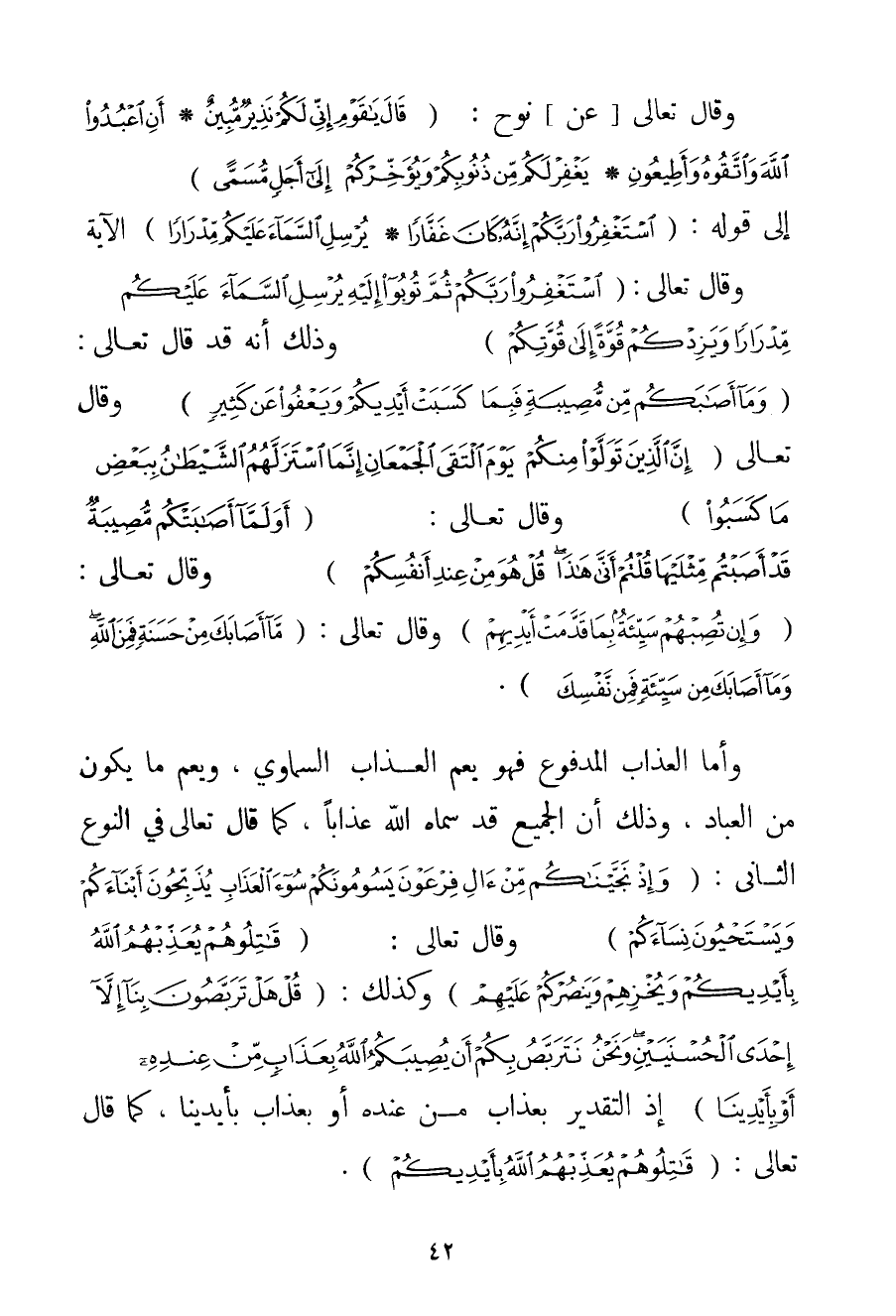 وَأَمَّا الْعَذَابُ الْمَدْفُوعُ فَهُوَ يَعُمُّ الْعَذَابَ السَّمَاوِيَّ وَيَعُمُّ مَا يَكُونُ مِنْ الْعِبَادِ وَذَلِكَ أَنَّ الْجَمِيعَ قَدْ سَمَّاهُ اللَّهُ عَذَابًا كَمَا قَالَ تَعَالَى فِي النَّوْعِ الثَّانِي: {وَإِذْ نَجَّيْنَاكُمْ مِنْ آلِ فِرْعَوْنَ يَسُومُونَكُمْ سُوءَ الْعَذَابِ يُذَبِّحُونَ أَبْنَاءَكُمْ وَيَسْتَحْيُونَ نِسَاءَكُمْ} وَقَالَ تَعَالَى: {قَاتِلُوهُمْ يُعَذِّبْهُمُ اللَّهُ بِأَيْدِيكُمْ وَيُخْزِهِمْ وَيَنْصُرْكُمْ عَلَيْهِمْ} وَكَذَلِكَ: {قُلْ هَلْ تَرَبَّصُونَ بِنَا إلَّا إحْدَى الْحُسْنَيَيْنِ وَنَحْنُ نَتَرَبَّصُ بِكُمْ أَنْ يُصِيبَكُمُ اللَّهُ بِعَذَابٍ مِنْ عِنْدِهِ أَوْ بِأَيْدِينَا} إذْ التَّقْدِيرُ بِعَذَابٍ مِنْ عِنْدِهِ أَوْ بِعَذَابٍ بِأَيْدِينَا كَمَا قَالَ تَعَالَى: {قَاتِلُوهُمْ يُعَذِّبْهُمُ اللَّهُ بِأَيْدِيكُمْ} .