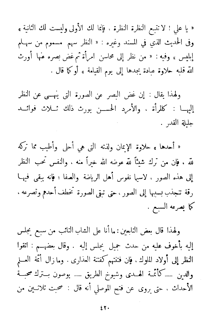 يَا عَلِيُّ لَا تُتْبِعْ النَّظْرَةَ النَّظْرَةَ فَإِنَّمَا لَك الْأُولَى وَلَيْسَتْ لَك الثَّانِيَةُ} وَفِي الْحَدِيثِ الَّذِي فِي الْمُسْنَدِ وَغَيْرِهِ: {النَّظَرُ سَهْمٌ مَسْمُومٌ مِنْ سِهَامِ إبْلِيسَ} وَفِيهِ: {مَنْ نَظَرَ إلَى مَحَاسِنِ امْرَأَةٍ ثُمَّ غَضَّ بَصَرَهُ عَنْهَا أَوْرَثَ اللَّهُ قَلْبَهُ حَلَاوَةَ عِبَادَةٍ يَجِدُهَا إلَى يَوْمِ الْقِيَامَةِ} أَوْ كَمَا قَالَ. وَلِهَذَا يُقَالُ: إنَّ غَضَّ الْبَصَرِ عَنْ الصُّورَةِ الَّتِي يُنْهَى عَنْ النَّظَرِ إلَيْهَا: كَالْمَرْأَةِ وَالْأَمْرَدِ الْحَسَنِ يُورِثُ ذَلِكَ ثَلَاثَ فَوَائِدَ جَلِيلَةِ الْقَدْرِ: