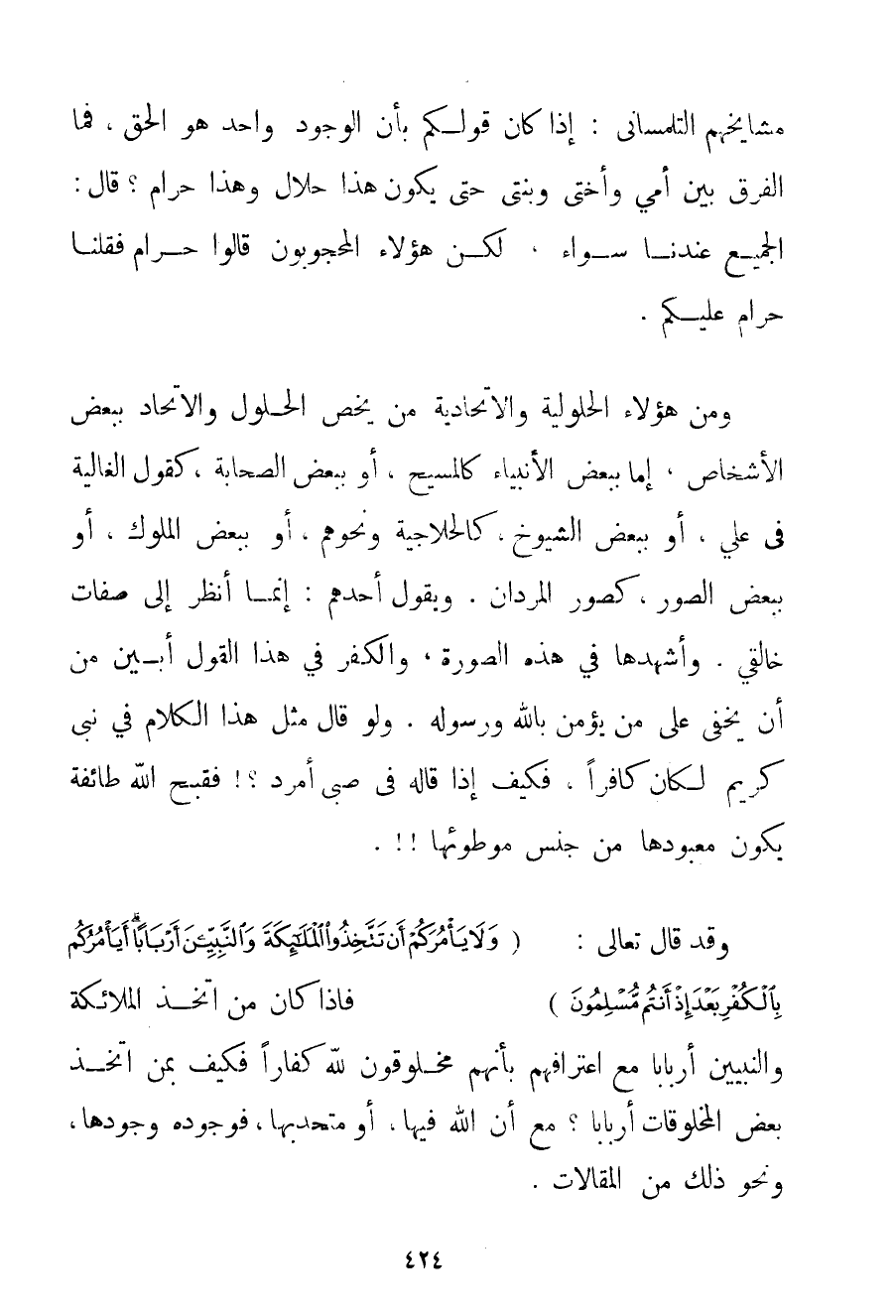مَشَايِخِهِمْ التلمساني: إذَا كَانَ قَوْلُكُمْ بِأَنَّ الْوُجُودَ وَاحِدٌ هُوَ الْحَقُّ فَمَا الْفَرْقُ بَيْنَ أُمِّي وَأُخْتِي وَبِنْتِي حَتَّى يَكُونَ هَذَا حَلَالٌ وَهَذَا حَرَامٌ؟ قَالَ: الْجَمِيعُ عِنْدَنَا سَوَاءٌ لَكِنَّ هَؤُلَاءِ الْمَحْجُوبُونَ قَالُوا حَرَامٌ فَقُلْنَا حَرَامٌ عَلَيْكُمْ. وَمِنْ هَؤُلَاءِ الْحُلُولِيَّةِ والاتحادية مَنْ يَخُصُّ الْحُلُولَ وَالِاتِّحَادَ بِبَعْضِ الْأَشْخَاصِ إمَّا بِبَعْضِ الْأَنْبِيَاءِ كَالْمَسِيحِ أَوْ بِبَعْضِ الصَّحَابَةِ كَقَوْلِ الْغَالِيَةِ فِي عَلِيٍّ أَوْ بِبَعْضِ الشُّيُوخِ كَالْحَلَّاجِيَّةِ وَنَحْوِهِمْ أَوْ بِبَعْضِ الْمُلُوكِ أَوْ بِبَعْضِ الصُّوَرِ كَصُوَرِ المردان. وَيَقُولُ أَحَدُهُمْ: إنَّمَا أَنْظُرُ إلَى صِفَاتِ خَالِقِي وَأَشْهَدُهَا فِي هَذِهِ الصُّورَةِ وَالْكُفْرُ فِي هَذَا الْقَوْلِ أَبْيَنُ مِنْ أَنْ يَخْفَى عَلَى مَنْ يُؤْمِنُ بِاَللَّهِ وَرَسُولِهِ. وَلَوْ قَالَ مِثْلَ هَذَا الْكَلَامِ فِي نَبِيٍّ كَرِيمٍ لَكَانَ كَافِرًا فَكَيْفَ إذَا قَالَهُ فِي صَبِيٍّ أَمْرَدَ فَقَبَّحَ اللَّهُ طَائِفَةً يَكُونُ مَعْبُودُهَا مِنْ جِنْسِ مَوْطُوئِهَا. وَقَدْ قَالَ تَعَالَى: {وَلَا يَأْمُرَكُمْ أَنْ تَتَّخِذُوا الْمَلَائِكَةَ وَالنَّبِيِّينَ أَرْبَابًا أَيَأْمُرُكُمْ بِالْكُفْرِ بَعْدَ إذْ أَنْتُمْ مُسْلِمُونَ} فَإِذَا كَانَ مَنْ اتَّخَذَ الْمَلَائِكَةَ وَالنَّبِيِّينَ أَرْبَابًا مَعَ اعْتِرَافِهِمْ بِأَنَّهُمْ مَخْلُوقُونَ لِلَّهِ كُفَّارًا فَكَيْفَ بِمَنْ اتَّخَذَ بَعْضَ الْمَخْلُوقَاتِ أَرْبَابًا؟ مَعَ أَنَّ اللَّهَ فِيهَا أَوْ مُتَّحِدٌ بِهَا فَوُجُودُهُ وُجُودُهَا وَنَحْوُ ذَلِكَ مِنْ الْمَقَالَاتِ.