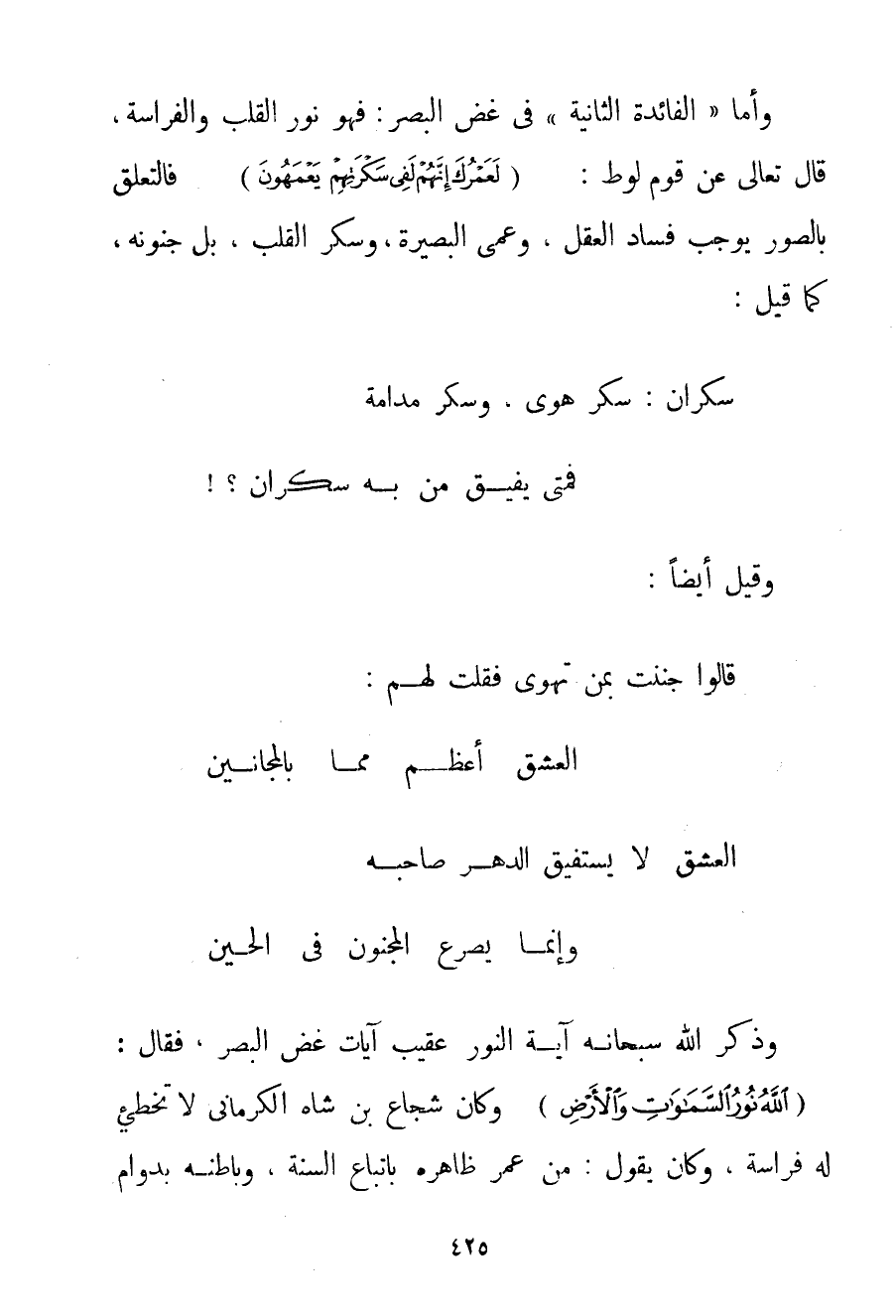 وَذَكَرَ اللَّهُ سُبْحَانَهُ آيَةَ النُّورِ عَقِيبَ آيَاتِ غَضِّ الْبَصَرِ فَقَالَ: {اللَّهُ نُورُ السَّمَاوَاتِ وَالْأَرْضِ} وَكَانَ شُجَاعُ بْنُ شَاهٍ الكرماني لَا تُخْطِئُ لَهُ فِرَاسَةٌ وَكَانَ يَقُولُ: مَنْ عَمَّرَ ظَاهِرَهُ بِاتِّبَاعِ السُّنَّةِ وَبَاطِنَهُ بِدَوَامِ