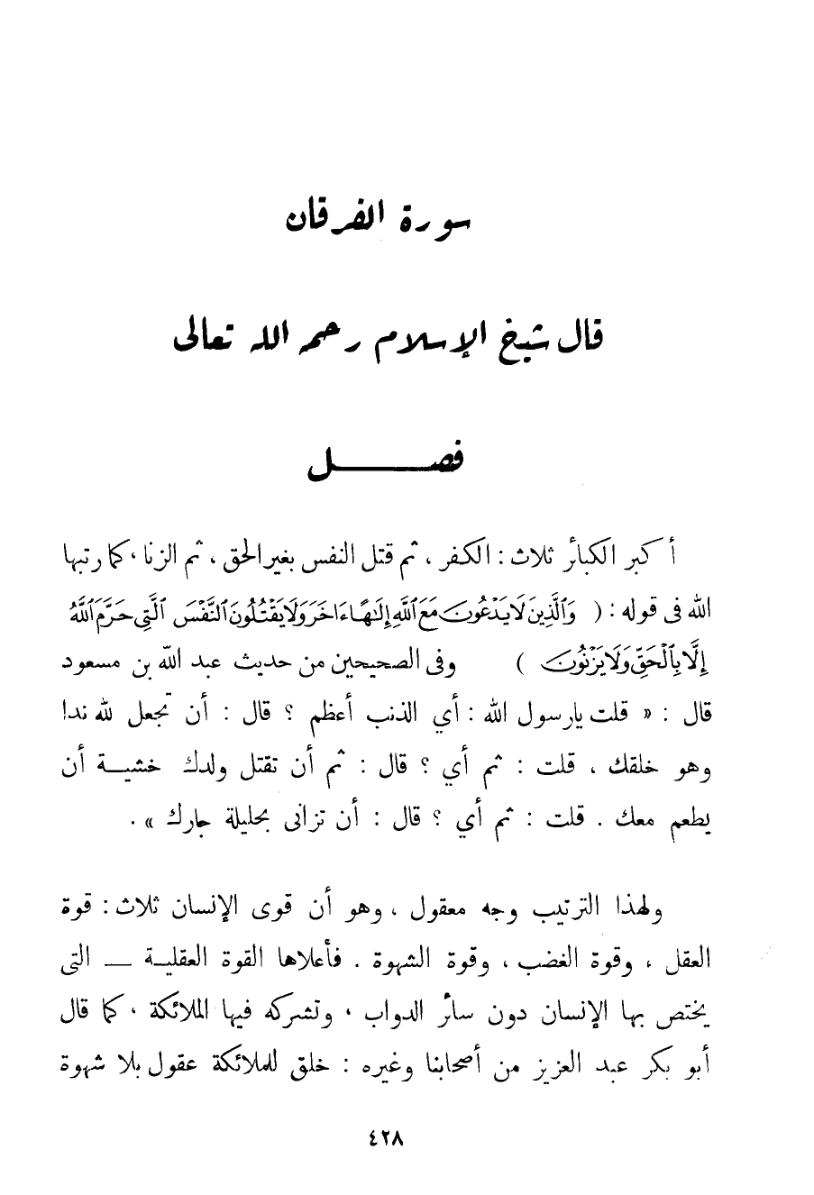 أَكْبَرُ الْكَبَائِرِ ثَلَاثٌ: الْكُفْرُ ثُمَّ قَتْلُ النَّفْسِ بِغَيْرِ الْحَقِّ ثُمَّ الزِّنَا كَمَا رَتَّبَهَا اللَّهُ فِي قَوْلِهِ: {وَالَّذِينَ لَا يَدْعُونَ مَعَ اللَّهِ إلَهًا آخَرَ وَلَا يَقْتُلُونَ النَّفْسَ الَّتِي حَرَّمَ اللَّهُ إلَّا بِالْحَقِّ وَلَا يَزْنُونَ} وَفِي الصَّحِيحَيْنِ مِنْ حَدِيثِ عَبْدِ اللَّهِ بْنِ مَسْعُودٍ قَالَ: {قُلْت يَا رَسُولَ اللَّهِ: أَيُّ الذَّنْبِ أَعْظَمُ؟ قَالَ: أَنْ تَجْعَلَ لِلَّهِ نِدًّا وَهُوَ خَلَقَك قُلْت: ثُمَّ أَيُّ؟ قَالَ: ثُمَّ أَنْ تَقْتُلَ وَلَدَك خَشْيَةَ أَنْ يَطْعَمَ مَعَك. قُلْت: ثُمَّ أَيُّ؟ قَالَ: أَنْ تُزَانِيَ بِحَلِيلَةِ جَارِك} .