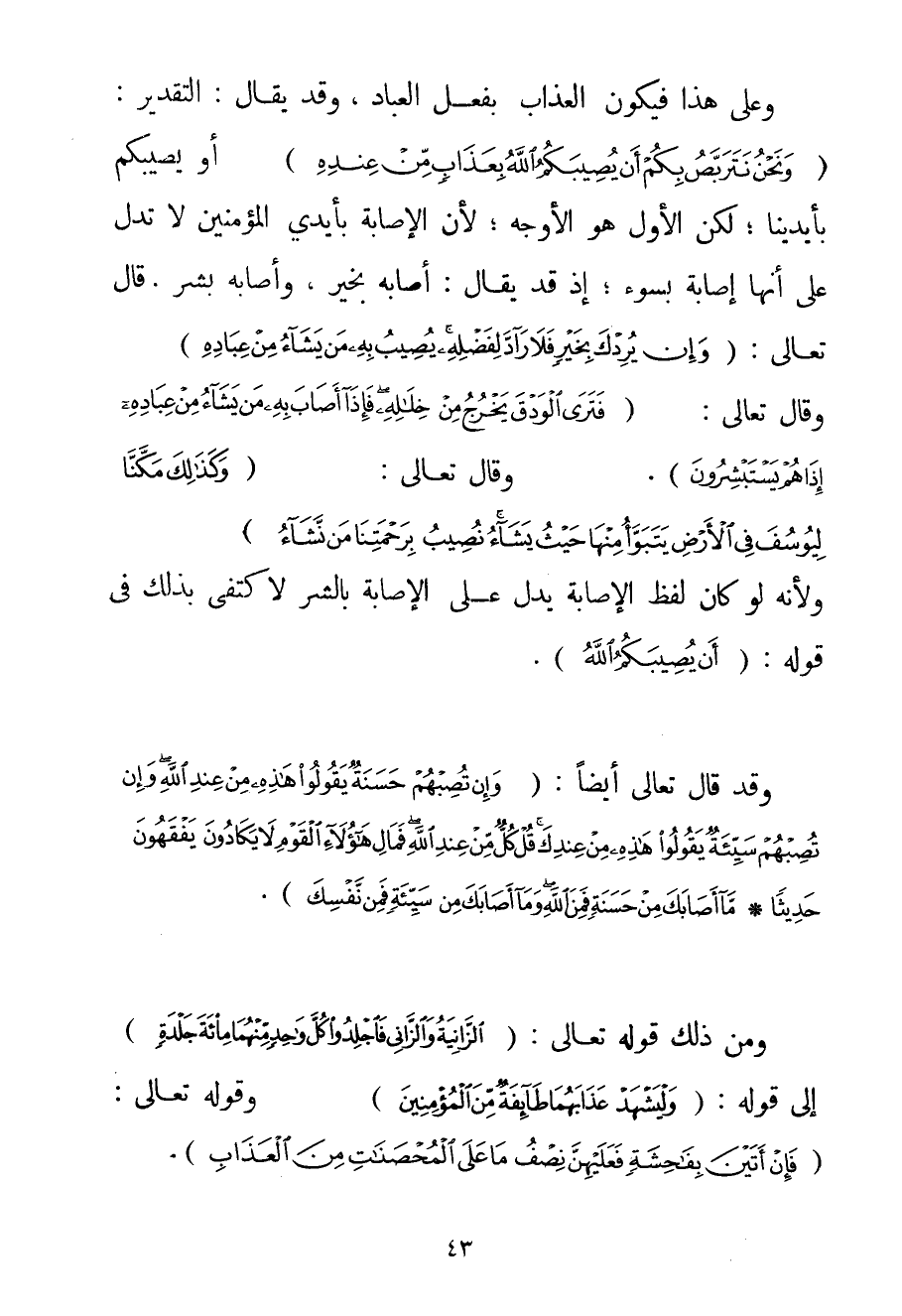 وَعَلَى هَذَا فَيَكُونُ الْعَذَابُ بِفِعْلِ الْعِبَادِ وَقَدْ يُقَالُ: التَّقْدِيرُ: {وَنَحْنُ نَتَرَبَّصُ بِكُمْ أَنْ يُصِيبَكُمُ اللَّهُ بِعَذَابٍ مِنْ عِنْدِهِ} أَوْ يُصِيبَكُمْ بِأَيْدِينَا؛ لَكِنَّ الْأَوَّلَ هُوَ الْأَوْجَهُ؛ لِأَنَّ الْإِصَابَةَ بِأَيْدِي الْمُؤْمِنِينَ لَا تَدُلُّ عَلَى أَنَّهَا إصَابَةٌ بِسُوءِ؛ إذْ قَدْ يُقَالُ: أَصَابَهُ بِخَيْرٍ وَأَصَابَهُ بِشَرِّ. قَالَ تَعَالَى: {وَإِنْ يُرِدْكَ بِخَيْرٍ فَلَا رَادَّ لِفَضْلِهِ يُصِيبُ بِهِ مَنْ يَشَاءُ مِنْ عِبَادِهِ} وَقَالَ تَعَالَى: {فَتَرَى الْوَدْقَ يَخْرُجُ مِنْ خِلَالِهِ فَإِذَا أَصَابَ بِهِ مَنْ يَشَاءُ مِنْ عِبَادِهِ إذَا هُمْ يَسْتَبْشِرُونَ} . وَقَالَ تَعَالَى: {وَكَذَلِكَ مَكَّنَّا لِيُوسُفَ فِي الْأَرْضِ يَتَبَوَّأُ مِنْهَا حَيْثُ يَشَاءُ نُصِيبُ بِرَحْمَتِنَا مَنْ نَشَاءُ} وَلِأَنَّهُ لَوْ كَانَ لَفْظُ الْإِصَابَةِ يَدُلُّ عَلَى الْإِصَابَةِ بِالشَّرِّ لَاكْتَفَى بِذَلِكَ فِي قَوْلِهِ: {أَنْ يُصِيبَكُمُ اللَّهُ} . وَقَدْ قَالَ تَعَالَى أَيْضًا: {وَإِنْ تُصِبْهُمْ حَسَنَةٌ يَقُولُوا هَذِهِ مِنْ عِنْدِ اللَّهِ وَإِنْ تُصِبْهُمْ سَيِّئَةٌ يَقُولُوا هَذِهِ مِنْ عِنْدِكَ قُلْ كُلٌّ مِنْ عِنْدِ اللَّهِ فَمَالِ هَؤُلَاءِ الْقَوْمِ لَا يَكَادُونَ يَفْقَهُونَ حَدِيثًا} {مَا أَصَابَكَ مِنْ حَسَنَةٍ فَمِنَ اللَّهِ وَمَا أَصَابَكَ مِنْ سَيِّئَةٍ فَمِنْ نَفْسِكَ} . وَمِنْ ذَلِكَ قَوْله تَعَالَى {الزَّانِيَةُ وَالزَّانِي فَاجْلِدُوا كُلَّ وَاحِدٍ مِنْهُمَا مِائَةَ جَلْدَةٍ} إلَى قَوْلِهِ: {وَلْيَشْهَدْ عَذَابَهُمَا طَائِفَةٌ مِنَ الْمُؤْمِنِينَ} وقَوْله تَعَالَى {فَإِنْ أَتَيْنَ بِفَاحِشَةٍ فَعَلَيْهِنَّ نِصْفُ مَا عَلَى الْمُحْصَنَاتِ مِنَ الْعَذَابِ} .