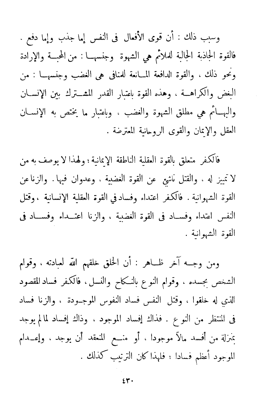 وَسَبَبُ ذَلِكَ: أَنَّ قُوَى الْأَفْعَالِ فِي النَّفْسِ إمَّا جَذْبٌ وَإِمَّا دَفْعٌ فَالْقُوَّةُ الْجَاذِبَةُ الْجَالِبَةُ لِلْمُلَائِمِ هِيَ الشَّهْوَةُ وَجِنْسُهَا: مِنْ الْمَحَبَّةِ وَالْإِرَادَةِ وَنَحْوِ ذَلِكَ وَالْقُوَّةُ الدَّافِعَةُ الْمَانِعَةُ لِلْمُنَافِي هِيَ الْغَضَبُ وَجِنْسُهَا: مِنْ الْبُغْضِ وَالْكَرَاهَةِ وَهَذِهِ الْقُوَّةُ بِاعْتِبَارِ الْقَدْرِ الْمُشْتَرَكِ بَيْنَ الْإِنْسَانِ وَالْبَهَائِمِ هِيَ مُطْلَقُ الشَّهْوَةِ وَالْغَضَبِ وَبِاعْتِبَارِ مَا يَخْتَصُّ بِهِ الْإِنْسَانُ الْعَقْلُ وَالْإِيمَانُ وَالْقُوَى الرُّوحَانِيَّةُ الْمُعْتَرِضَةُ. فَالْكُفْرُ مُتَعَلِّقٌ بِالْقُوَّةِ الْعَقْلِيَّةِ النَّاطِقَةِ الْإِيمَانِيَّةِ؛ وَلِهَذَا لَا يُوصَفُ بِهِ مَنْ لَا تَمْيِيزَ لَهُ وَالْقَتْلُ نَاشِئٌ عَنْ الْقُوَّةِ الْغَضَبِيَّةِ وَعُدْوَانٍ فِيهَا. وَالزِّنَا عَنْ الْقُوَّةِ الشَّهْوَانِيَّةِ. فَالْكُفْرُ اعْتِدَاءٌ وَفَسَادٌ فِي الْقُوَّةِ الْعَقْلِيَّةِ الْإِنْسَانِيَّةِ وَقَتْلُ النَّفْسِ اعْتِدَاءٌ وَفَسَادٌ فِي الْقُوَّةِ الْغَضَبِيَّةِ وَالزِّنَا اعْتِدَاءٌ وَفَسَادٌ فِي الْقُوَّةِ الشَّهْوَانِيَّةِ. وَمِنْ وَجْهٍ آخَرَ ظَاهِرٍ: أَنَّ الْخَلْقَ خَلَقَهُمْ اللَّهُ لِعِبَادَتِهِ وَقِوَامُ الشَّخْصِ بِجَسَدِهِ وَقِوَامُ النَّوْعِ بِالنِّكَاحِ وَالنَّسْلِ فَالْكُفْرُ فَسَادُ الْمَقْصُودِ الَّذِي لَهُ خُلِقُوا وَقَتْلُ النَّفْسِ فَسَادُ النُّفُوسِ الْمَوْجُودَةِ وَالزِّنَا فَسَادٌ فِي الْمُنْتَظَرِ مِنْ النَّوْعِ. فَذَاكَ إفْسَادُ الْمَوْجُودِ وَذَاكَ إفْسَادٌ لِمَا لَمْ يُوجَدْ بِمَنْزِلَةِ مَنْ أَفْسَدَ مَالًا مَوْجُودًا أَوْ مَنَعَ الْمُنْعَقِدَ أَنْ يُوجَدَ وَإِعْدَامُ الْمَوْجُودِ أَعْظَمُ فَسَادًا؛ فَلِهَذَا كَانَ التَّرْتِيبُ كَذَلِكَ. وَمِنْ