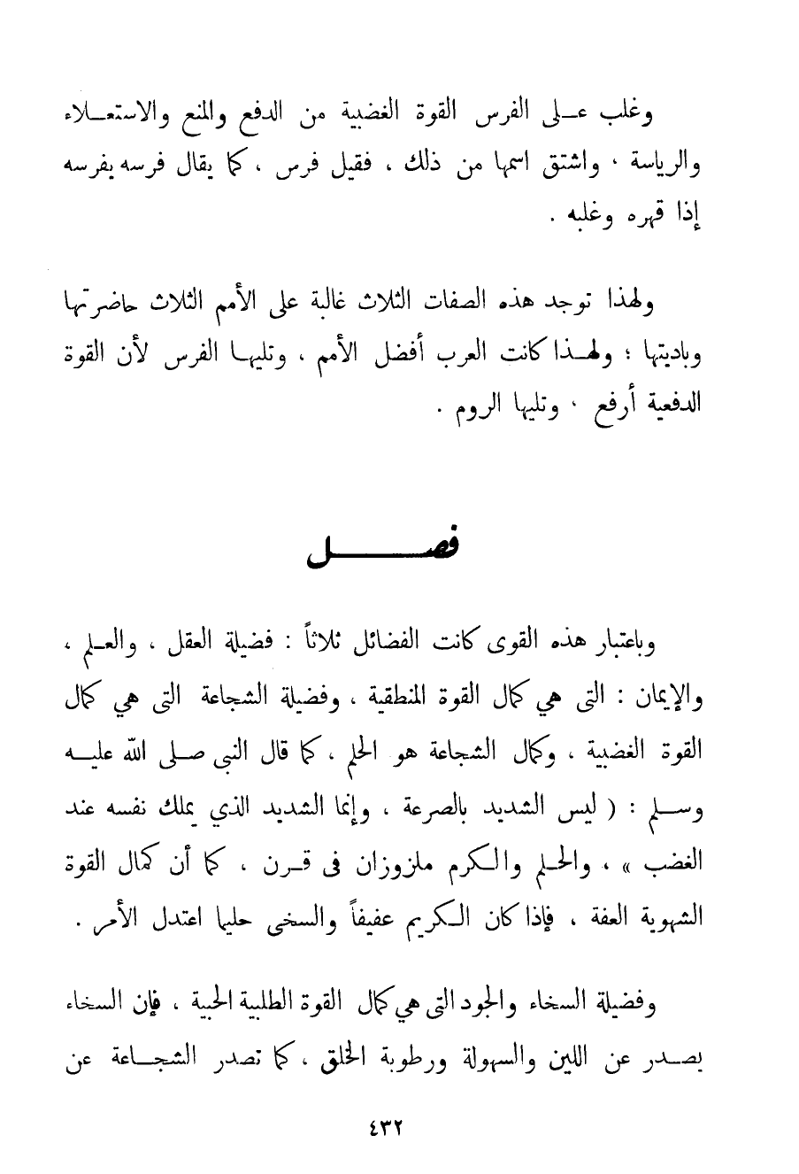 وَبِاعْتِبَارِ هَذِهِ الْقُوَى كَانَتْ الْفَضَائِلُ ثَلَاثًا: فَضِيلَةُ الْعَقْلِ وَالْعِلْمِ وَالْإِيمَانِ: الَّتِي هِيَ كَمَالُ الْقُوَّةِ الْمَنْطِقِيَّةِ وَفَضِيلَةُ الشَّجَاعَةِ الَّتِي هِيَ كَمَالُ الْقُوَّةِ الْغَضَبِيَّةِ وَكَمَالُ الشَّجَاعَةِ هُوَ الْحِلْمُ كَمَا قَالَ النَّبِيُّ صَلَّى اللَّهُ عَلَيْهِ وَسَلَّمَ {لَيْسَ الشَّدِيدُ بِالصُّرْعَةِ وَإِنَّمَا الشَّدِيدُ الَّذِي يَمْلِكُ نَفْسَهُ عِنْدَ الْغَضَبِ} وَالْحِلْمُ وَالْكَرَمُ مَلْزُوزَانِ فِي قَرْنٍ كَمَا أَنَّ كَمَالَ الْقُوَّةِ الشهوية الْعِفَّةُ فَإِذَا كَانَ الْكَرِيمُ عَفِيفًا وَالسَّخِيُّ حَلِيمًا اعْتَدَلَ الْأَمْرُ. وَفَضِيلَةُ السَّخَاءِ وَالْجُودِ الَّتِي هِيَ كَمَالُ الْقُوَّةِ الطَّلَبِيَّةِ الحبية فَإِنَّ السَّخَاءَ يَصْدُرُ عَنْ اللِّينِ وَالسُّهُولَةِ وَرُطُوبَةِ الْخُلُقِ كَمَا تَصْدُرُ الشَّجَاعَةُ عَنْ