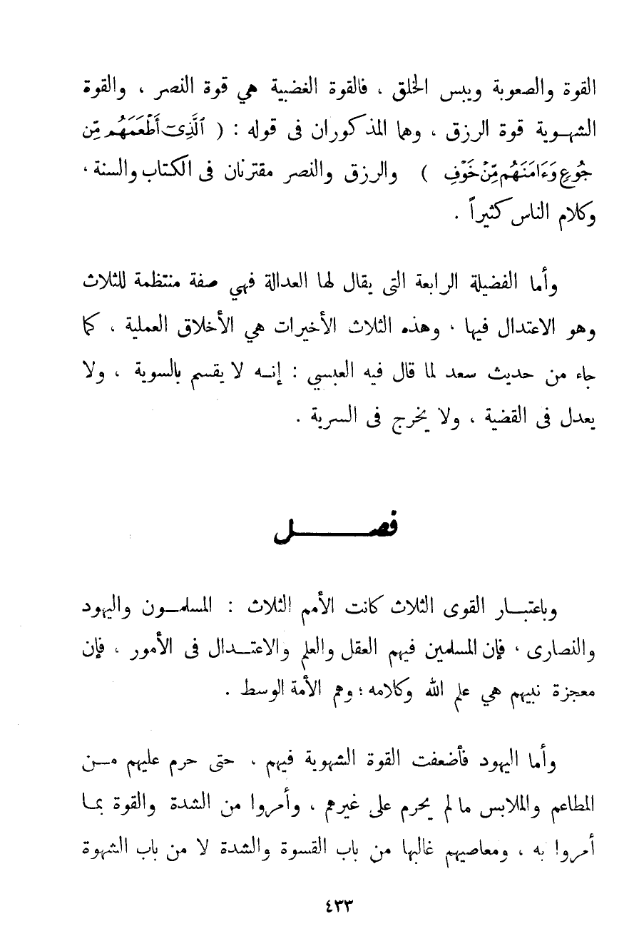 وَبِاعْتِبَارِ الْقُوَى الثَّلَاثِ كَانَتْ الْأُمَمُ الثَّلَاثُ: الْمُسْلِمُونَ وَالْيَهُودُ وَالنَّصَارَى فَإِنَّ الْمُسْلِمِينَ فِيهِمْ الْعَقْلُ وَالْعِلْمُ وَالِاعْتِدَالُ فِي الْأُمُورِ فَإِنَّ مُعْجِزَةَ نَبِيِّهِمْ هِيَ عِلْمُ اللَّهِ وَكَلَامُهُ؛ وَهُمْ الْأُمَّةُ الْوَسَطُ. وَأَمَّا الْيَهُودُ فَأُضْعِفَتْ الْقُوَّةُ الشهوية فِيهِمْ حَتَّى حَرُمَ عَلَيْهِمْ مِنْ الْمَطَاعِمِ وَالْمَلَابِسِ مَا لَمْ يُحَرَّمْ عَلَى غَيْرِهِمْ وَأُمِرُوا مِنْ الشِّدَّةِ وَالْقُوَّةِ بِمَا أُمِرُوا بِهِ وَمَعَاصِيهِمْ غَالِبُهَا مِنْ بَابِ الْقَسْوَةِ وَالشِّدَّةِ لَا مِنْ بَابِ الشَّهْوَةِ