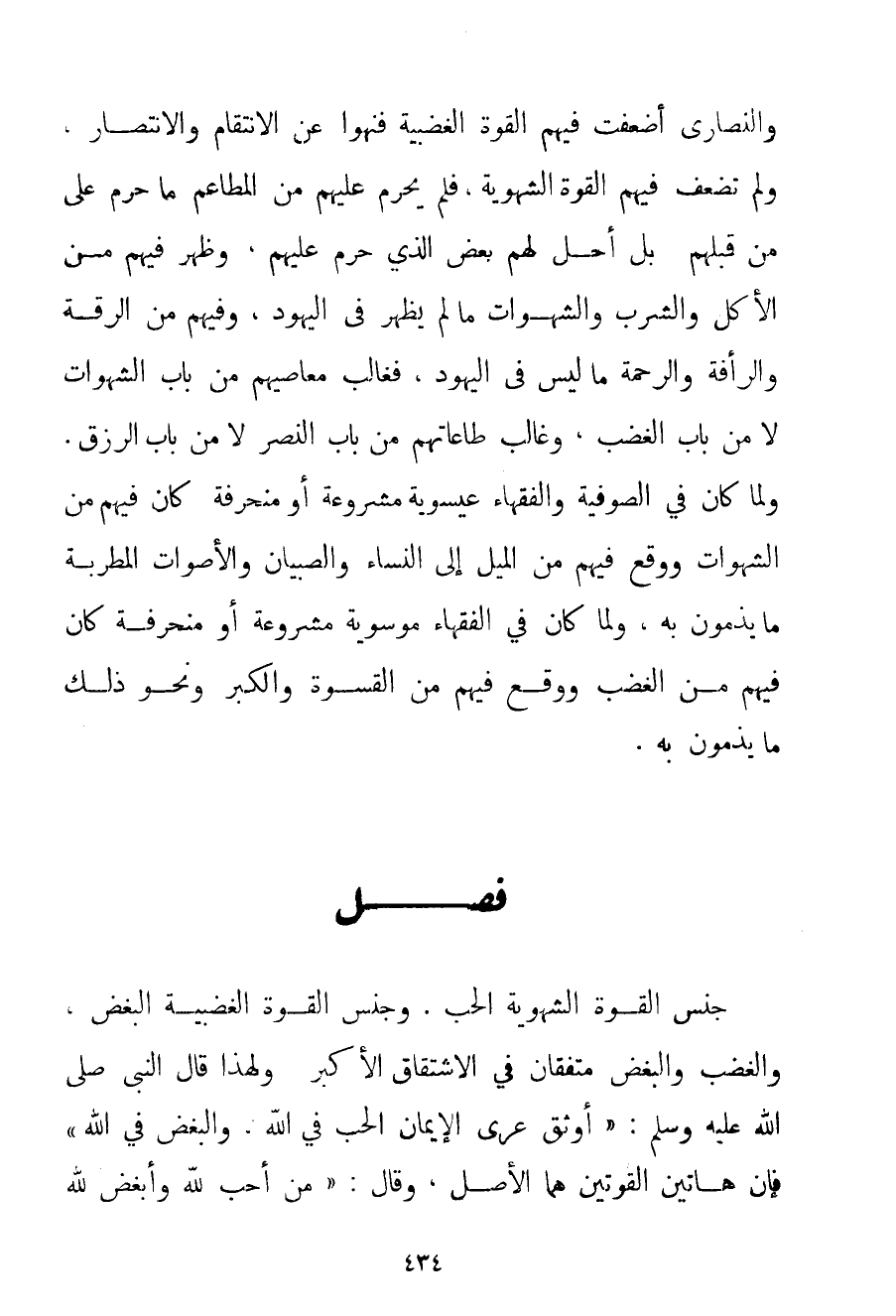 جِنْسُ الْقُوَّةِ الشهوية الْحُبُّ، وَجِنْسُ الْقُوَّةِ الْغَضَبِيَّةِ الْبُغْضُ وَالْغَضَبُ وَالْبُغْضُ مُتَّفِقَانِ فِي الِاشْتِقَاقِ الْأَكْبَرِ وَلِهَذَا قَالَ النَّبِيُّ صَلَّى اللَّهُ عَلَيْهِ وَسَلَّمَ {أَوْثَقُ عُرَى الْإِيمَانِ الْحُبُّ فِي اللَّهِ وَالْبُغْضُ فِي اللَّهِ} فَإِنَّ هَاتَيْنِ الْقُوَّتَيْنِ هَمَّا الْأَصْلُ وَقَالَ: {مَنْ أَحَبَّ لِلَّهِ وَأَبْغَضَ لِلَّهِ