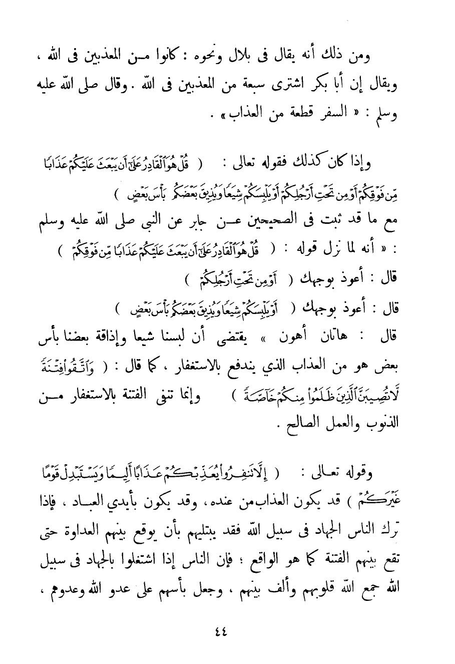 وَمِنْ ذَلِكَ أَنَّهُ يُقَالُ فِي بِلَالٍ وَنَحْوِهِ: كَانُوا مِنْ الْمُعَذَّبِينَ فِي اللَّهِ وَيُقَالُ إنَّ أَبَا بَكْرٍ اشْتَرَى سَبْعَةً مِنْ الْمُعَذَّبِينَ فِي اللَّهِ. وَقَالَ صَلَّى اللَّهُ عَلَيْهِ وَسَلَّمَ " {السَّفَرُ قِطْعَةٌ مِنْ الْعَذَابِ} ". وَإِذَا كَانَ كَذَلِكَ فَقَوْلُهُ تَعَالَى: {قُلْ هُوَ الْقَادِرُ عَلَى أَنْ يَبْعَثَ عَلَيْكُمْ عَذَابًا مِنْ فَوْقِكُمْ أَوْ مِنْ تَحْتِ أَرْجُلِكُمْ أَوْ يَلْبِسَكُمْ شِيَعًا وَيُذِيقَ بَعْضَكُمْ بَأْسَ بَعْضٍ} مَعَ مَا قَدْ ثَبَتَ فِي الصَّحِيحَيْنِ عَنْ جَابِرٍ عَنْ النَّبِيِّ صَلَّى اللَّهُ عَلَيْهِ وَسَلَّمَ " {أَنَّهُ لَمَّا نَزَلَ قَوْلُهُ: {قُلْ هُوَ الْقَادِرُ عَلَى أَنْ يَبْعَثَ عَلَيْكُمْ عَذَابًا مِنْ فَوْقِكُمْ} قَالَ: أَعُوذُ بِوَجْهِك {أَوْ مِنْ تَحْتِ أَرْجُلِكُمْ} قَالَ: أَعُوذُ بِوَجْهِك {أَوْ يَلْبِسَكُمْ شِيَعًا وَيُذِيقَ بَعْضَكُمْ بَأْسَ بَعْضٍ} قَالَ: هَاتَانِ أَهْوَنُ} " يَقْتَضِي أَنَّ لُبْسَنَا شِيَعًا وَإِذَاقَةَ بَعْضِنَا بَأْسَ بَعْضٍ هُوَ مِنْ الْعَذَابِ الَّذِي يَنْدَفِعُ بِالِاسْتِغْفَارِ كَمَا قَالَ: {وَاتَّقُوا فِتْنَةً لَا تُصِيبَنَّ الَّذِينَ ظَلَمُوا مِنْكُمْ خَاصَّةً} وَإِنَّمَا تُنْفَى الْفِتْنَةُ بِالِاسْتِغْفَارِ مِنْ الذُّنُوبِ وَالْعَمَلِ الصَّالِحِ. وقَوْله تَعَالَى {إلَّا تَنْفِرُوا يُعَذِّبْكُمْ عَذَابًا أَلِيمًا وَيَسْتَبْدِلْ قَوْمًا غَيْرَكُمْ} قَدْ يَكُونُ الْعَذَابُ مِنْ عِنْدِهِ وَقَدْ يَكُونُ بِأَيْدِي الْعِبَادِ فَإِذَا تَرَكَ النَّاسُ الْجِهَادَ فِي سَبِيلِ اللَّهِ فَقَدْ يَبْتَلِيهِمْ بِأَنْ يُوقِعَ بَيْنَهُمْ الْعَدَاوَةَ حَتَّى تَقَعَ بَيْنَهُمْ الْفِتْنَةُ كَمَا هُوَ الْوَاقِعُ؛ فَإِنَّ النَّاسَ إذَا اشْتَغَلُوا بِالْجِهَادِ فِي سَبِيلِ اللَّهِ جَمَعَ اللَّهُ قُلُوبَهُمْ وَأَلَّفَ بَيْنَهُمْ وَجَعَلَ بَأْسَهُمْ عَلَى عَدُوِّ اللَّهِ وَعَدُوِّهِمْ