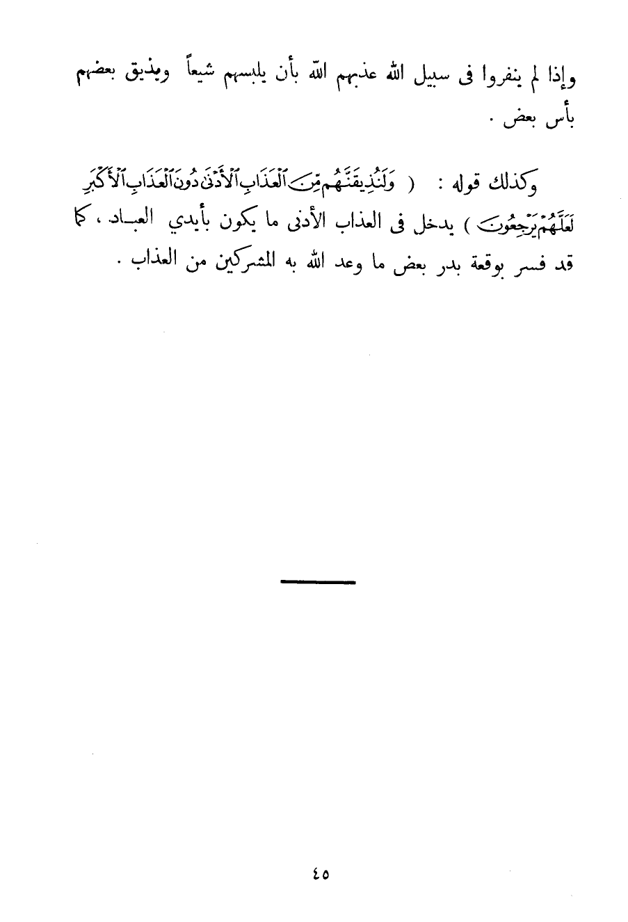 وَإِذَا لَمْ يَنْفِرُوا فِي سَبِيلِ اللَّهِ عَذَّبَهُمْ اللَّهُ بِأَنْ يُلْبِسَهُمْ شِيَعًا وَيُذِيقَ بَعْضَهُمْ بَأْسَ بَعْضٍ. وَكَذَلِكَ قَوْلُهُ: {وَلَنُذِيقَنَّهُمْ مِنَ الْعَذَابِ الْأَدْنَى دُونَ الْعَذَابِ الْأَكْبَرِ لَعَلَّهُمْ يَرْجِعُونَ} يَدْخُلُ فِي الْعَذَابِ الْأَدْنَى مَا يَكُونُ بِأَيْدِي الْعِبَادِ كَمَا قَدْ فُسِّرَ بِوَقْعَةِ بَدْرٍ بَعْضُ مَا وَعَدَ اللَّهُ بِهِ الْمُشْرِكِينَ مِنْ الْعَذَابِ.