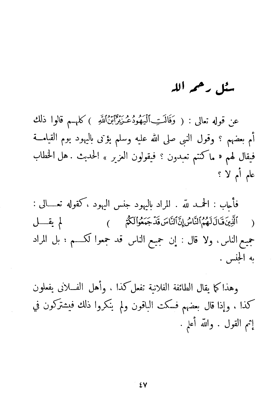 عَنْ قَوْله تَعَالَى {وَقَالَتِ الْيَهُودُ عُزَيْرٌ ابْنُ اللَّهِ} كُلُّهُمْ قَالُوا ذَلِكَ أَمْ بَعْضُهُمْ؟ {وَقَوْلِ النَّبِيِّ صَلَّى اللَّهُ عَلَيْهِ وَسَلَّمَ يُؤْتَى بِالْيَهُودِ يَوْمَ الْقِيَامَةِ فَيُقَالُ لَهُمْ مَا كُنْتُمْ تَعْبُدُونَ؟ فَيَقُولُونَ الْعُزَيْرُ} الْحَدِيثُ. هَلْ الْخِطَابُ عَامٌّ أَمْ لَا؟ .