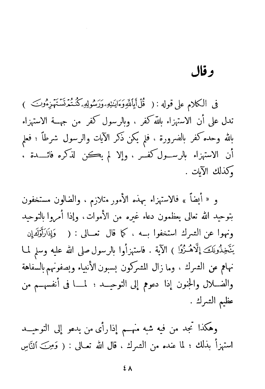 فِي الْكَلَامِ عَلَى قَوْلِهِ: {قُلْ أَبِاللَّهِ وَآيَاتِهِ وَرَسُولِهِ كُنْتُمْ تَسْتَهْزِئُونَ} تَدُلُّ عَلَى أَنَّ الِاسْتِهْزَاءَ بِاَللَّهِ كُفْرٌ وَبِالرَّسُولِ كُفْرٌ مِنْ جِهَةِ الِاسْتِهْزَاءِ بِاَللَّهِ وَحْدَهُ كُفْرٌ بِالضَّرُورَةِ فَلَمْ يَكُنْ ذِكْرُ الْآيَاتِ وَالرَّسُولِ شَرْطًا؛ فَعُلِمَ أَنَّ الِاسْتِهْزَاءَ بِالرَّسُولِ كُفْرٌ وَإِلَّا لَمْ يَكُنْ لِذِكْرِهِ فَائِدَةٌ وَكَذَلِكَ الْآيَاتُ. و " أَيْضًا " فَالِاسْتِهْزَاءُ بِهَذِهِ الْأُمُورِ مُتَلَازِمٌ وَالضَّالُّونَ مُسْتَخِفُّونَ بِتَوْحِيدِ اللَّهِ تَعَالَى يُعَظِّمُونَ دُعَاءَ غَيْرِهِ مِنْ الْأَمْوَاتِ وَإِذَا أُمِرُوا بِالتَّوْحِيدِ وَنُهُوا عَنْ الشِّرْكِ اسْتَخَفُّوا بِهِ كَمَا قَالَ تَعَالَى: {وَإِذَا رَأَوْكَ إنْ يَتَّخِذُونَكَ إلَّا هُزُوًا} الْآيَةُ. فَاسْتَهْزَءُوا بِالرَّسُولِ صَلَّى اللَّهُ عَلَيْهِ وَسَلَّمَ لَمَّا نَهَاهُمْ عَنْ الشِّرْكِ وَمَا زَالَ الْمُشْرِكُونَ يَسُبُّونَ الْأَنْبِيَاءَ وَيَصِفُونَهُمْ بِالسَّفَاهَةِ وَالضَّلَالِ وَالْجُنُونِ إذَا دَعَوْهُمْ إلَى التَّوْحِيدِ؛ لِمَا فِي أَنْفُسِهِمْ مِنْ عَظِيمِ الشِّرْكِ. وَهَكَذَا تَجِدُ مَنْ فِيهِ شَبَهٌ مِنْهُمْ إذَا رَأَى مَنْ يَدْعُو إلَى التَّوْحِيدِ اسْتَهْزَأَ بِذَلِكَ؛ لِمَا عِنْدَهُ مِنْ الشِّرْكِ قَالَ اللَّهُ تَعَالَى: {وَمِنَ النَّاسِ