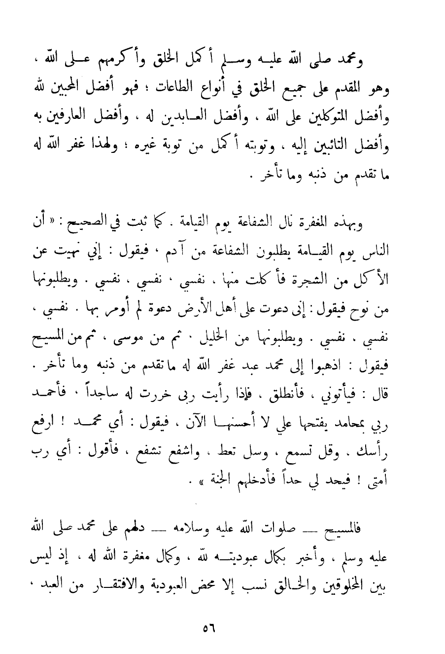وَمُحَمَّدٌ صَلَّى اللَّهُ عَلَيْهِ وَسَلَّمَ أَكْمَلُ الْخَلْقِ وَأَكْرَمُهُمْ عَلَى اللَّهِ وَهُوَ الْمُقَدَّمُ عَلَى جَمِيعِ الْخَلْقِ فِي أَنْوَاعِ الطَّاعَاتِ؛ فَهُوَ أَفْضَلُ الْمُحِبِّينَ لِلَّهِ وَأَفْضَلُ الْمُتَوَكِّلِينَ عَلَى اللَّهِ وَأَفْضَلُ الْعَابِدِينَ لَهُ وَأَفْضَلُ الْعَارِفِينَ بِهِ وَأَفْضَلُ التَّائِبِينَ إلَيْهِ وَتَوْبَتُهُ أَكْمَلُ مِنْ تَوْبَةِ غَيْرِهِ؛ وَلِهَذَا غَفَرَ اللَّهُ لَهُ مَا تَقَدَّمَ مِنْ ذَنْبِهِ وَمَا تَأَخَّرَ. وَبِهَذِهِ الْمَغْفِرَةِ نَالَ الشَّفَاعَةَ يَوْمَ الْقِيَامَةِ كَمَا ثَبَتَ فِي الصَّحِيحِ: " {أَنَّ النَّاسَ يَوْمَ الْقِيَامَةِ يَطْلُبُونَ الشَّفَاعَةَ مِنْ آدَمَ فَيَقُولُ: إنِّي نُهِيت عَنْ الْأَكْلِ مِنْ الشَّجَرَةِ فَأَكَلْت مِنْهَا نَفْسِي نَفْسِي نَفْسِي. وَيَطْلُبُونَهَا مِنْ نُوحٍ فَيَقُولُ: إنِّي دَعَوْت عَلَى أَهْلِ الْأَرْضِ دَعْوَةً لَمْ أومر بِهَا. نَفْسِي نَفْسِي نَفْسِي. وَيَطْلُبُونَهَا مِنْ الْخَلِيلِ ثُمَّ مِنْ مُوسَى ثُمَّ مِنْ الْمَسِيحِ فَيَقُولُ: اذْهَبُوا إلَى مُحَمَّدٍ عَبْدٍ غَفَرَ اللَّهُ لَهُ مَا تَقَدَّمَ مِنْ ذَنْبِهِ وَمَا تَأَخَّرَ. قَالَ: فَيَأْتُونِي فَأَنْطَلِقُ فَإِذَا رَأَيْت رَبِّي خَرَرْت لَهُ سَاجِدًا فَأَحْمَدُ رَبِّي بِمَحَامِدَ يَفْتَحُهَا عَلَيَّ لَا أُحْسِنُهَا الْآنَ فَيَقُولُ: أَيْ مُحَمَّدُ ارْفَعْ رَأْسَك وَقُلْ تُسْمَعْ وَسَلْ تُعْطَ وَاشْفَعْ تُشَفَّعْ فَأَقُولُ: أَيْ رَبِّ أُمَّتِي فَيَحِدُّ لِي حَدًّا فَأُدْخِلُهُمْ الْجَنَّةَ} ". فَالْمَسِيحُ - صَلَوَاتُ اللَّهِ عَلَيْهِ وَسَلَامُهُ - دَلَّهُمْ عَلَى مُحَمَّدٍ صَلَّى اللَّهُ عَلَيْهِ وَسَلَّمَ وَأَخْبَرَ بِكَمَالِ عُبُودِيَّتِهِ لِلَّهِ وَكَمَالِ مَغْفِرَةِ اللَّهِ لَهُ إذْ لَيْسَ بَيْنَ الْمَخْلُوفَيْنِ وَالْخَالِقِ نَسَبٌ إلَّا مَحْضُ الْعُبُودِيَّةِ وَالِافْتِقَارِ مِنْ الْعَبْدِ